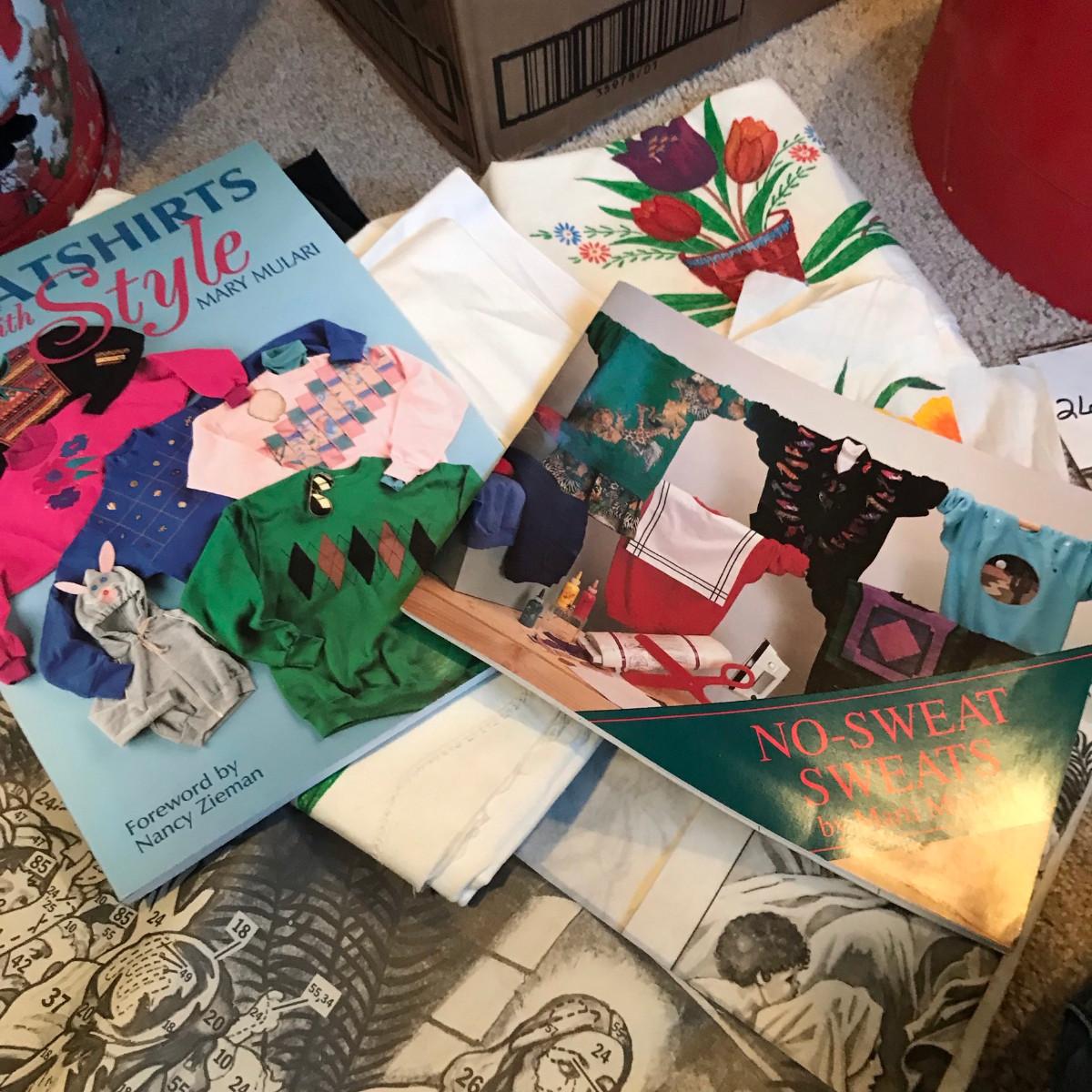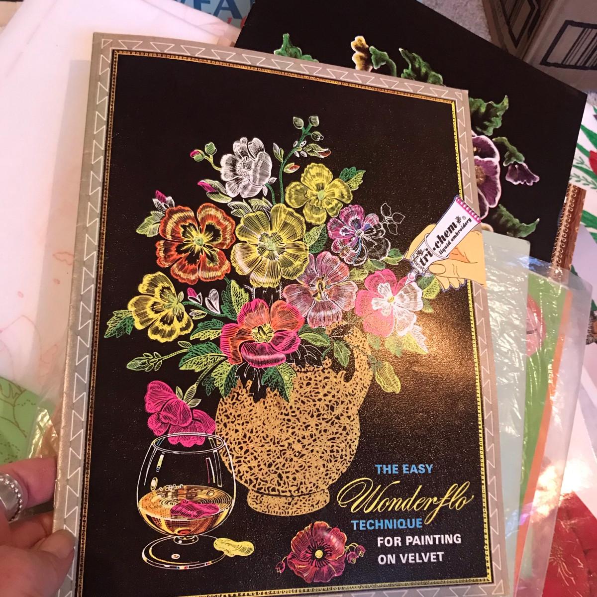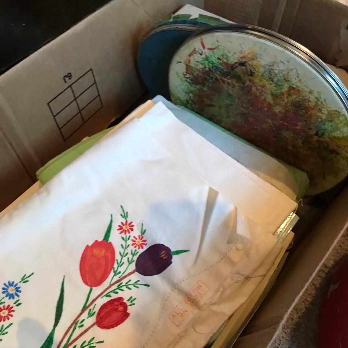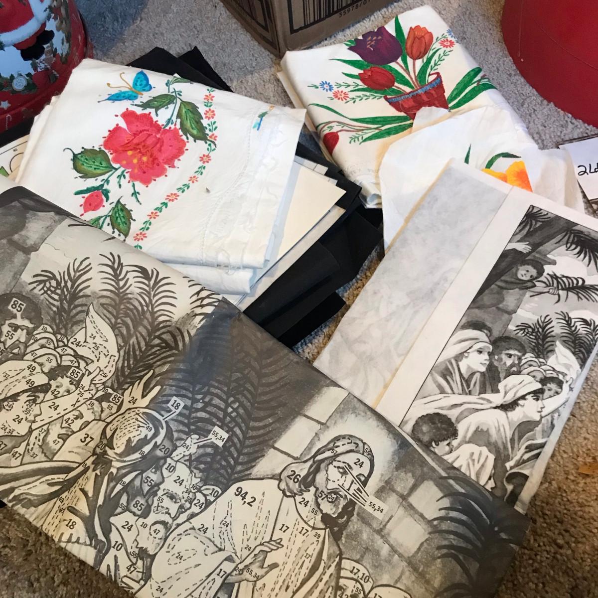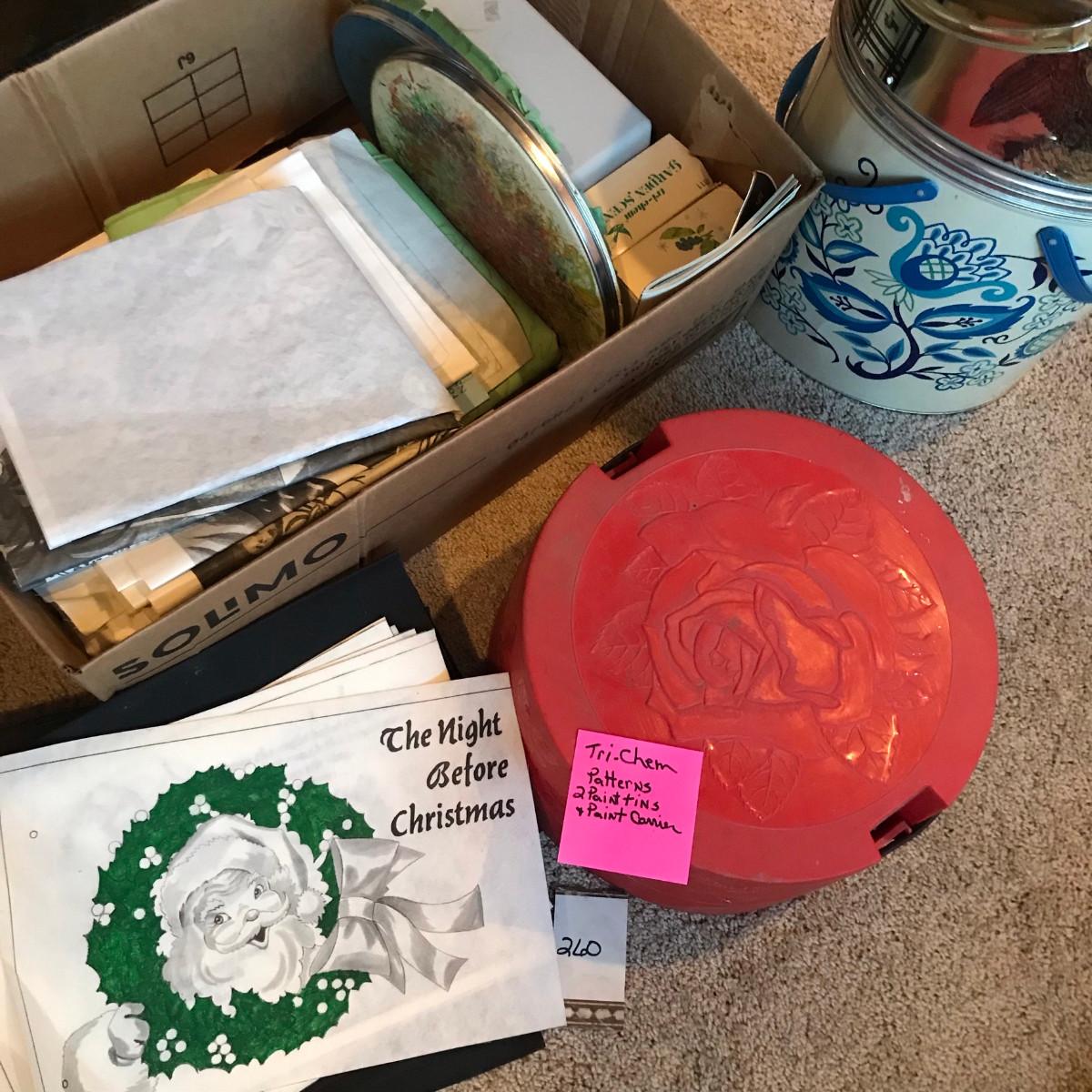 Take a look at all of the pictures, this is a very nice collection. The paints were sorted, the tubes pictured are new or very clean! You get two tins with embroidery hoop tops and LOTS of patterns!