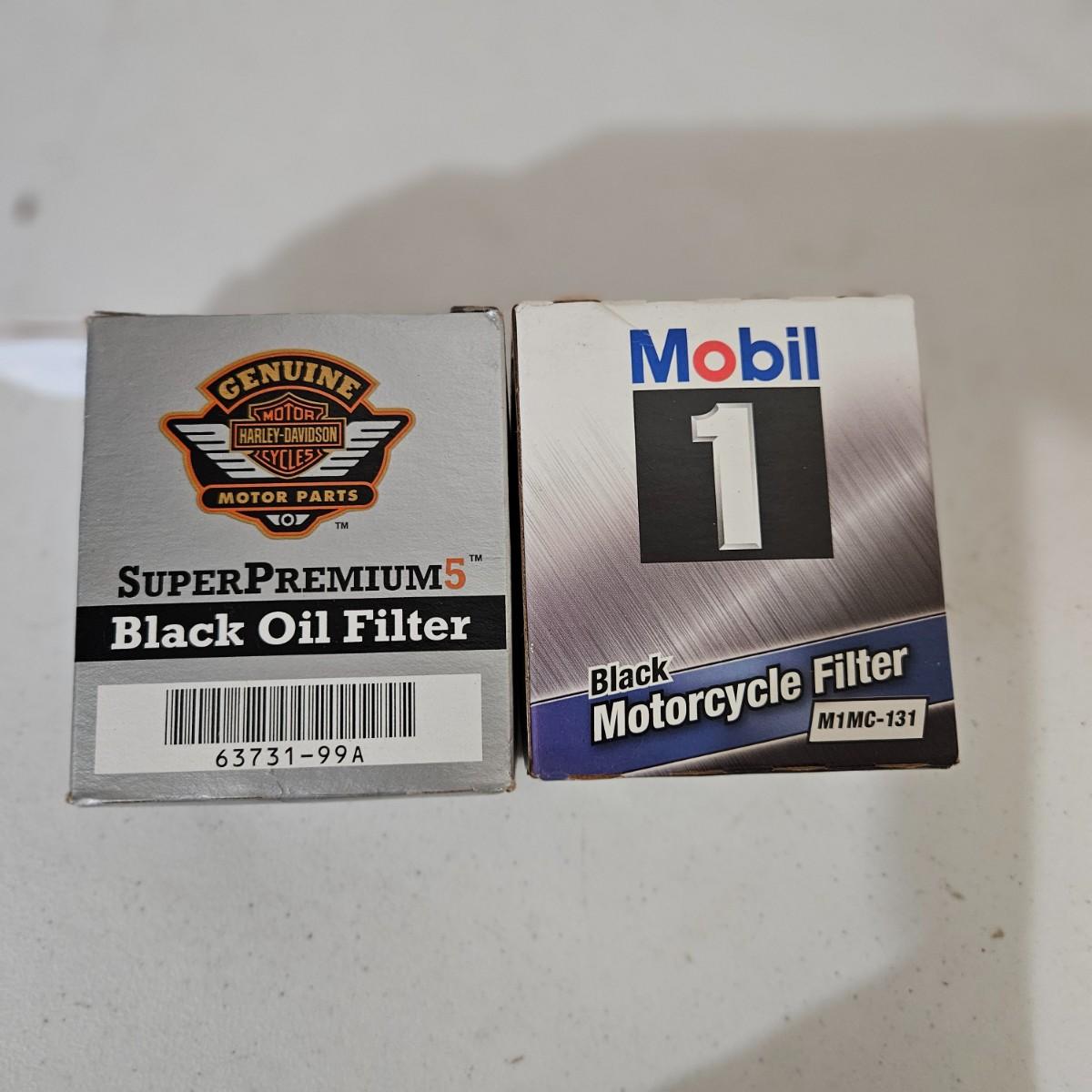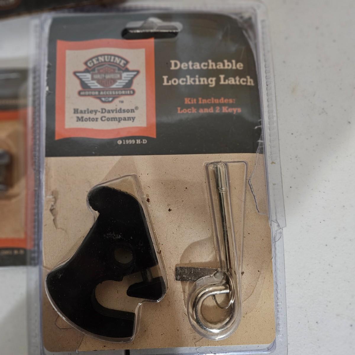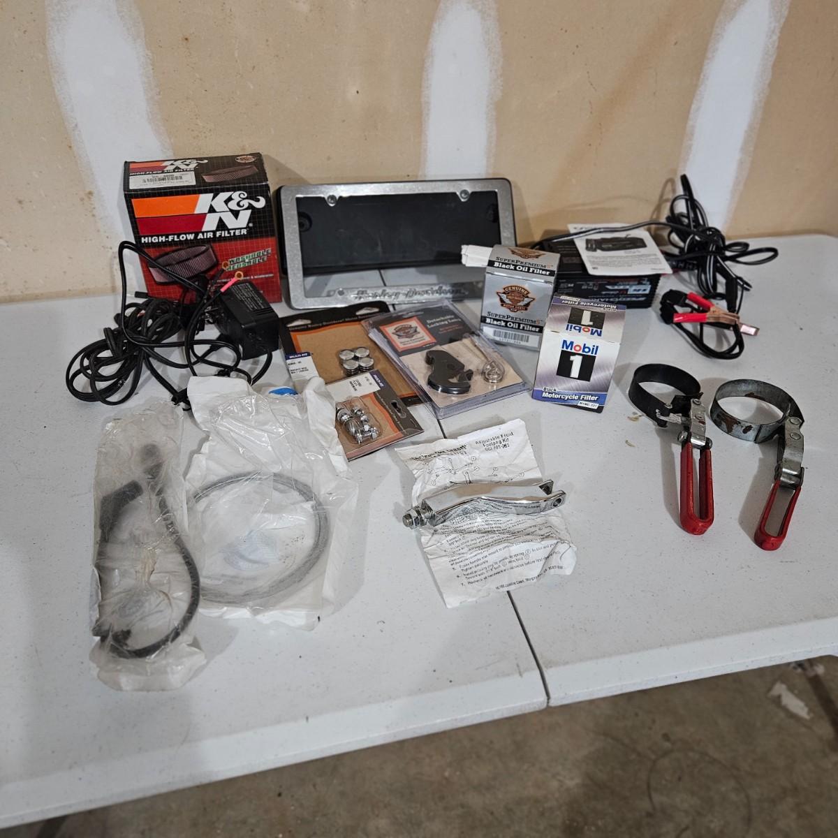 An assortment of Harley Davidson parts and accessories that includes two trickle chargers that both powered on when plugged in. Also included is various parts that likely fit an 2001 Dyna, oil filters, oil filter wrenches, and more. Shipping available