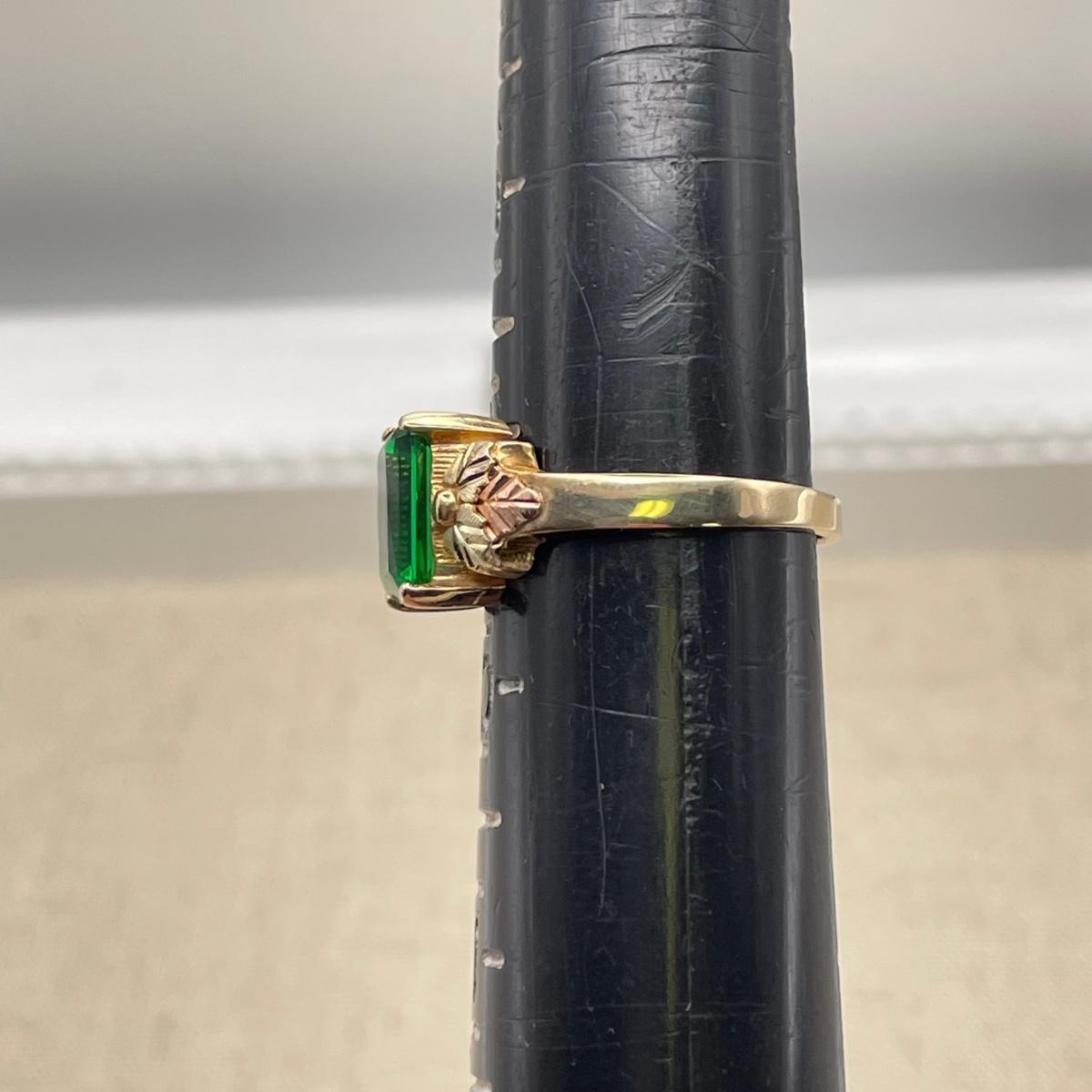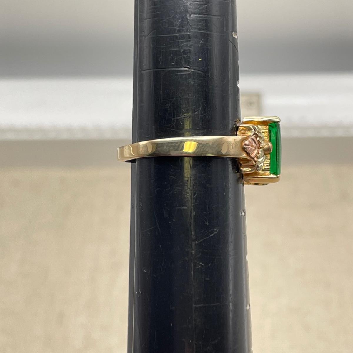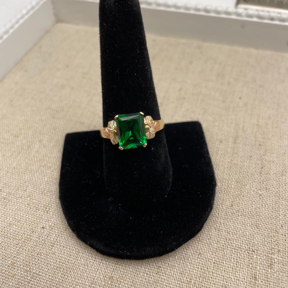 Tri-colored ring marked with 10K plus another marking, see images. Centerpiece is clear, vibrant and emerald colored. We cannot guarantee the authenticity of the gemstone. All sales are final. No returns or refunds. Please bid accordingly.