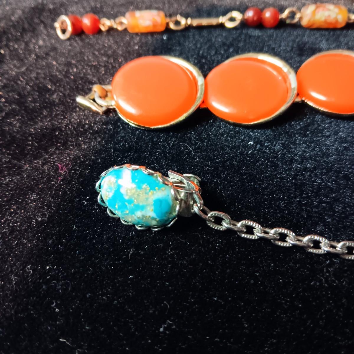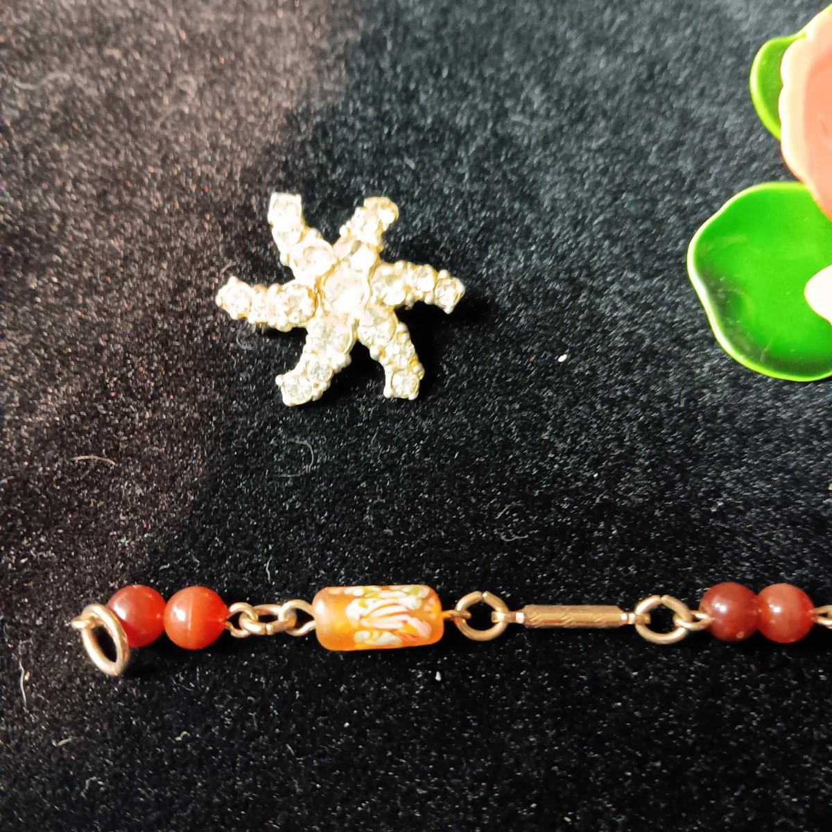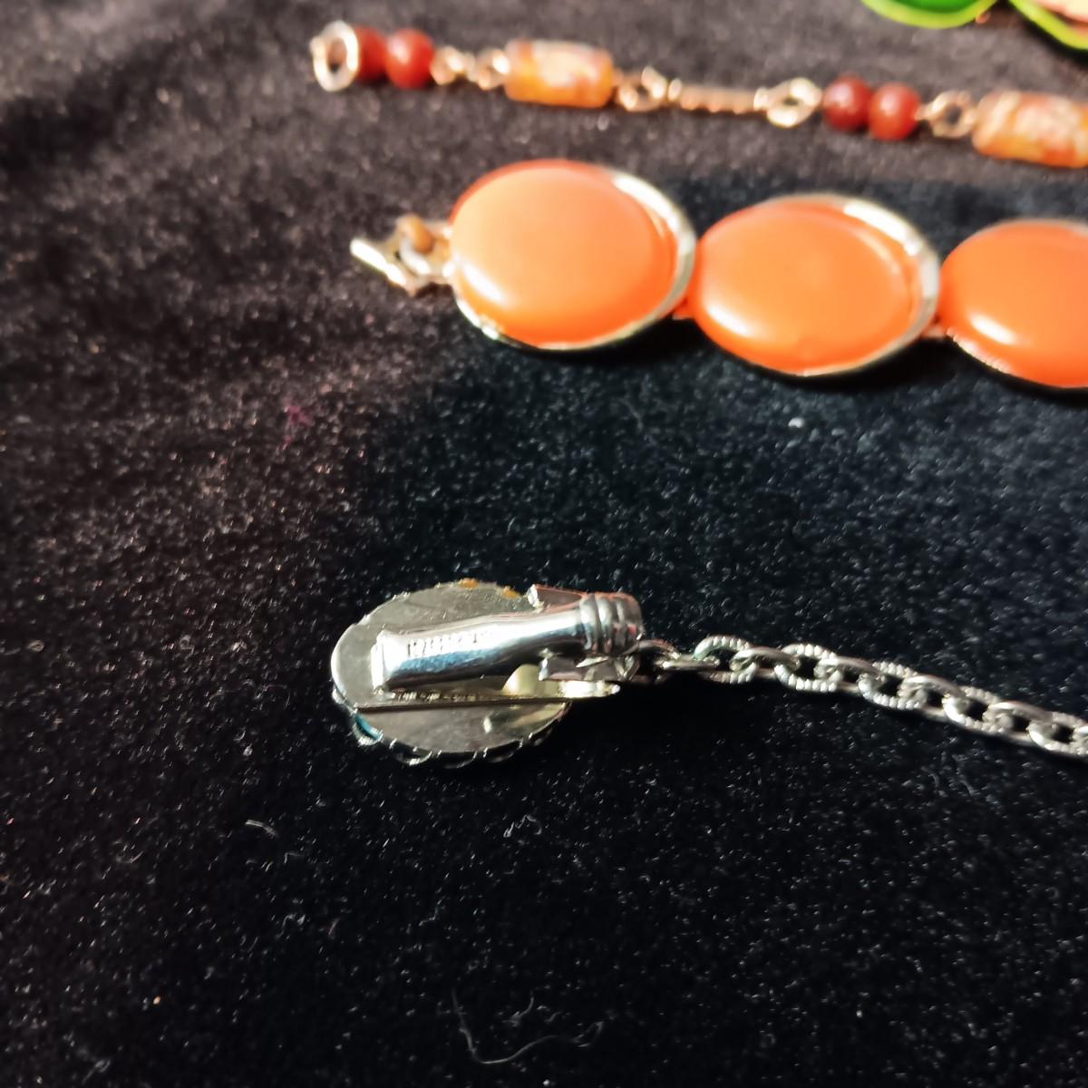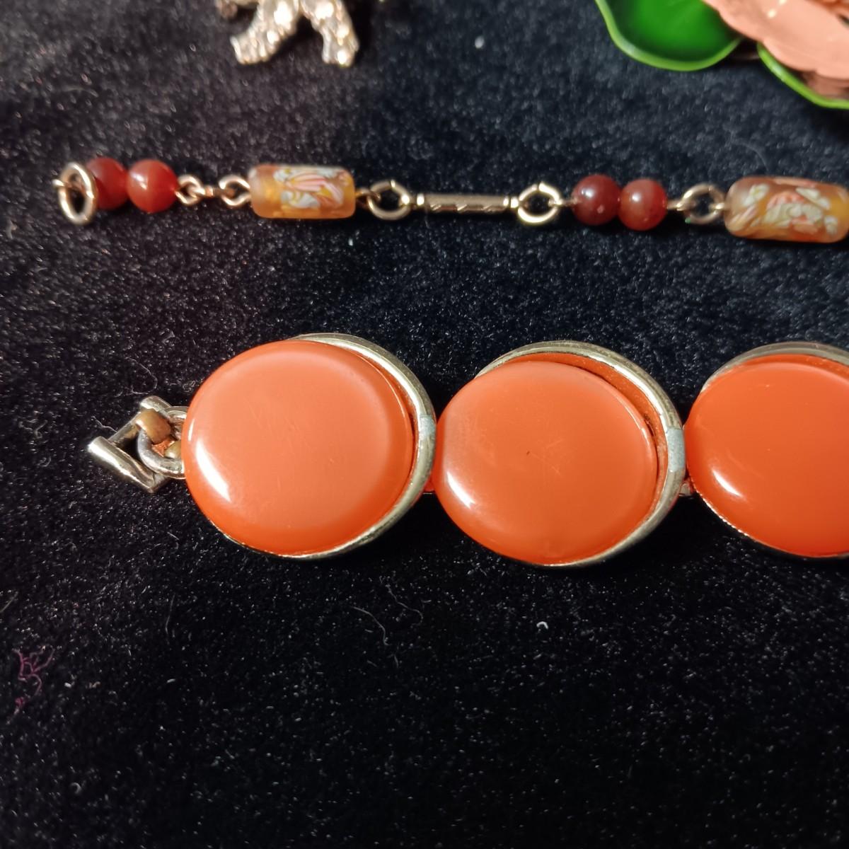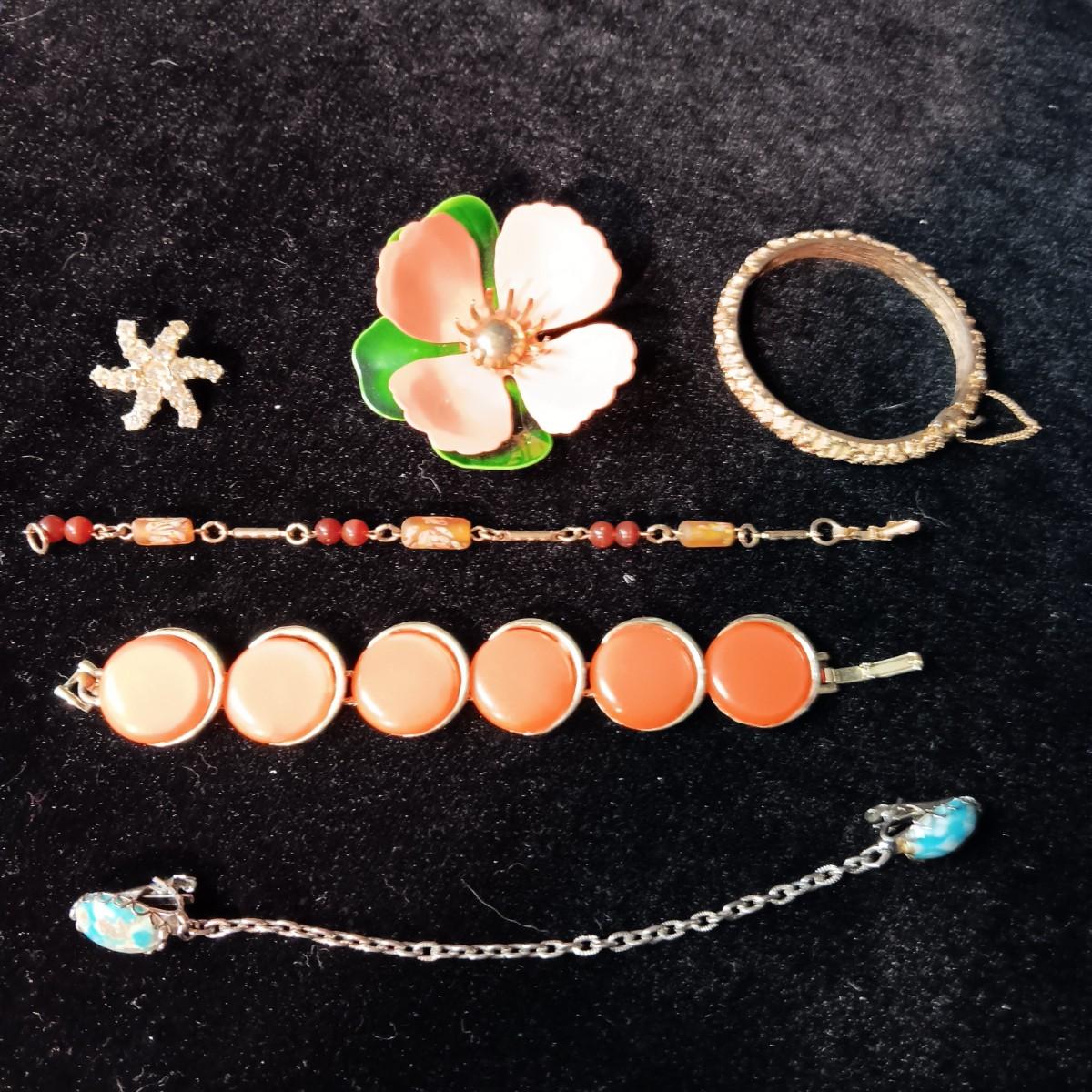 TRIFARI BRACELET, CORAL COLORED BRACELET AND BROOCH, RHINESTONE PIN AND MORE