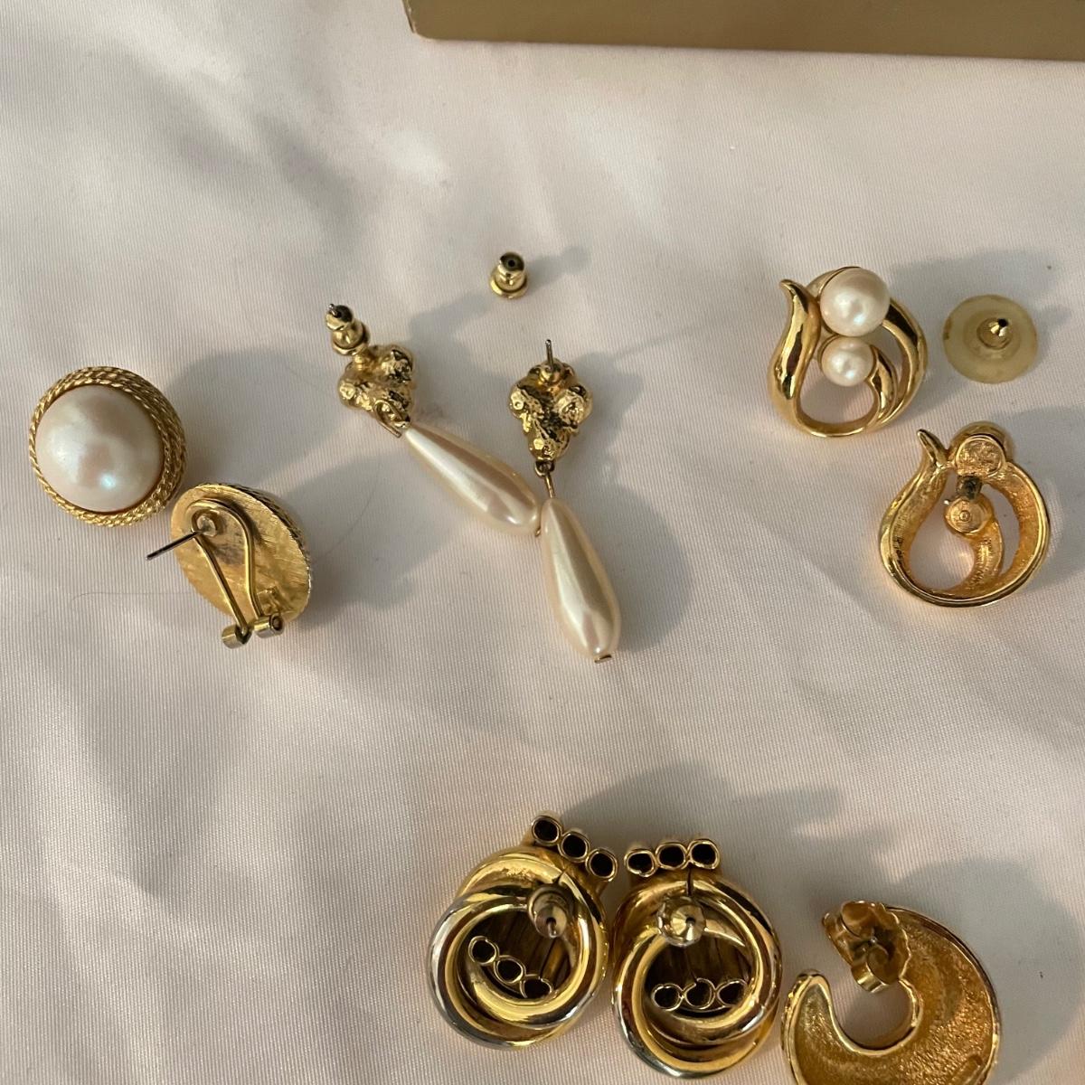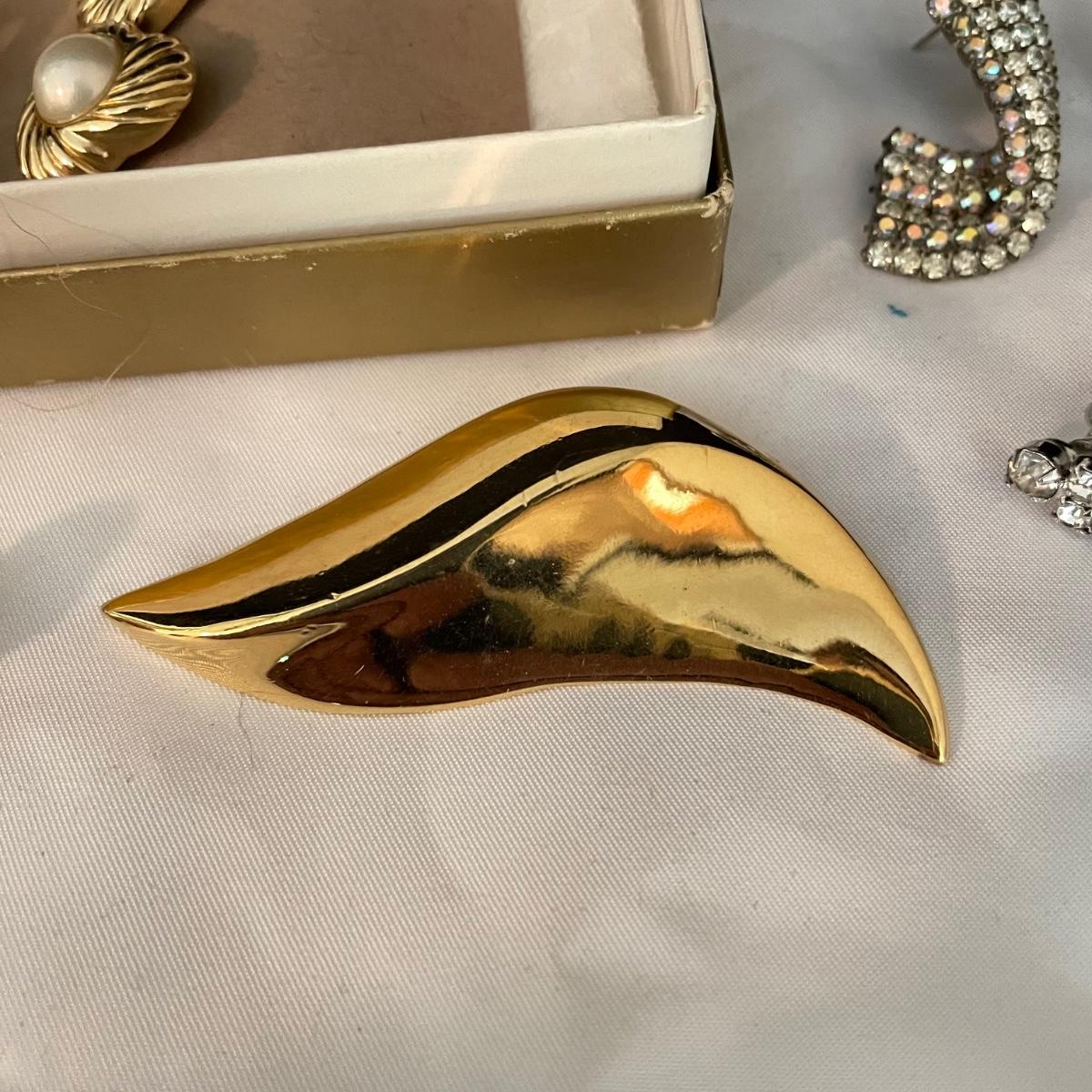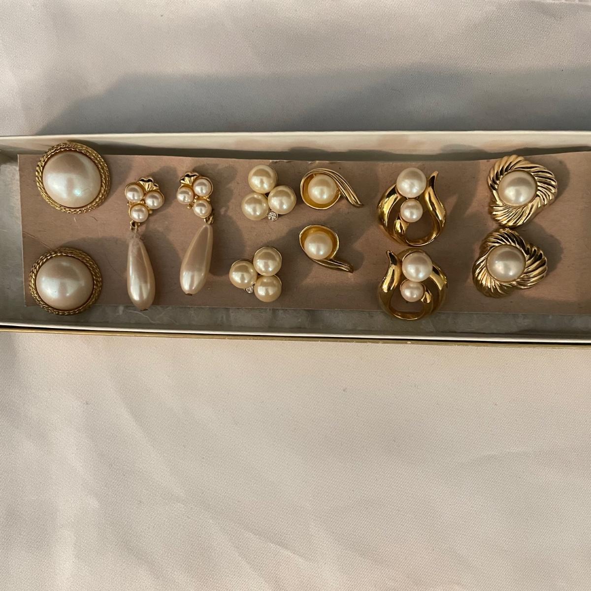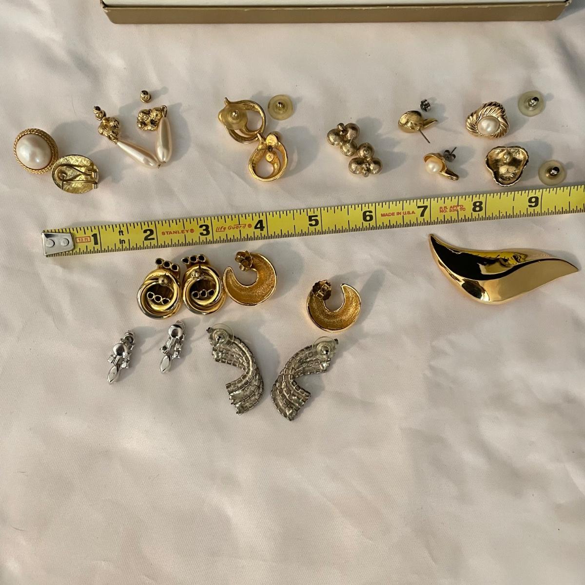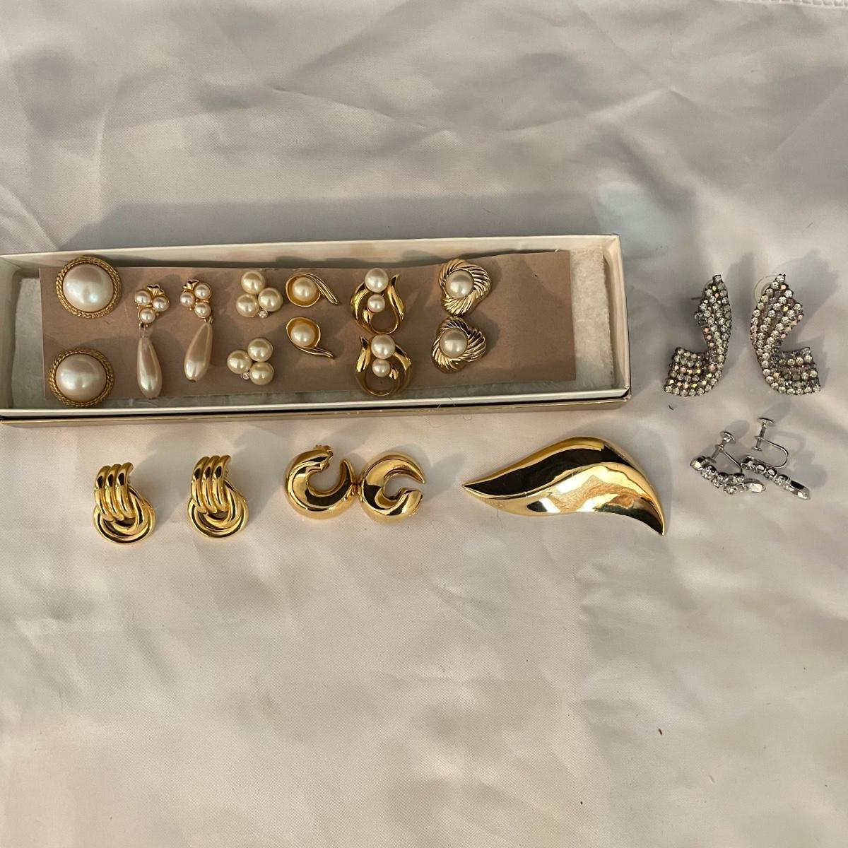 Trifari brooch measures 2.75”. Lot contains nine pairs of earrings including one silver clip pair with rhinestones (the rest are for pierced ears). One of the pearly pairs is missing its backings. Earrings don’t appear to have markings. See images. Shipping available.