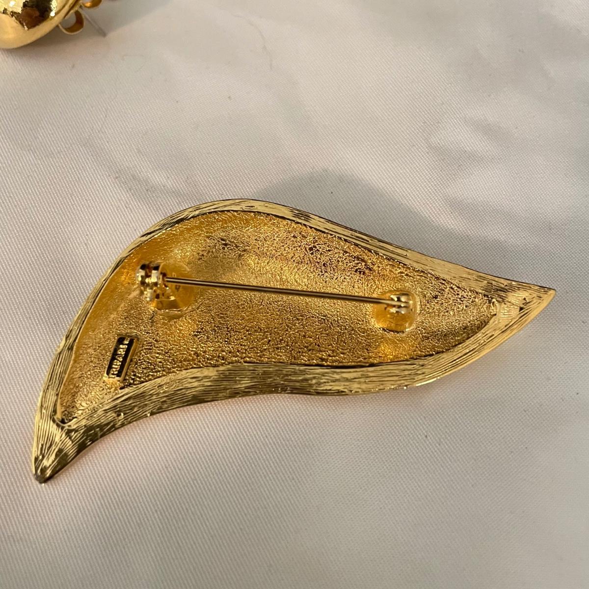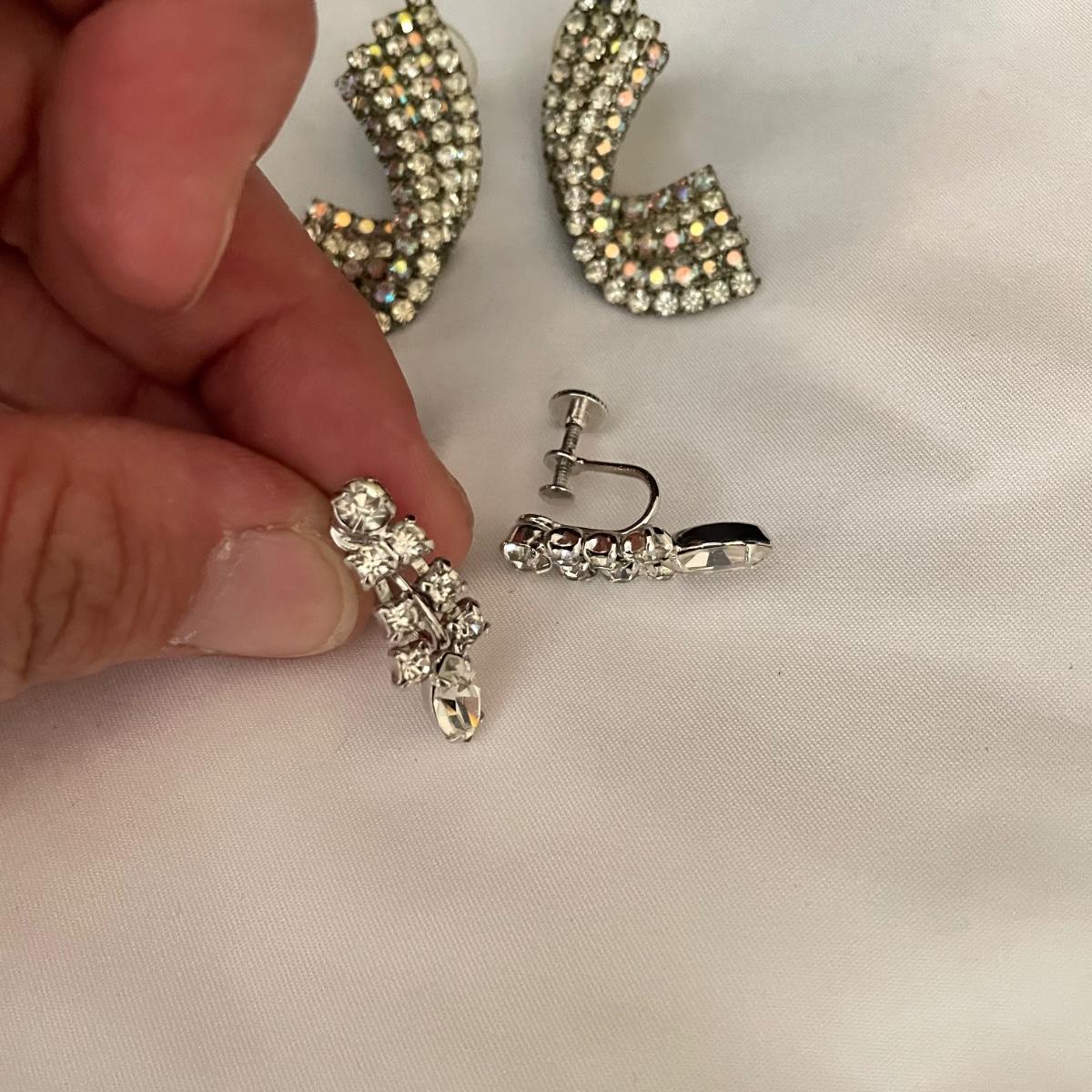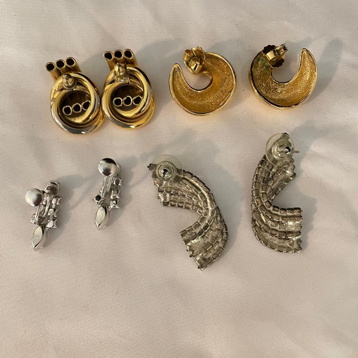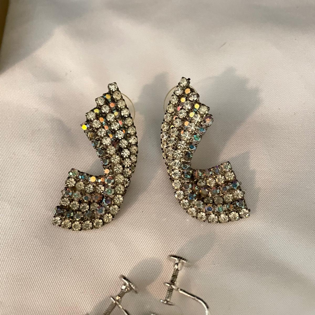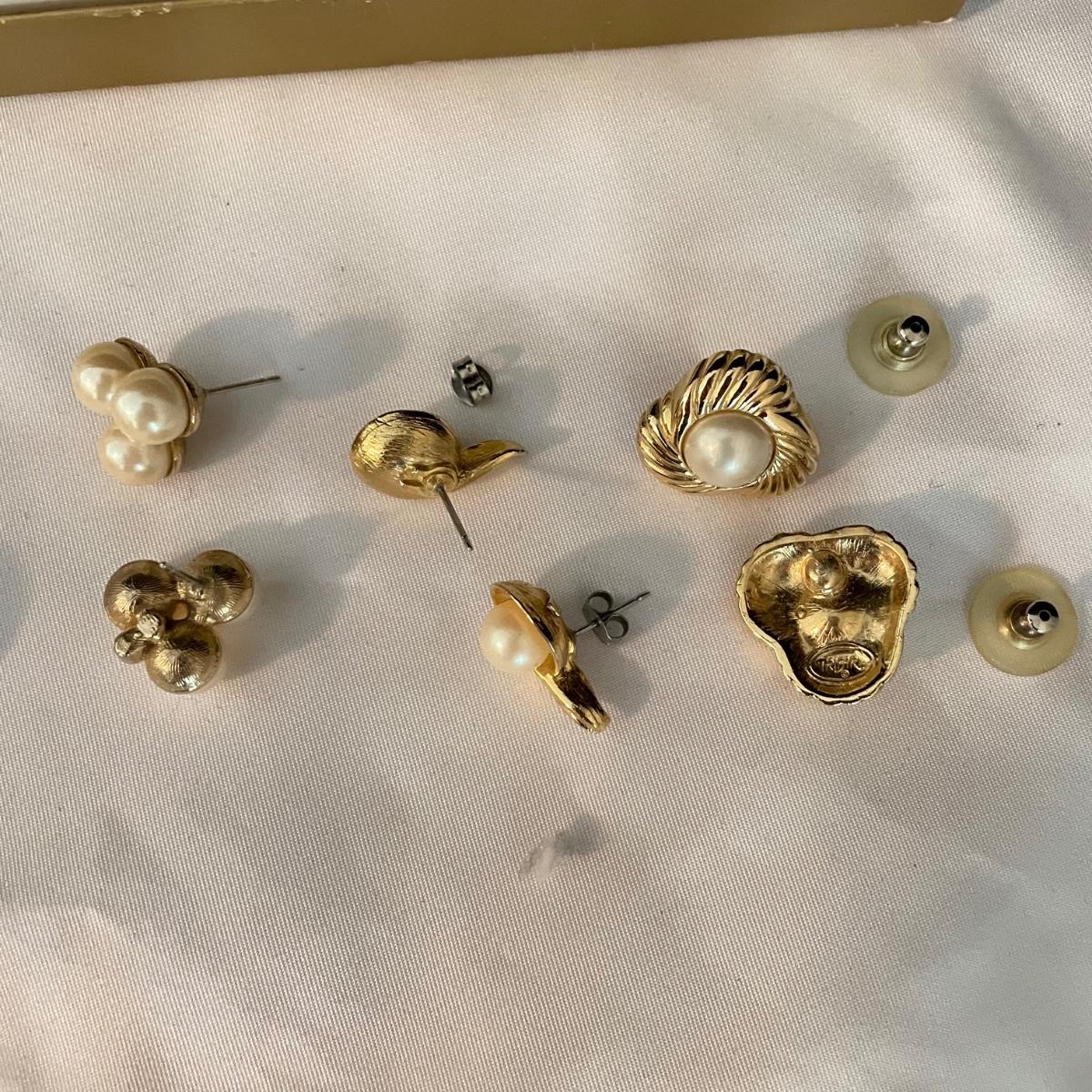 Trifari brooch measures 2.75”. Lot contains nine pairs of earrings including one silver clip pair with rhinestones (the rest are for pierced ears). One of the pearly pairs is missing its backings. Earrings don’t appear to have markings. See images. Shipping available.