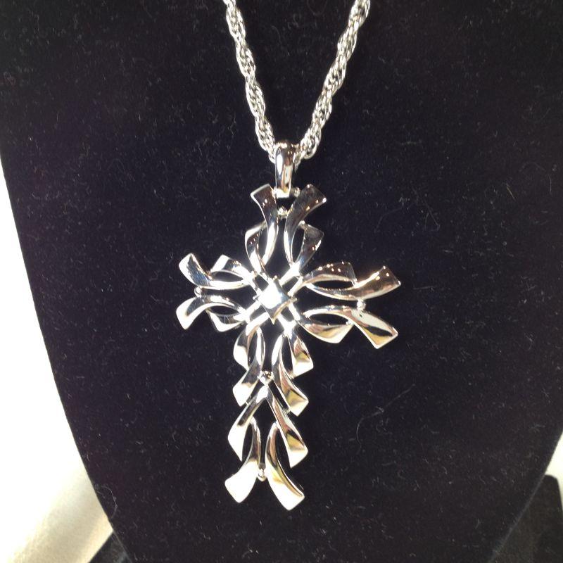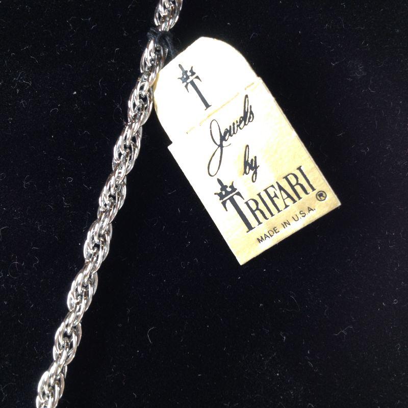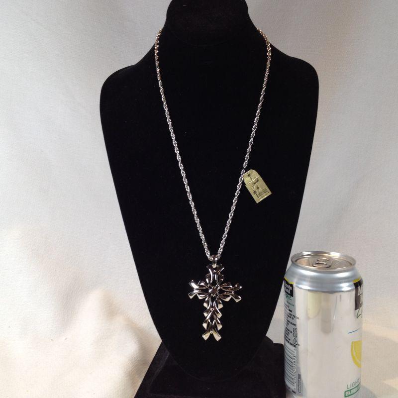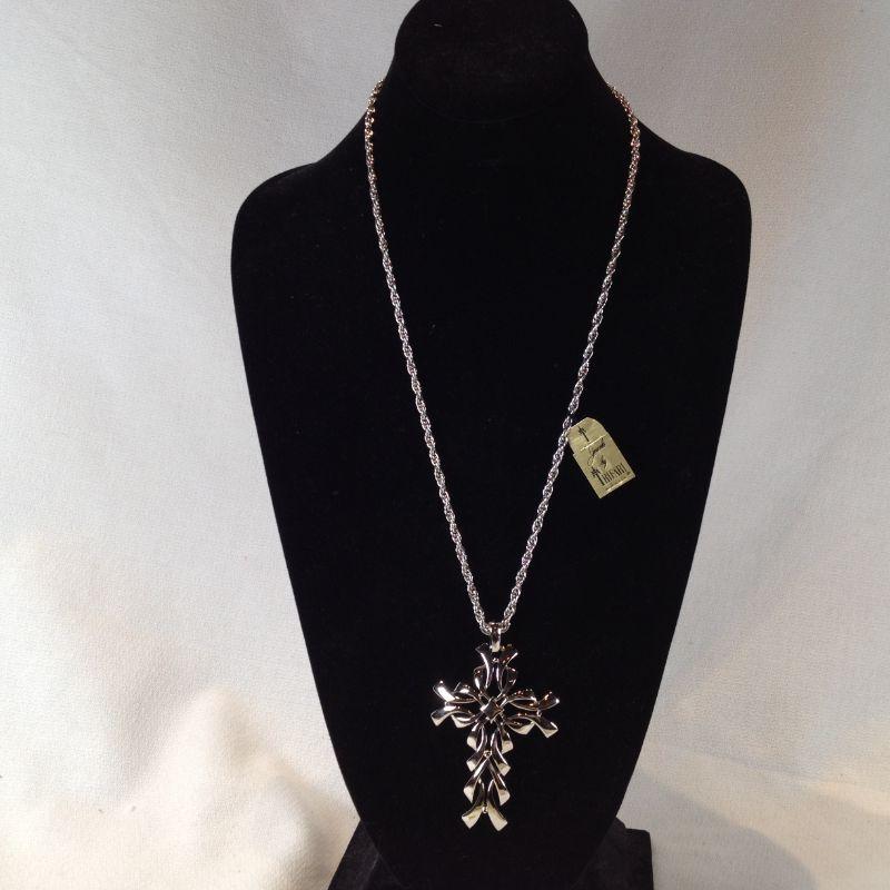 This lot is for a Trifari Silver-Toned Cross with a long chain necklace. Still has tag and appears unworn. Unusual and quite unique. Bid high and gift this to your local bishop - it seems quite regal.