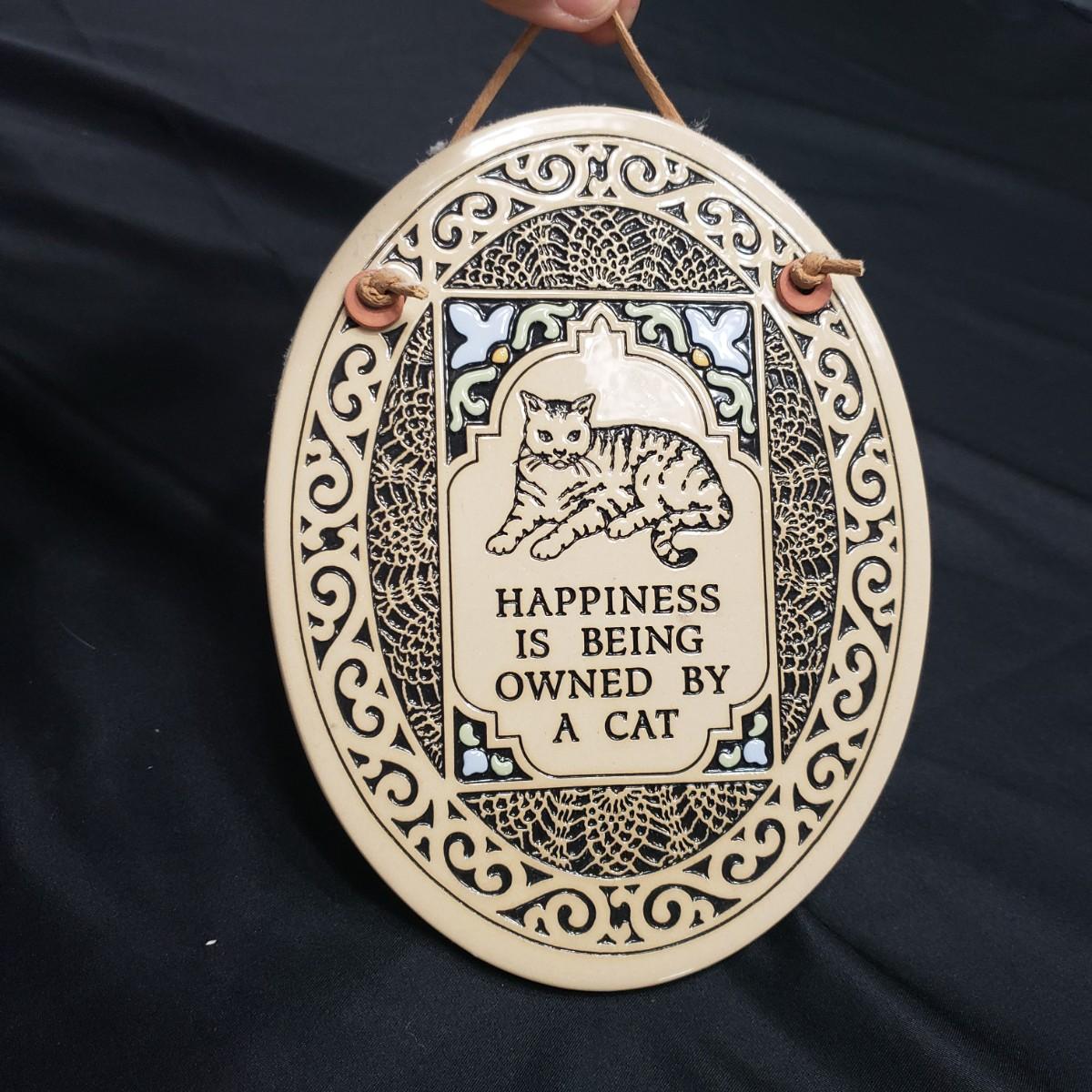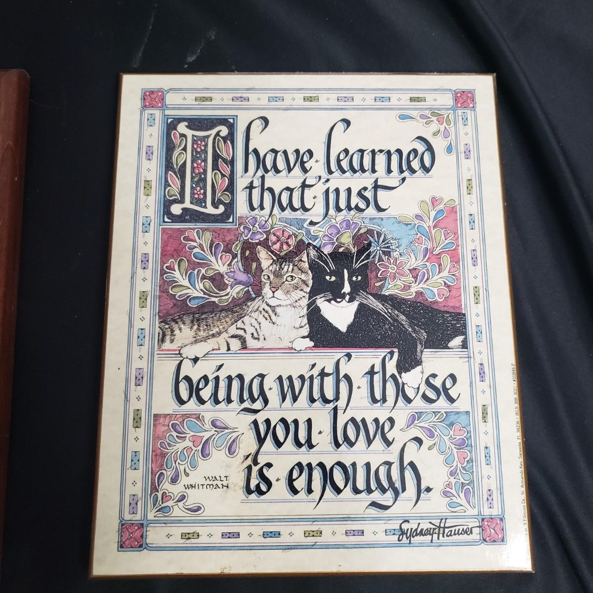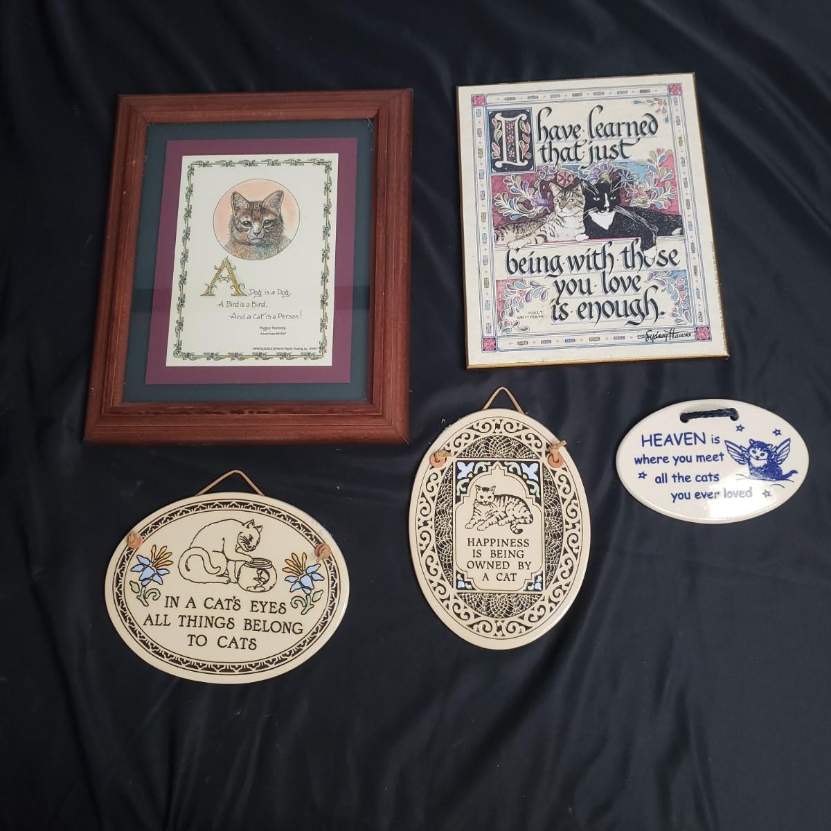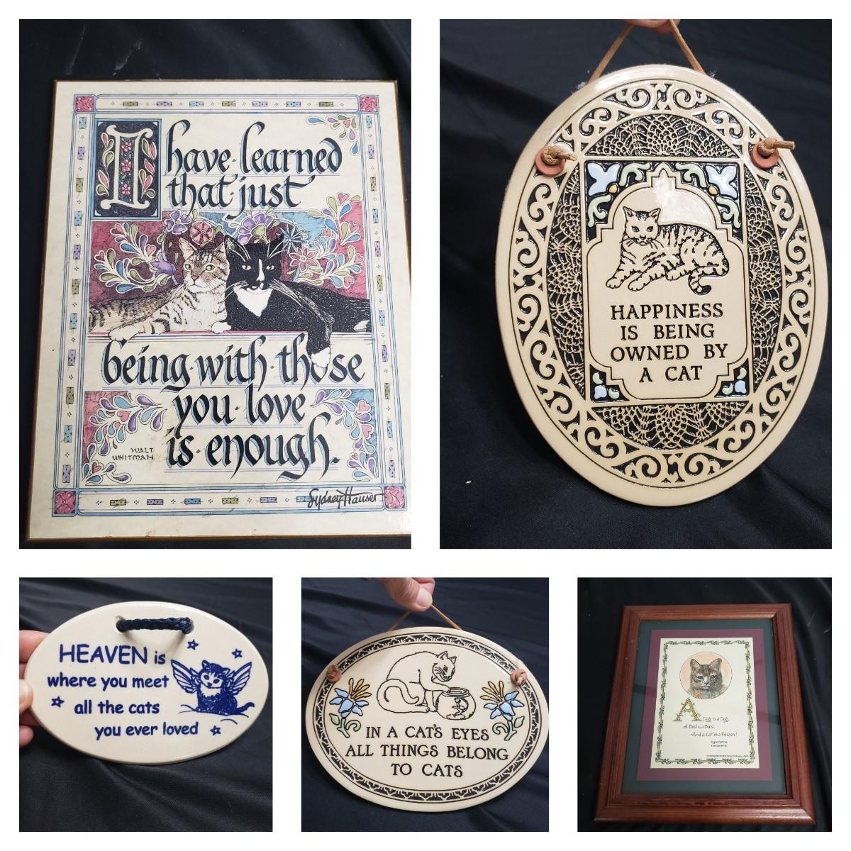 This five piece cat lot features three pottery quotes and two pictures all about cats! There are two pieces from Trinity Pottery measuring approximately 7" x 5.5". The wooden frame behind glass is a matted quote by Mugsy Peabody.