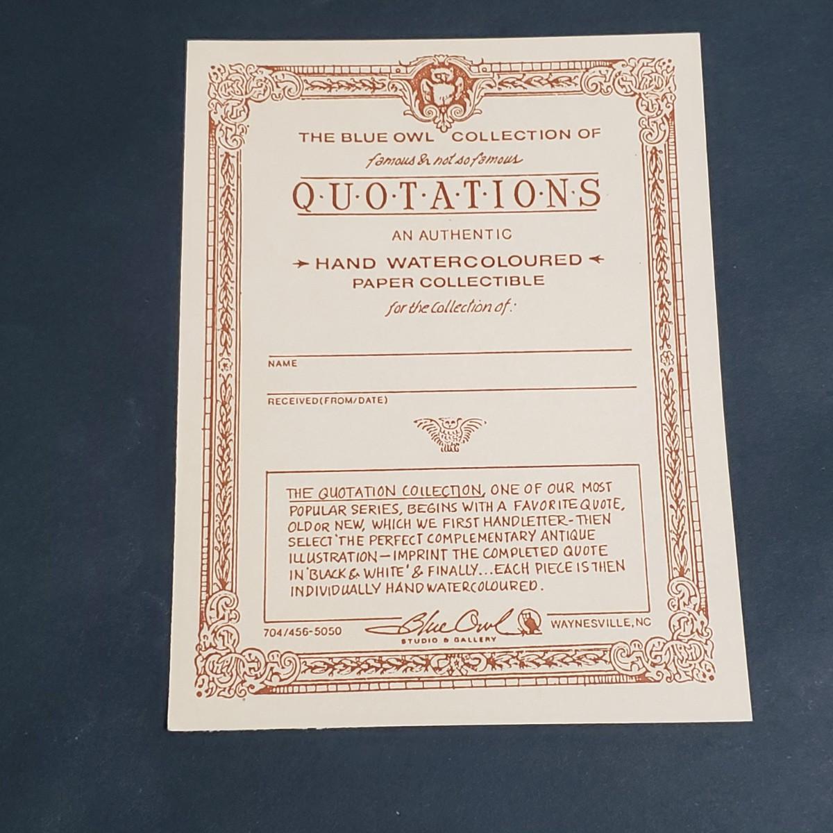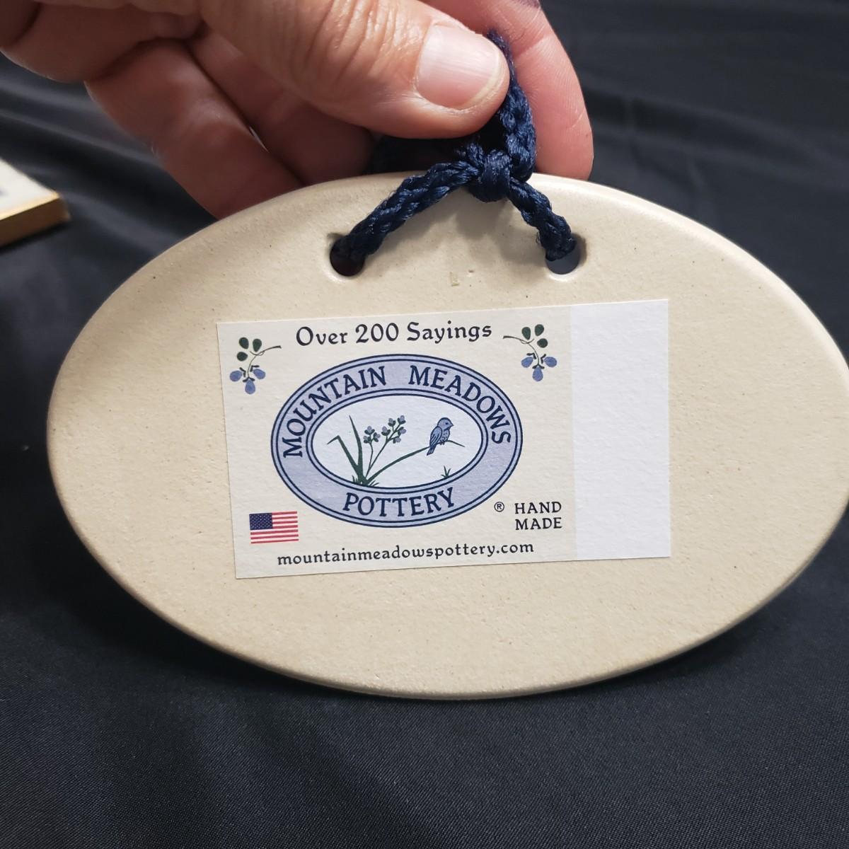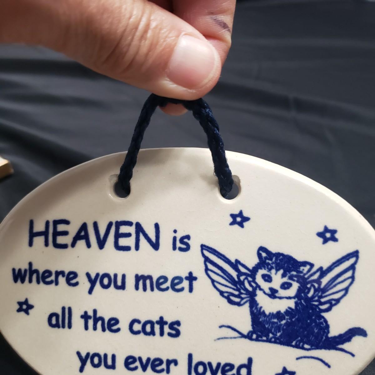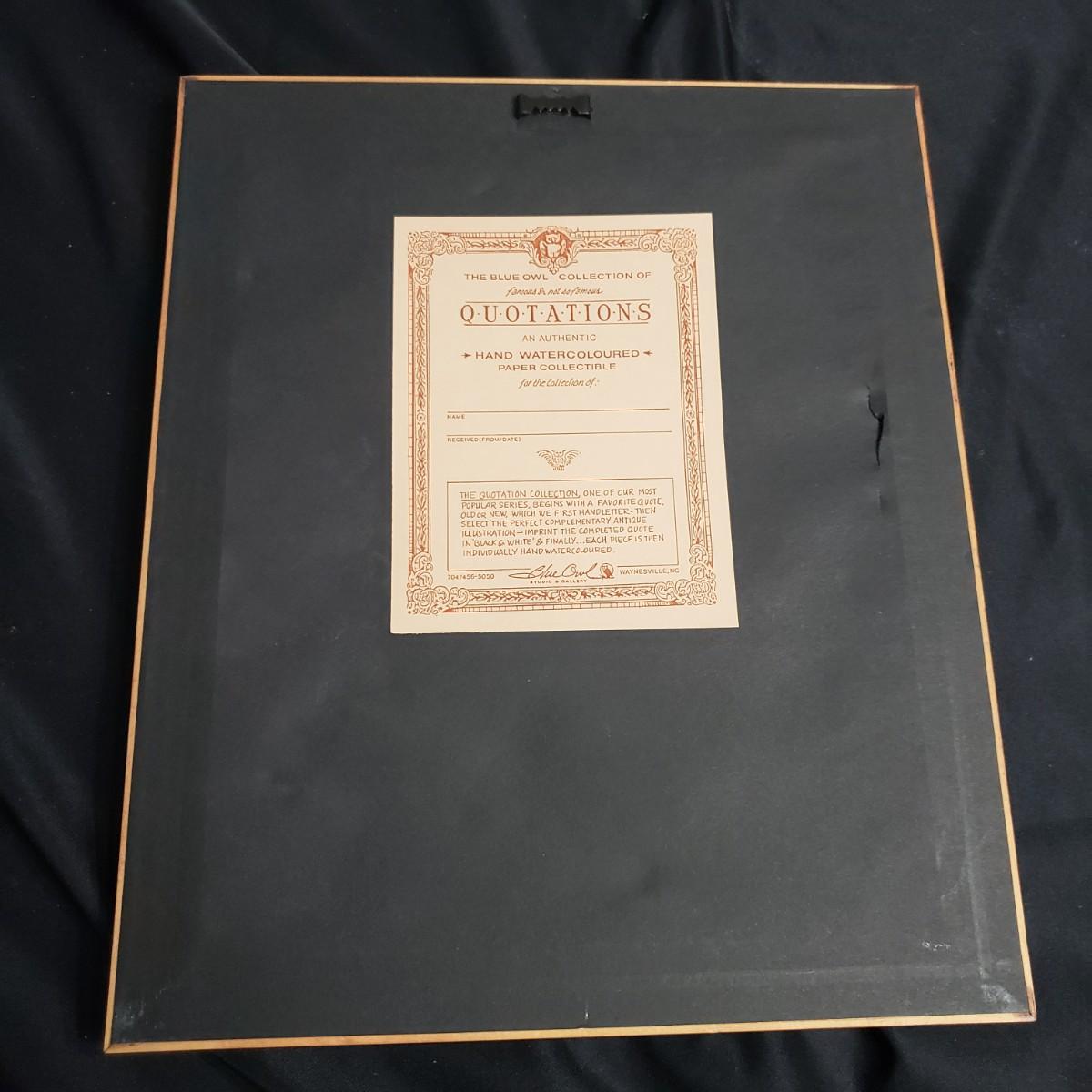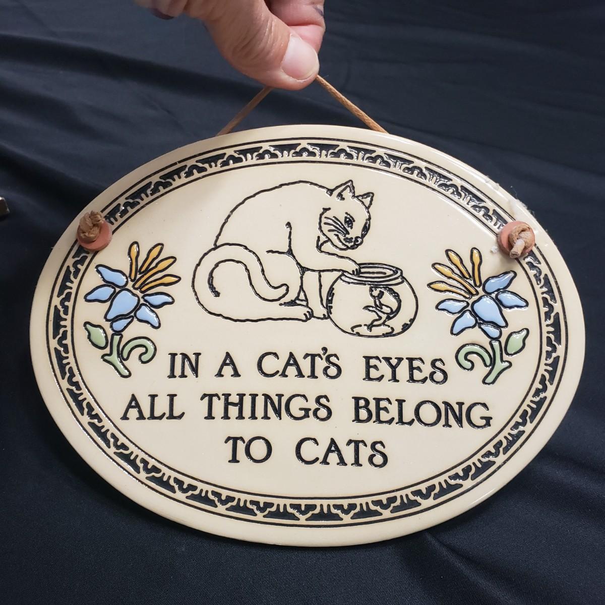 This five piece cat lot features three pottery quotes and two pictures all about cats! There are two pieces from Trinity Pottery measuring approximately 7" x 5.5". The wooden frame behind glass is a matted quote by Mugsy Peabody.