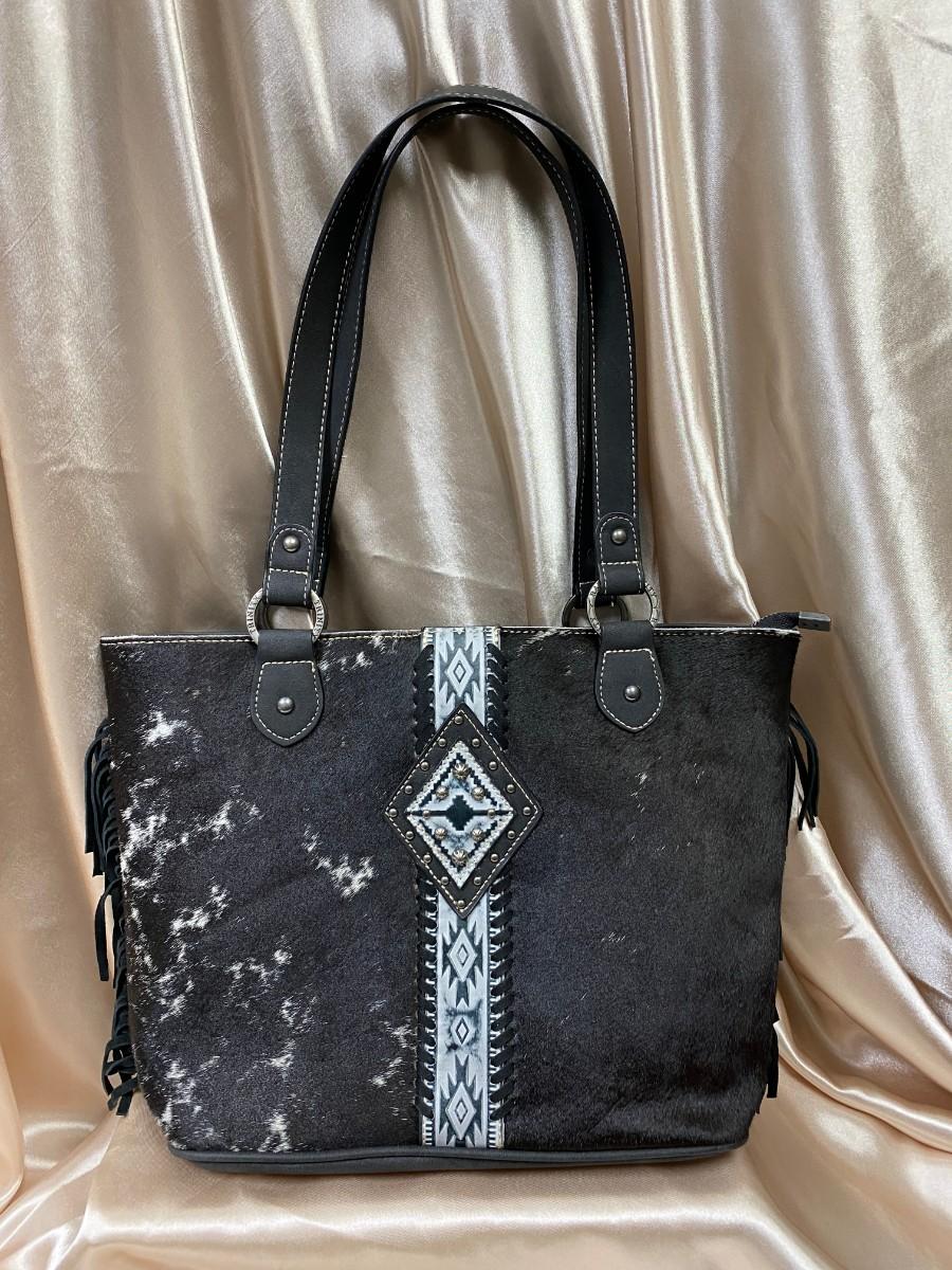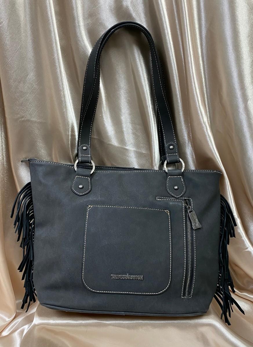 Concealed Carry Tote. Montana West Trinity Ranch collection with whipstitched detail. 2 interior zipper pockets, 2 open pockets, double flat strap, fringe on the side.