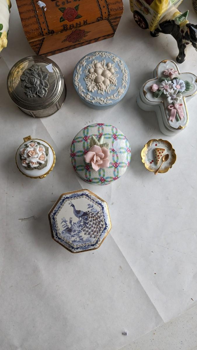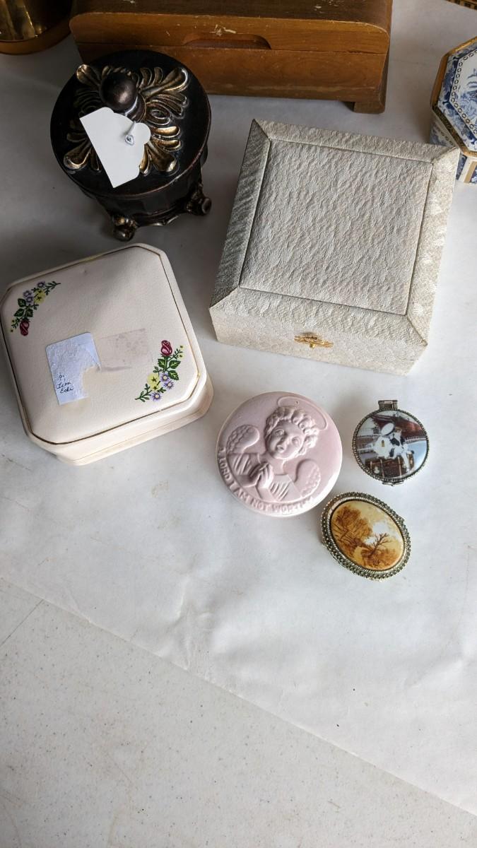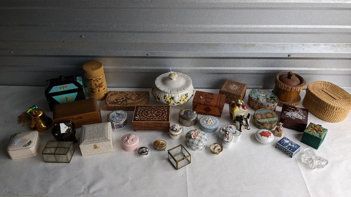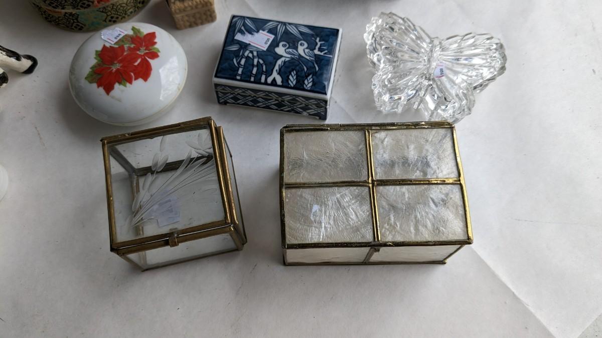 another great assortment for your consideration. This one includes all sorts of trinket/jewelry boxes with wood, porcelain, fabric, glass, capice shell, glass, and ceramic composition. As well as 2 wood box music boxes and a Reuge music bell. Please note that music box with glass front shows extensive wear and doesn't stop when closed. No shipping. 2616