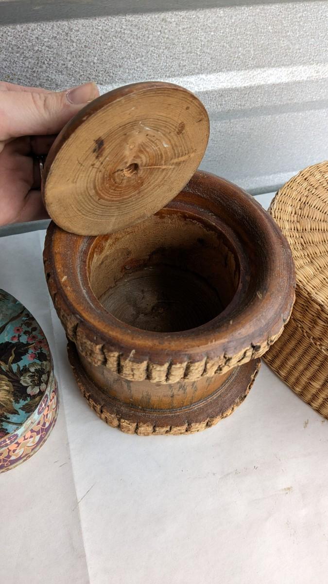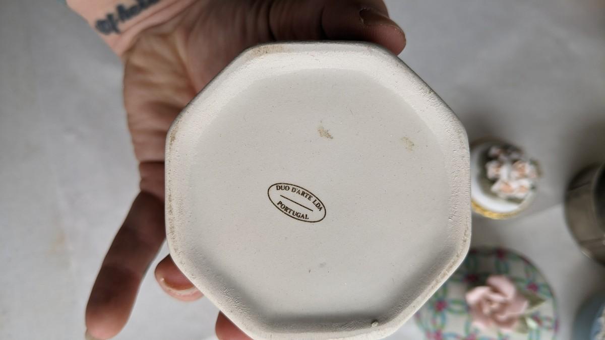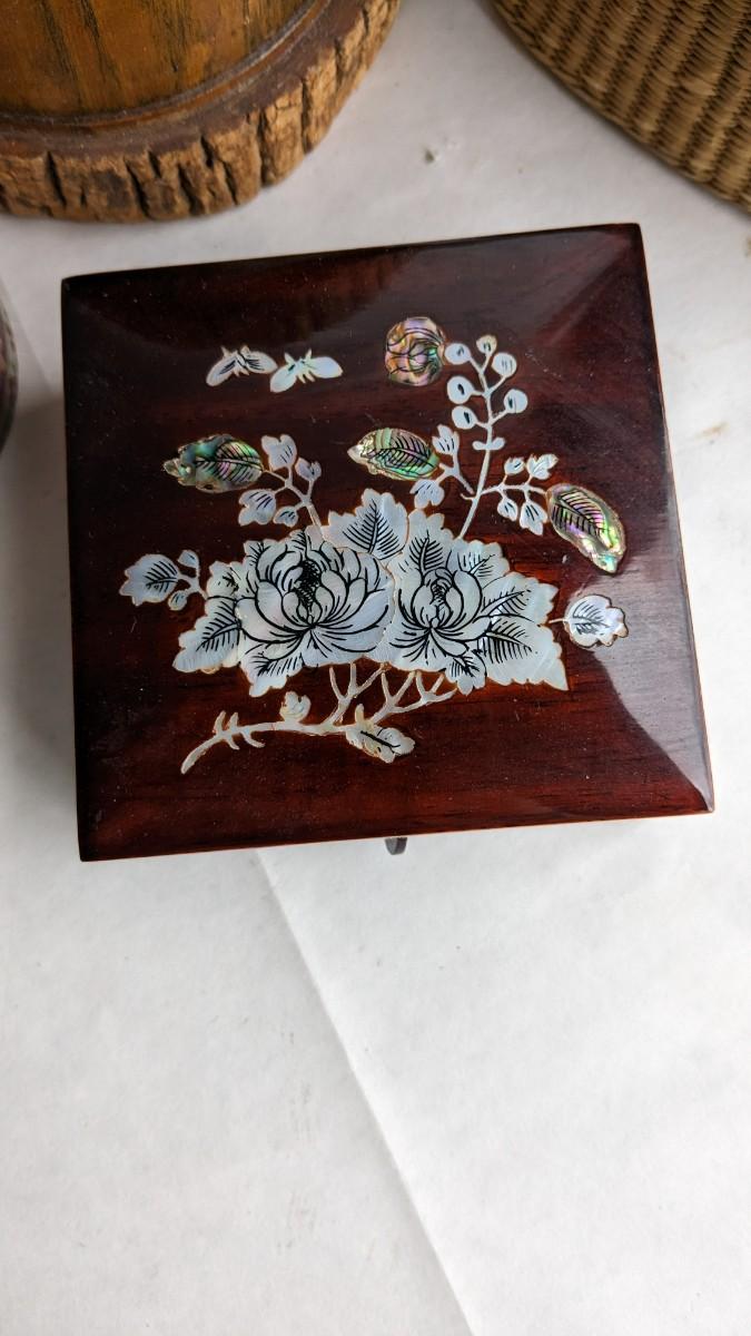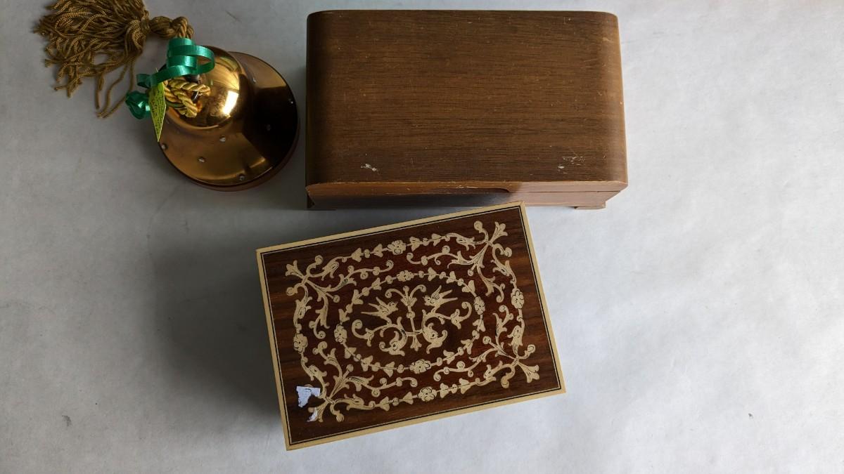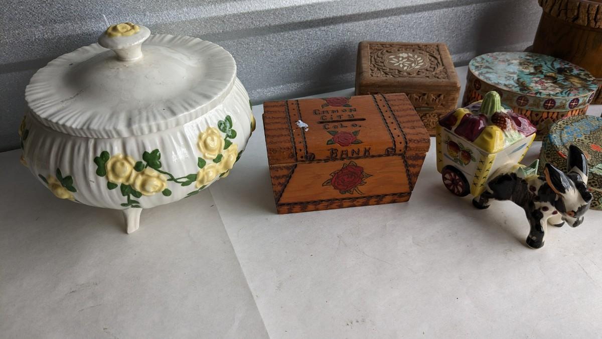 another great assortment for your consideration. This one includes all sorts of trinket/jewelry boxes with wood, porcelain, fabric, glass, capice shell, glass, and ceramic composition. As well as 2 wood box music boxes and a Reuge music bell. Please note that music box with glass front shows extensive wear and doesn't stop when closed. No shipping. 2616