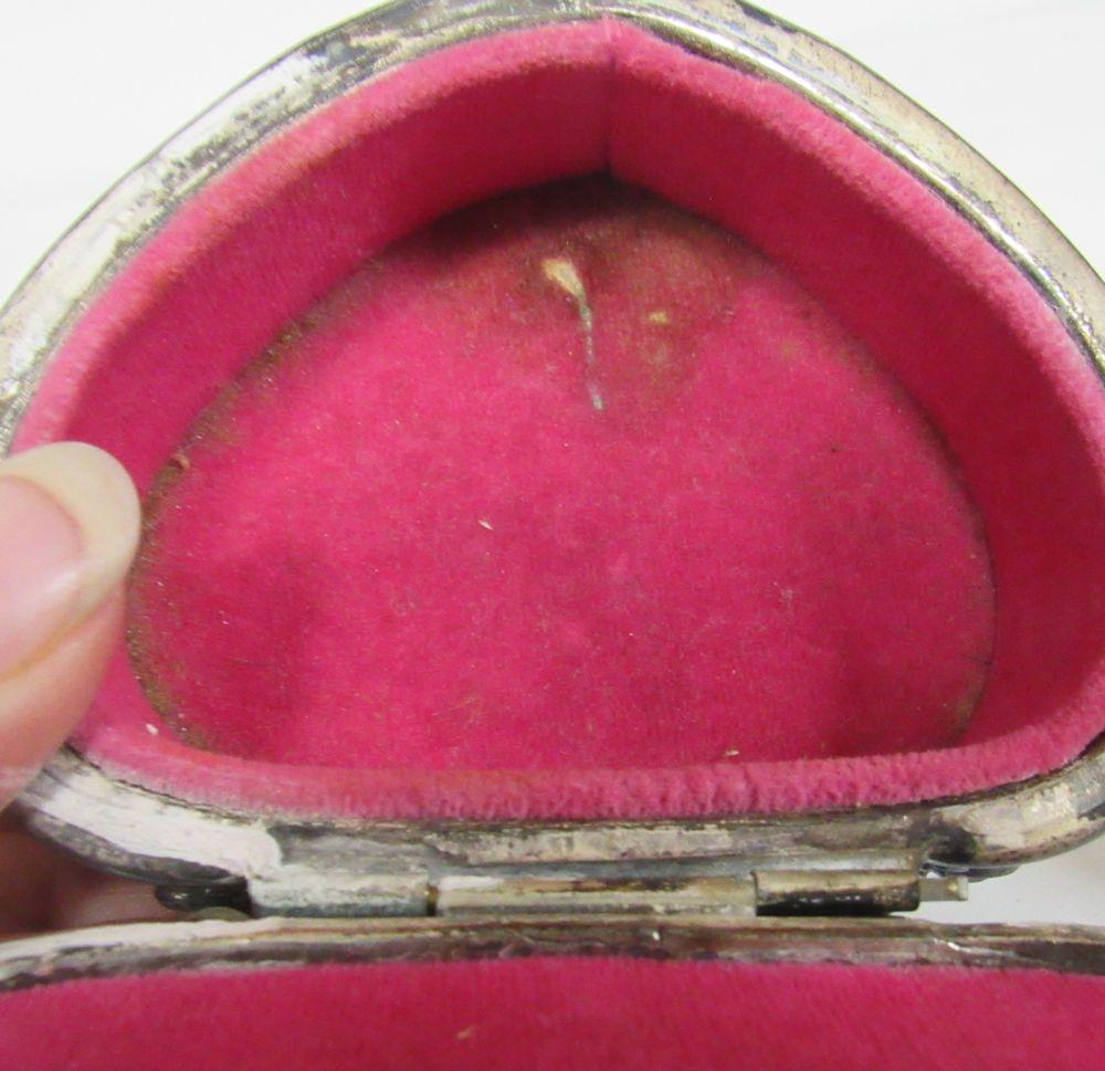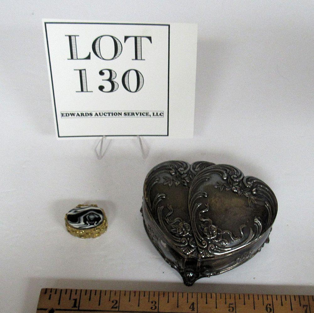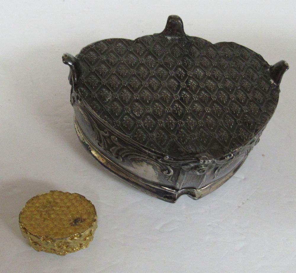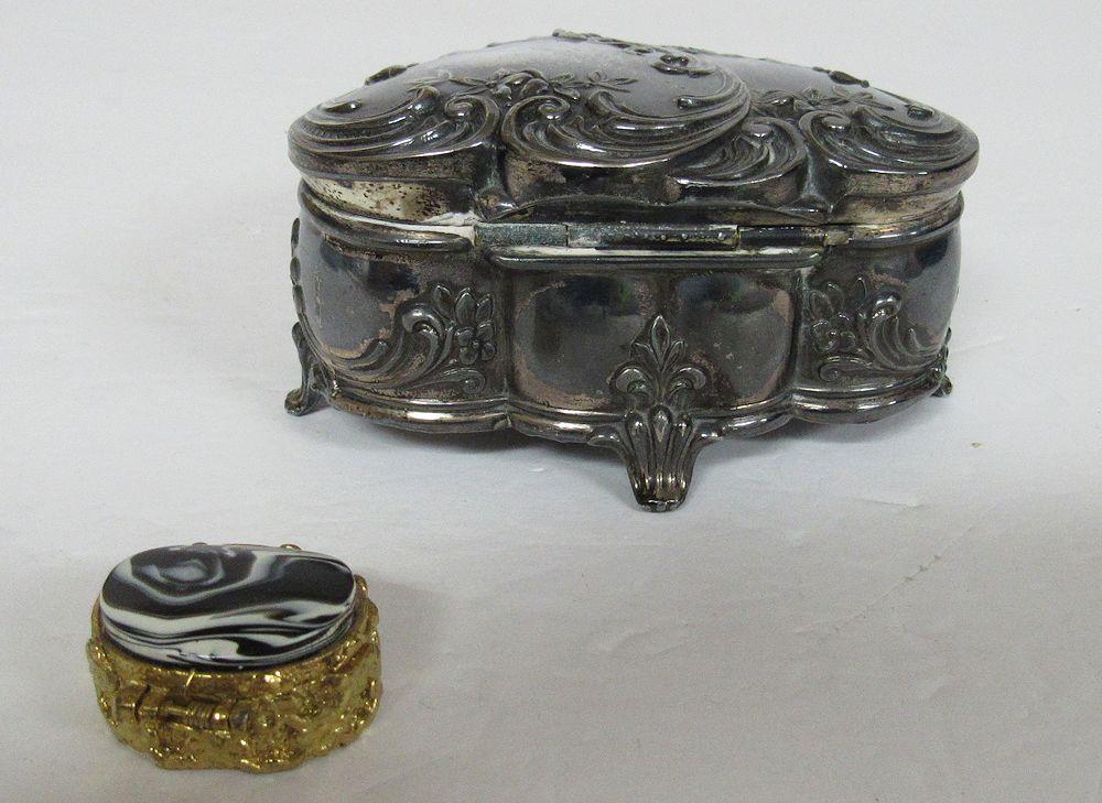 Trinket box looks silver plate. The little pill box is metal with I think a stone top. Shipping is available at shipping cost plus $5.00 handling fee on up to 8 lots, $10.00 handling fee on 9 or more lots or two boxes. You will receive exact item as pictured, no refunds, returns not accepted.
