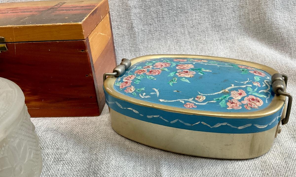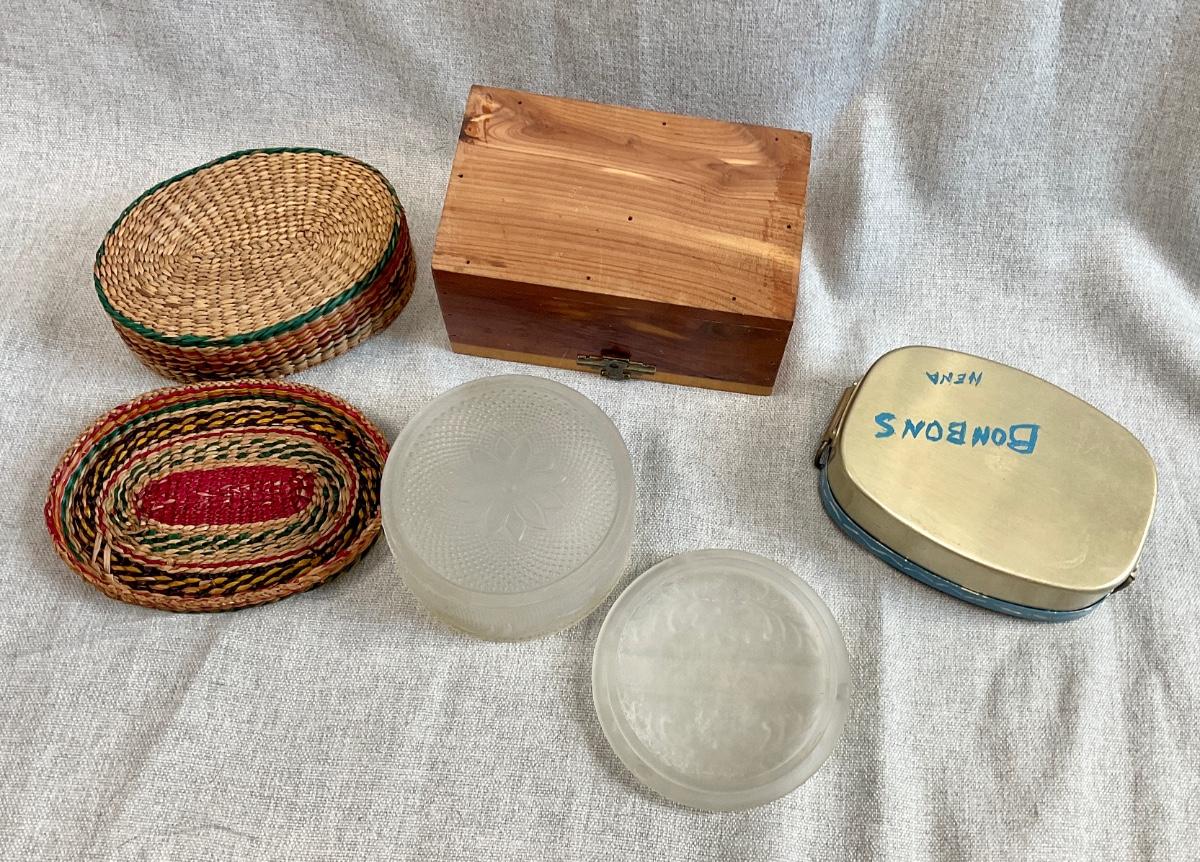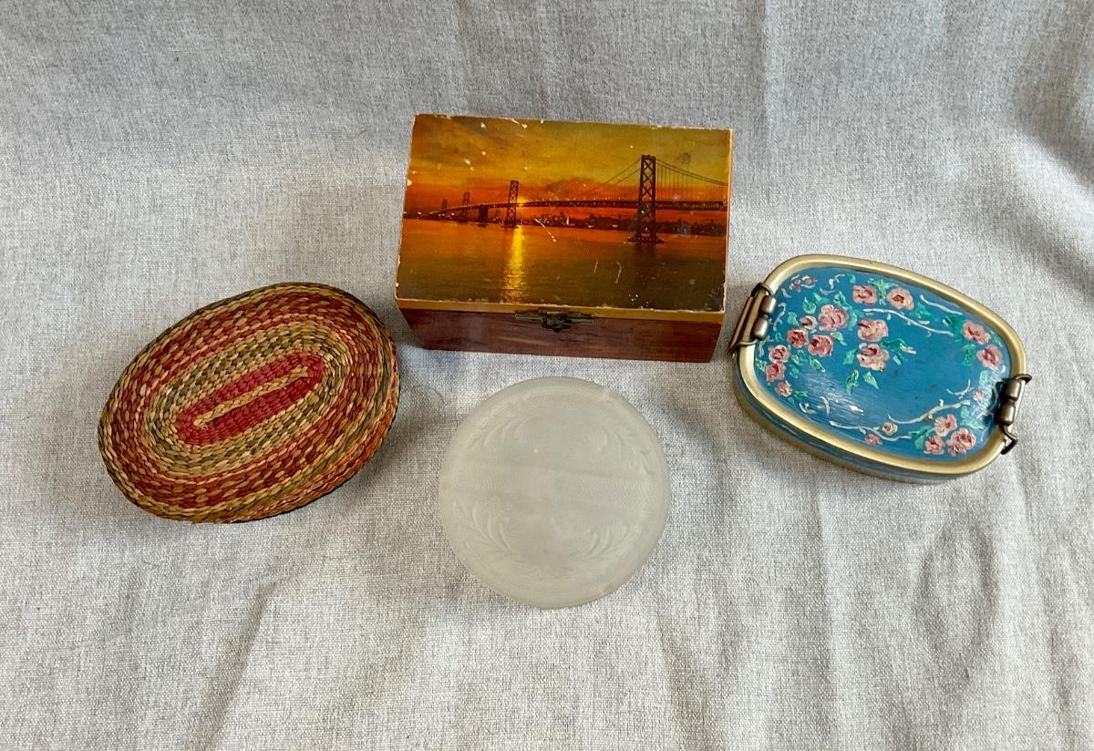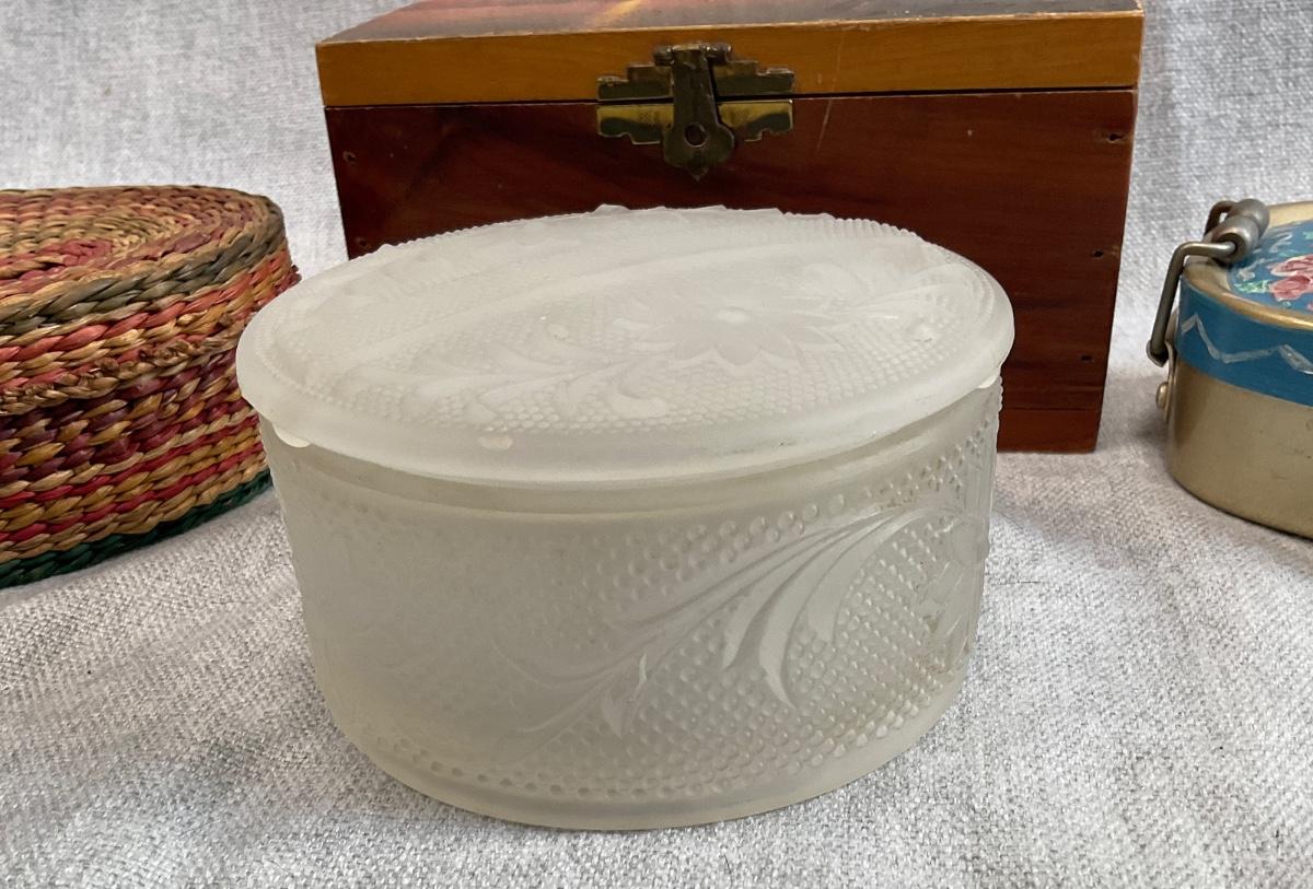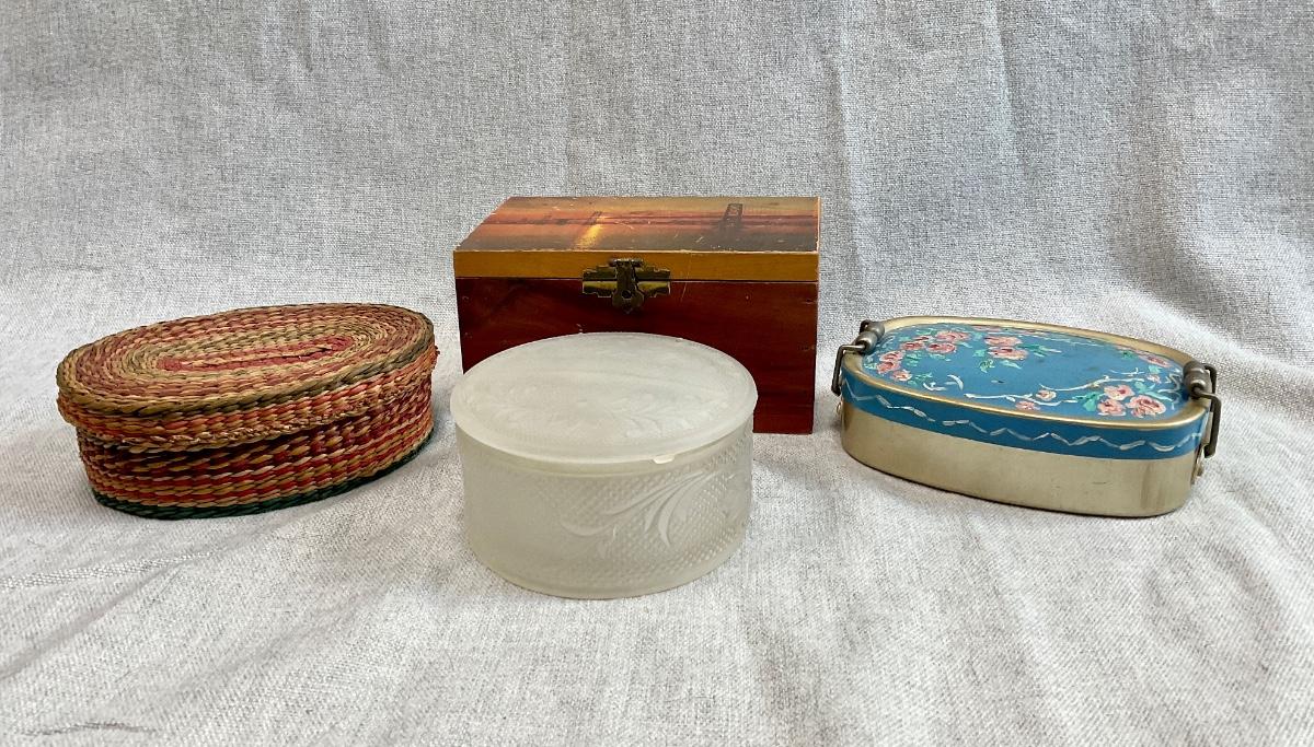 Trinket Box Lot, vintage wood treasure bow, glass powder jar, tin can, multicolored basket box