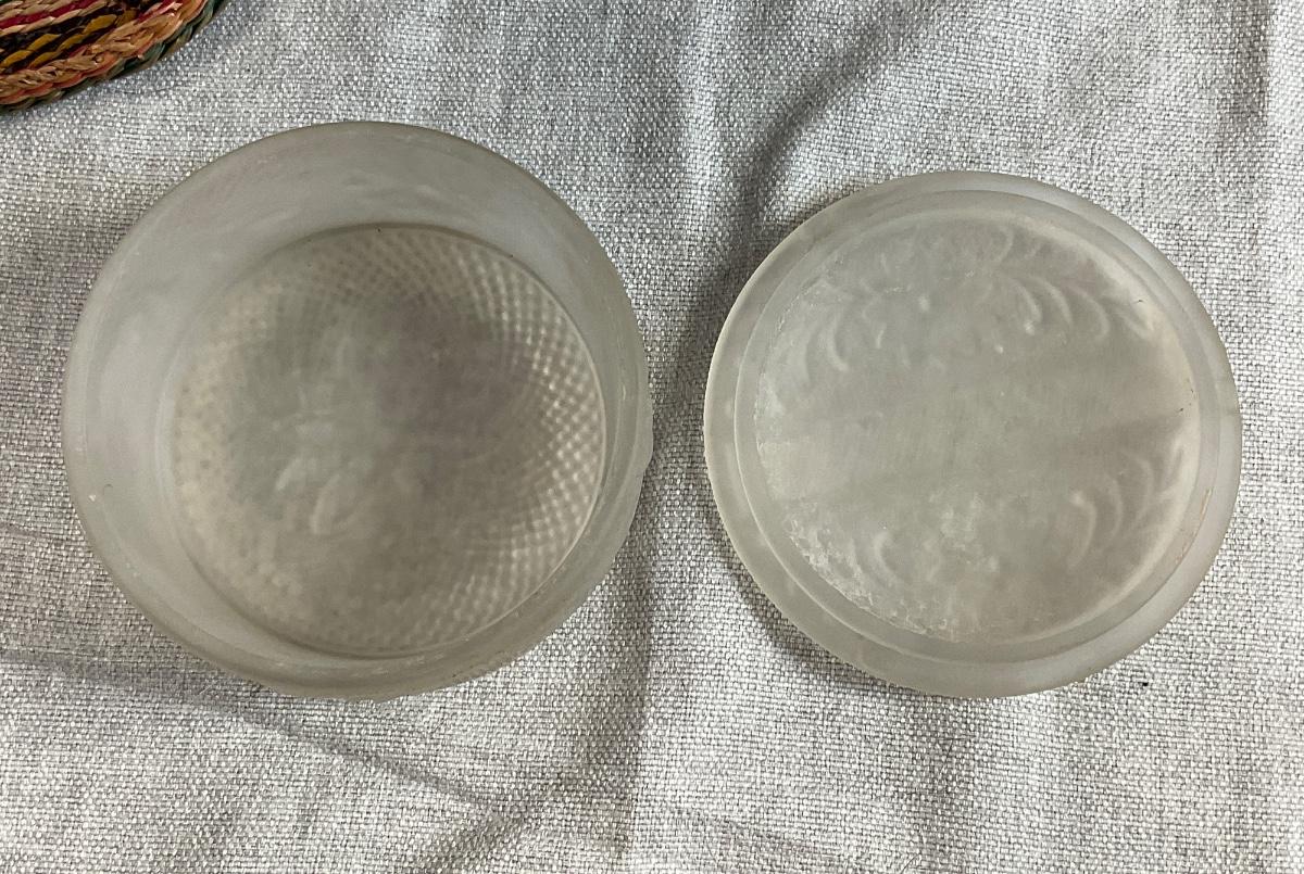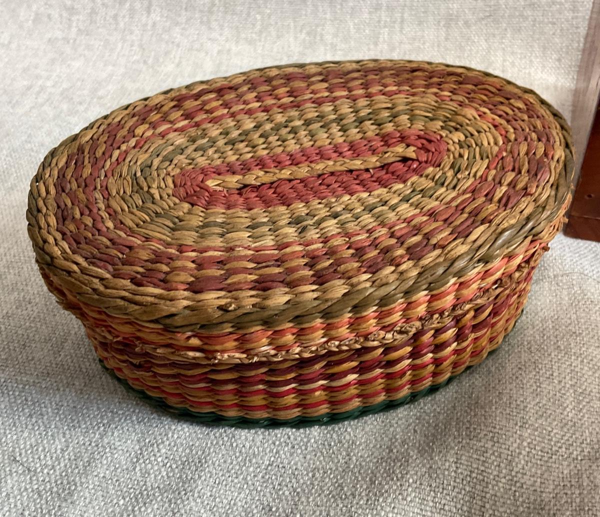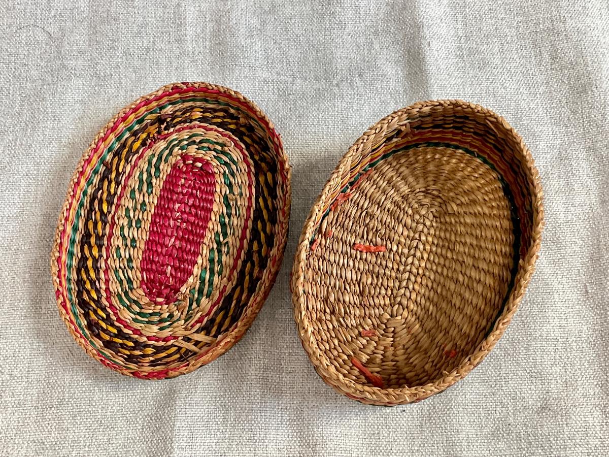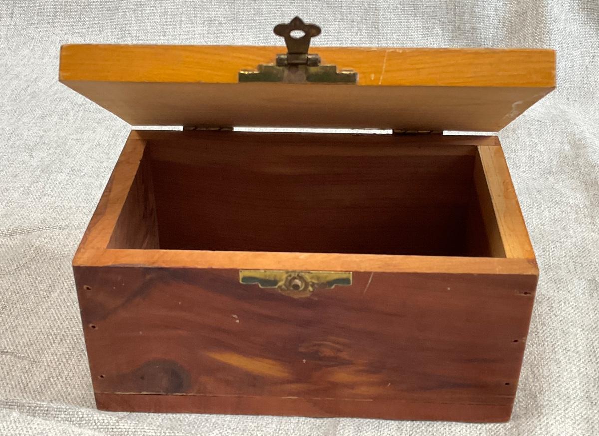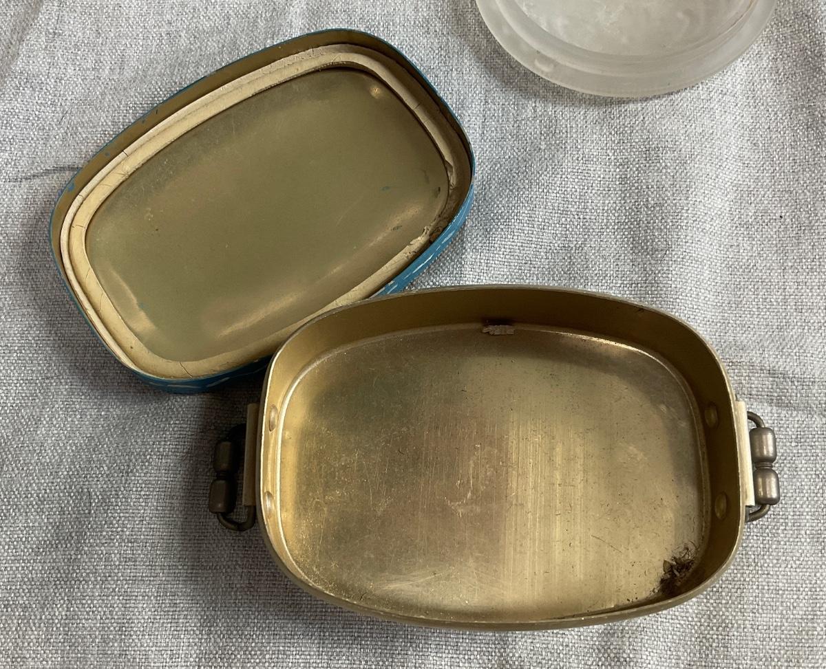 Trinket Box Lot, vintage wood treasure bow, glass powder jar, tin can, multicolored basket box
