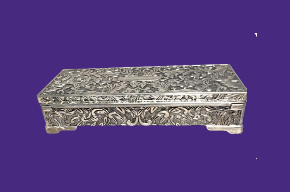 5. Vintage Godinger Silver Art Co Ltd - Cast Metal Ornate Motif Jewelry Box w/ Mirror (9"L x 1.75"H x 3.5"W)