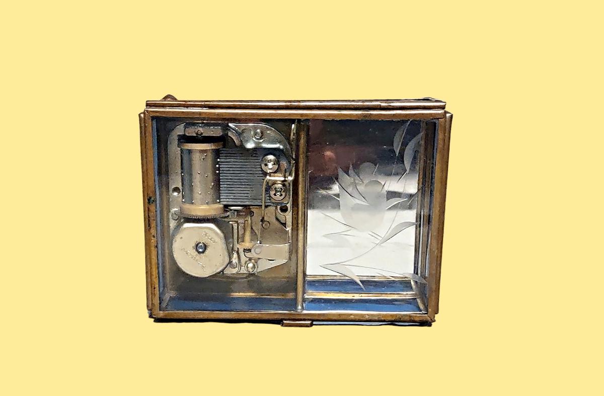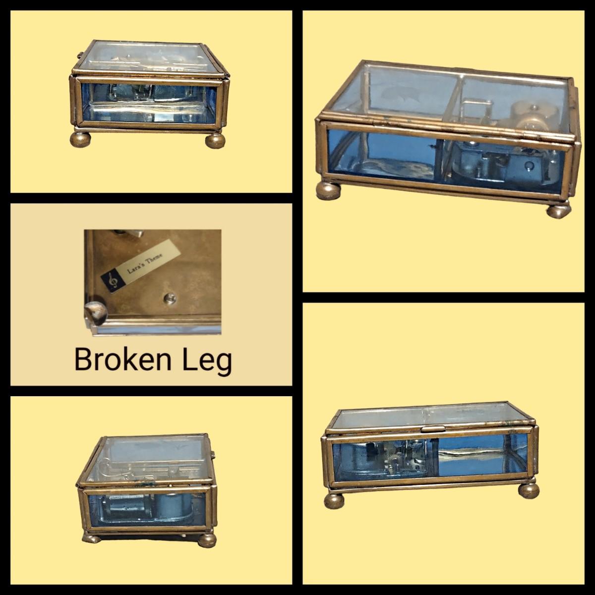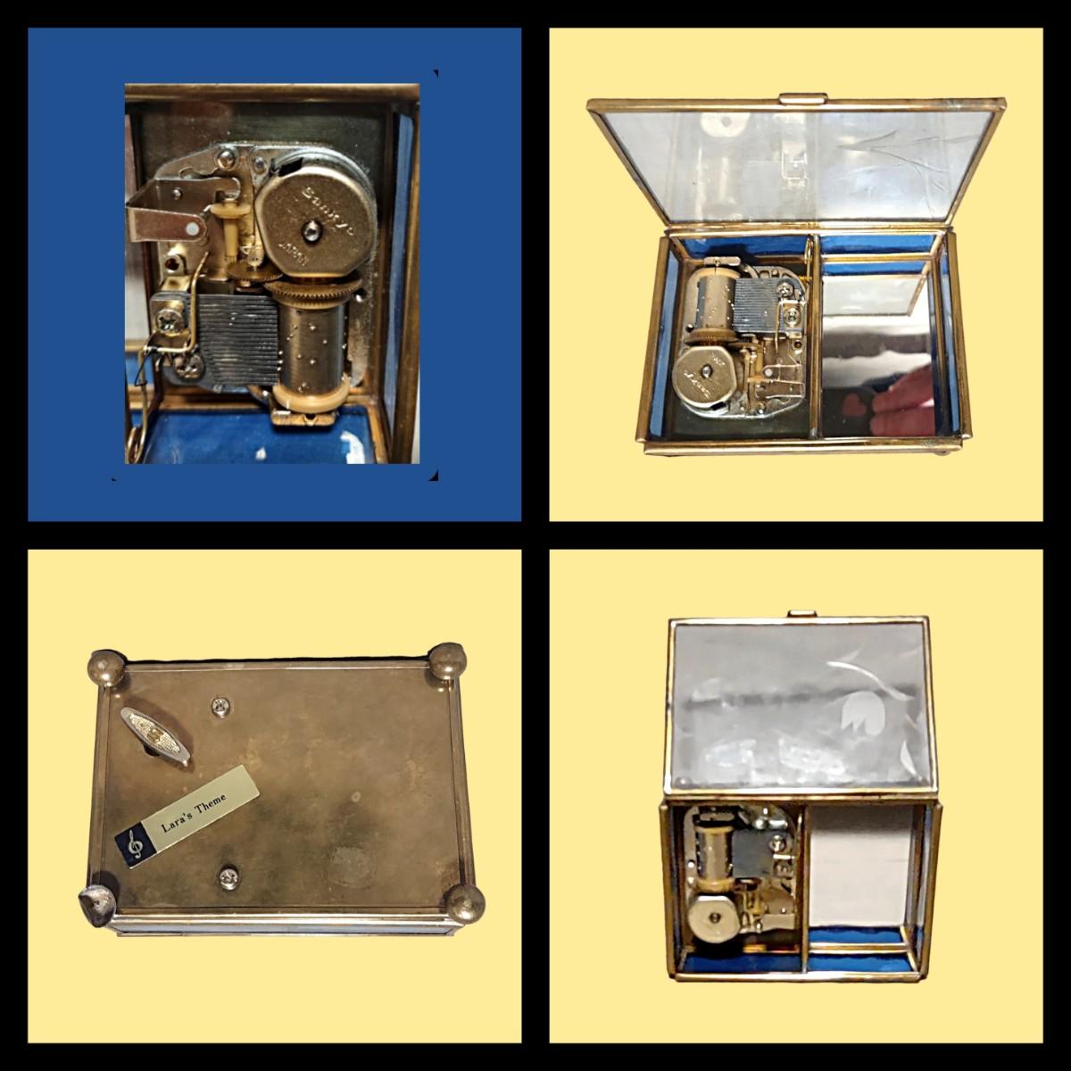 6. Vintage Sankyo Music Trnket Box - Brass & Etched Glass, Plays Lara's Theme, Has 1 Broken Foot (4"L x 1.5"H x 3"W)