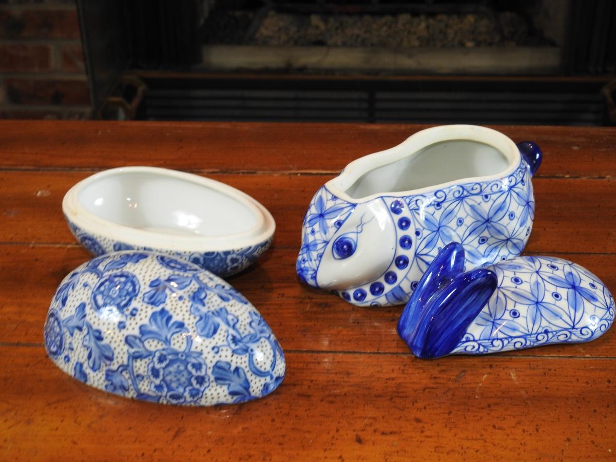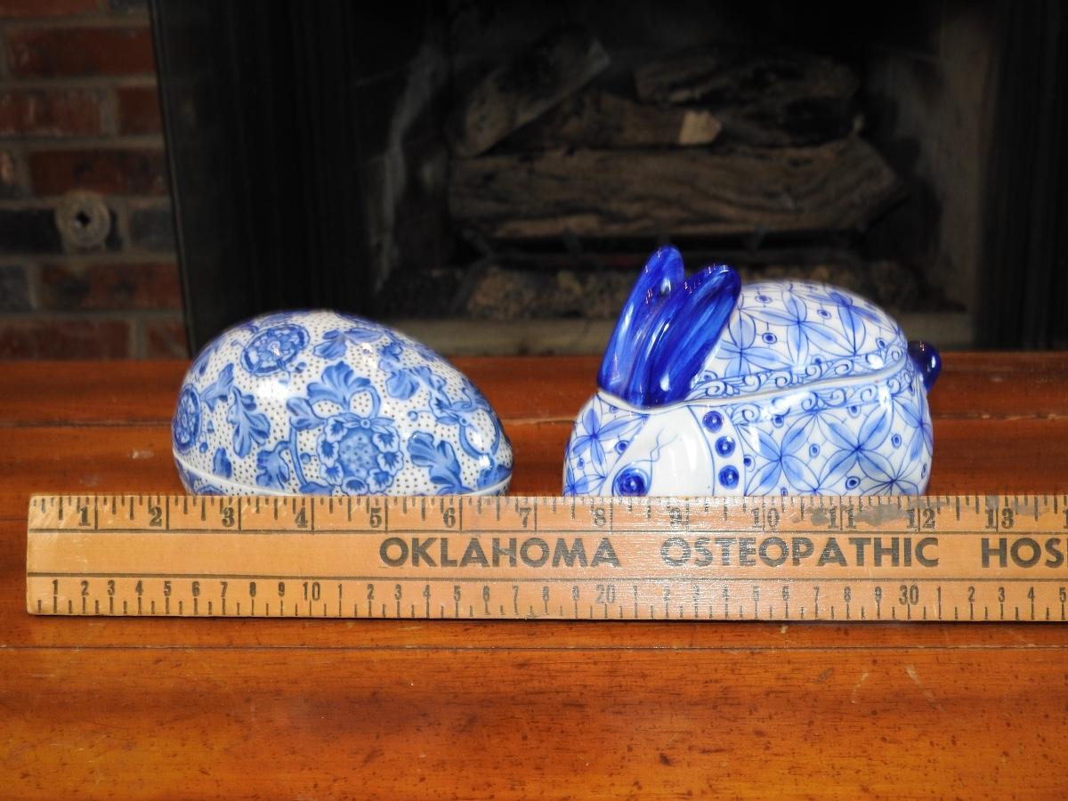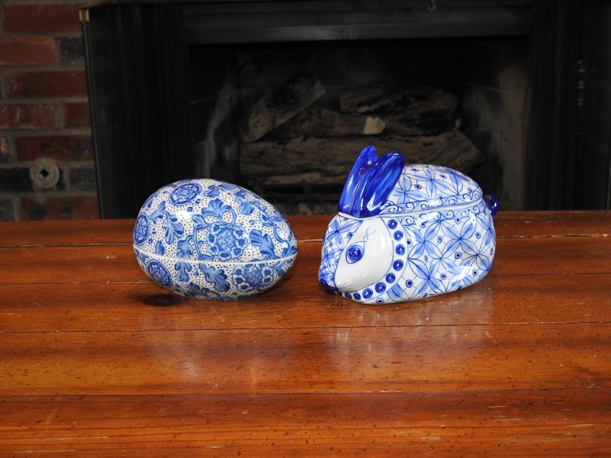 Ceramic trinket boxes. Beautiful blue and white bunny, and flowered egg. Good used condition.