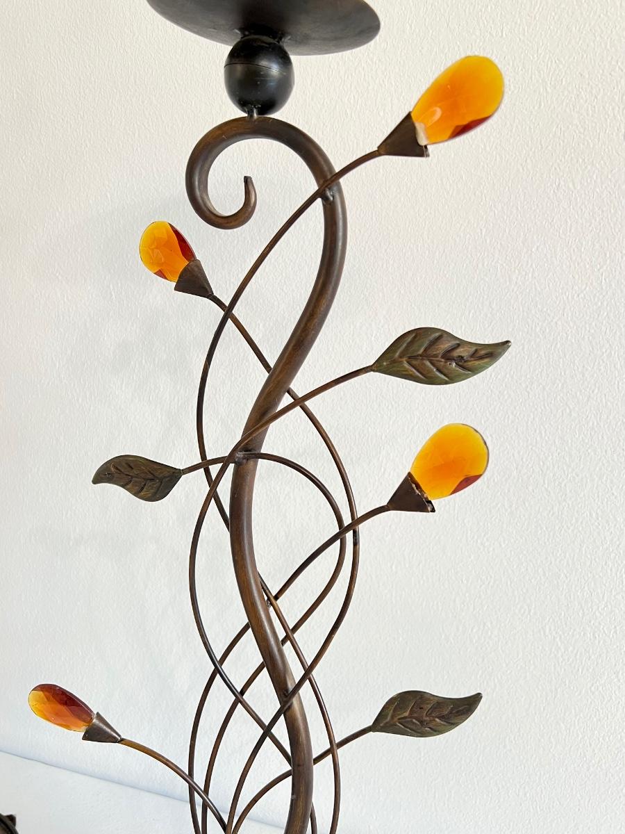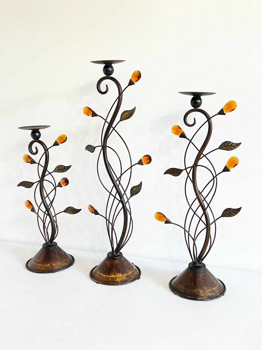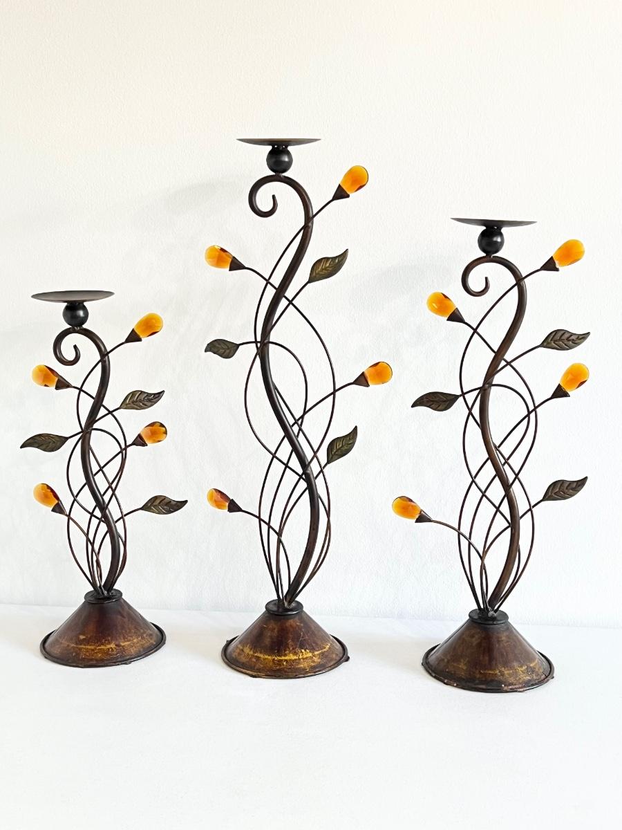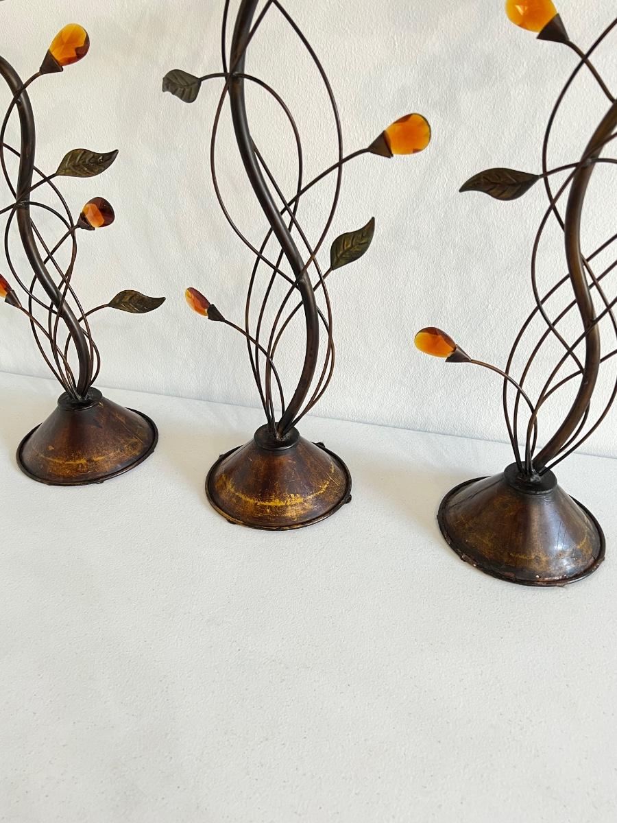 Trio (3) ~ Distressed Metal Floral Candle Holders with Amber Glass Floral Bulbs ~ *Read Details