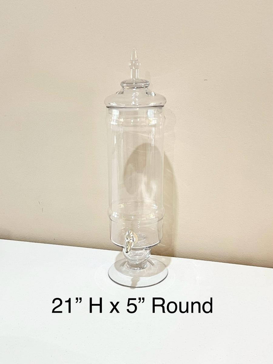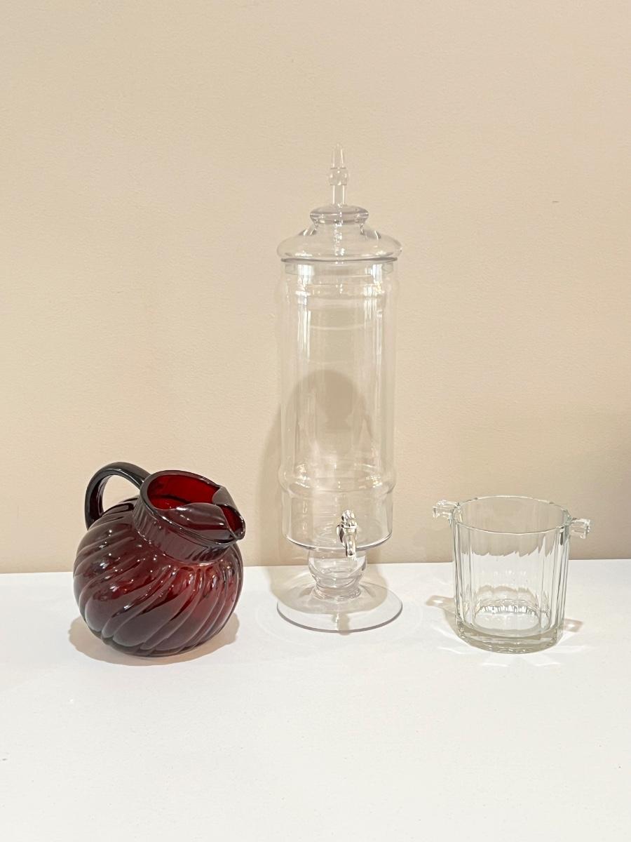 Includes: lidded glass dispenser, pitcher, & ice bucket