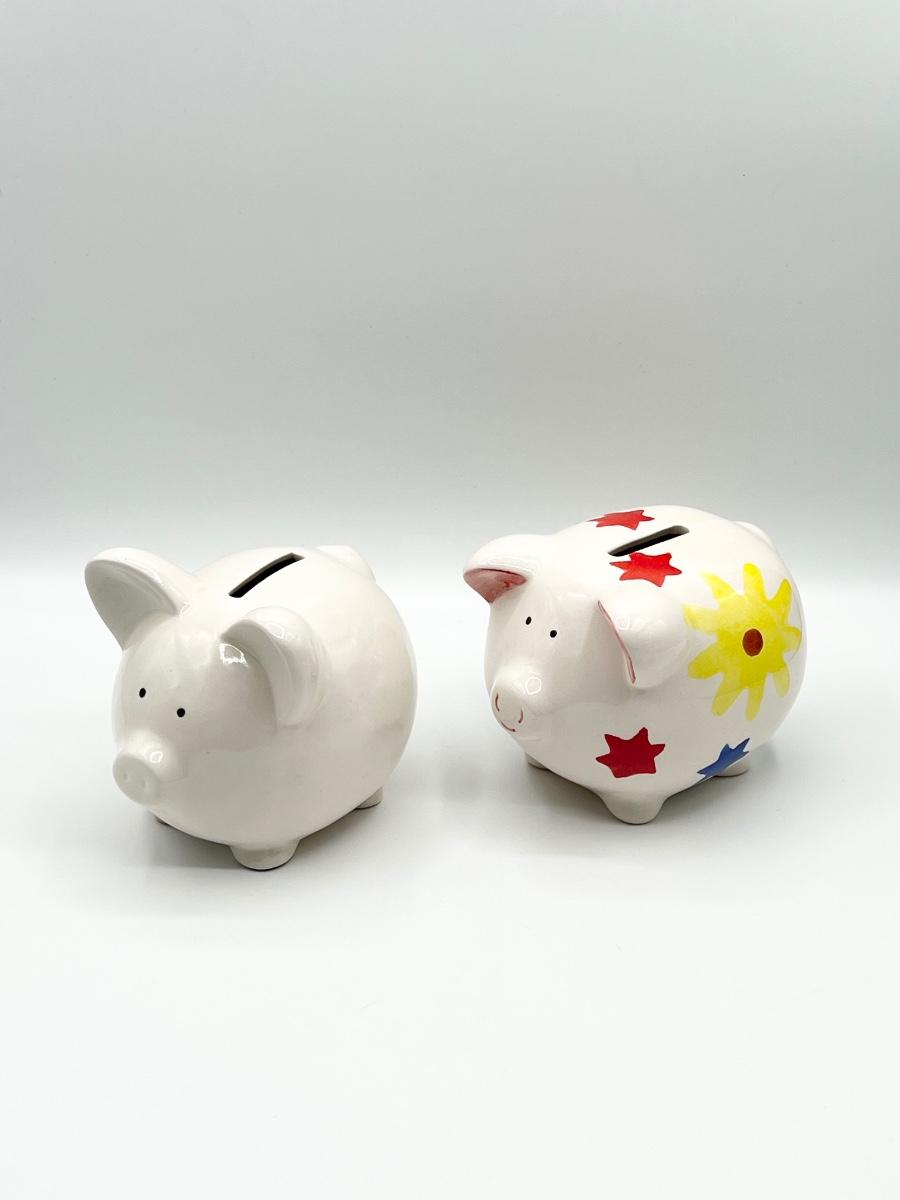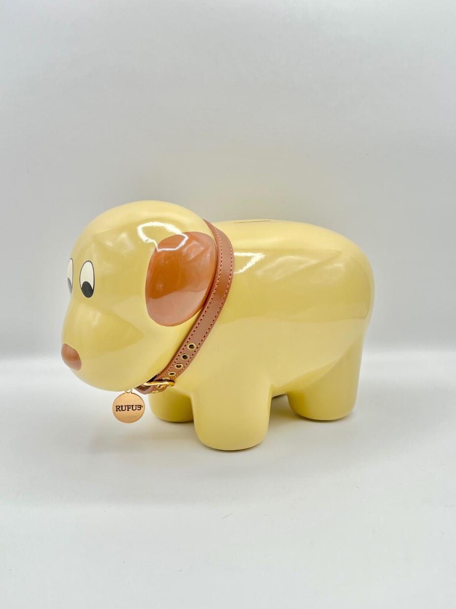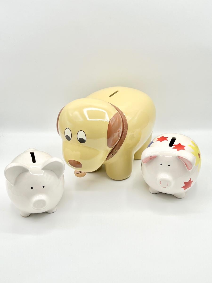 Dog bank is made of a hard plastic material & the 2 pigs are ceramic