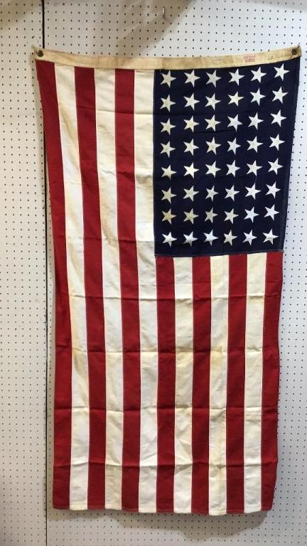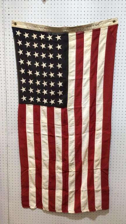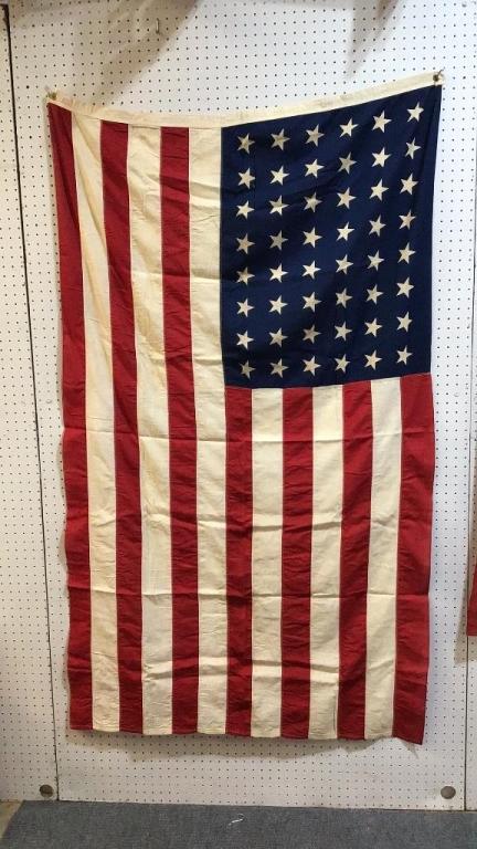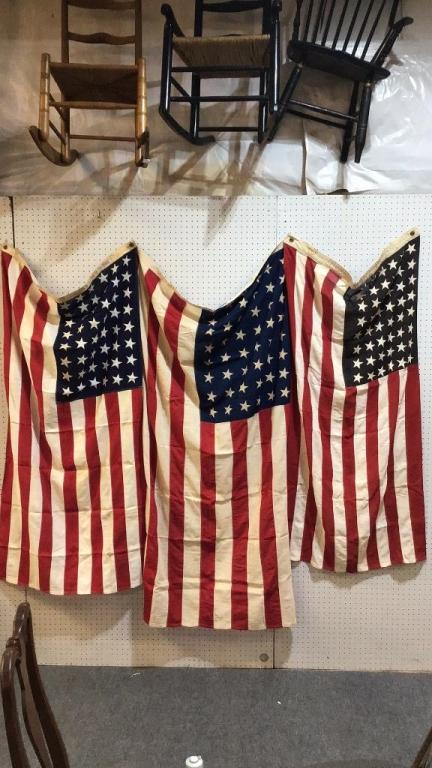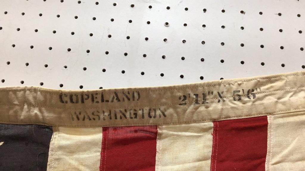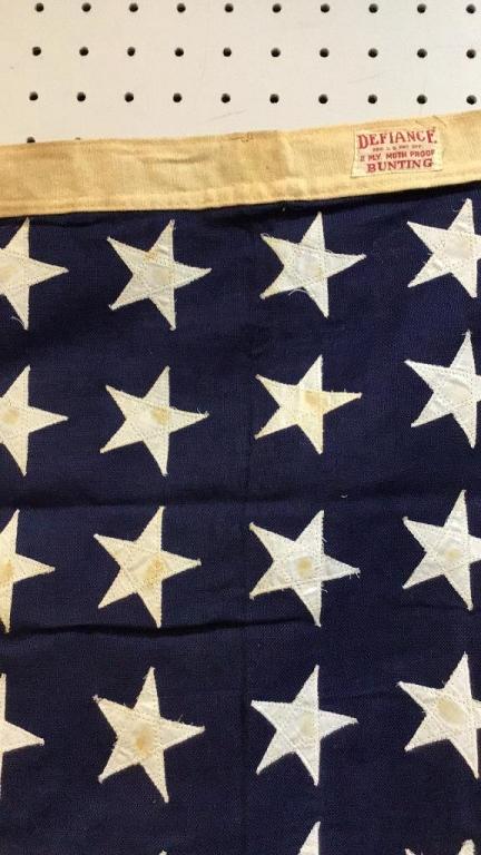 Early to Mid 20th century..Defiance flag wool bunting 35 x 64..cotton flag with printed stars 42 x 70..Copeland Washington wool bunting flag..stains, holes, loose seams commensurate with age, use, and storage.