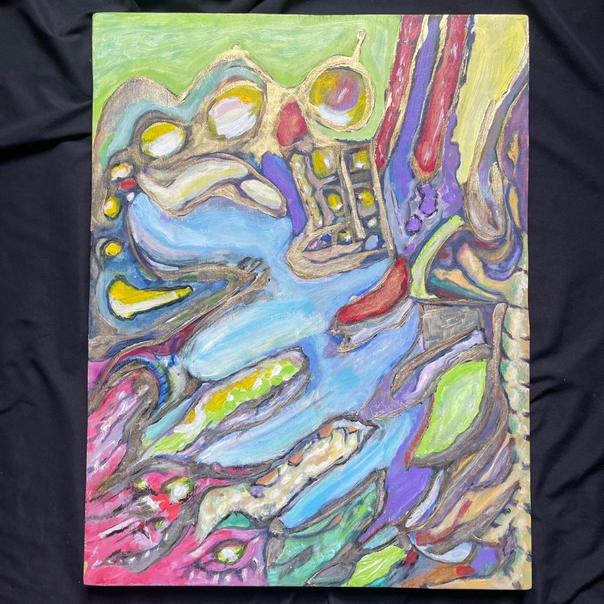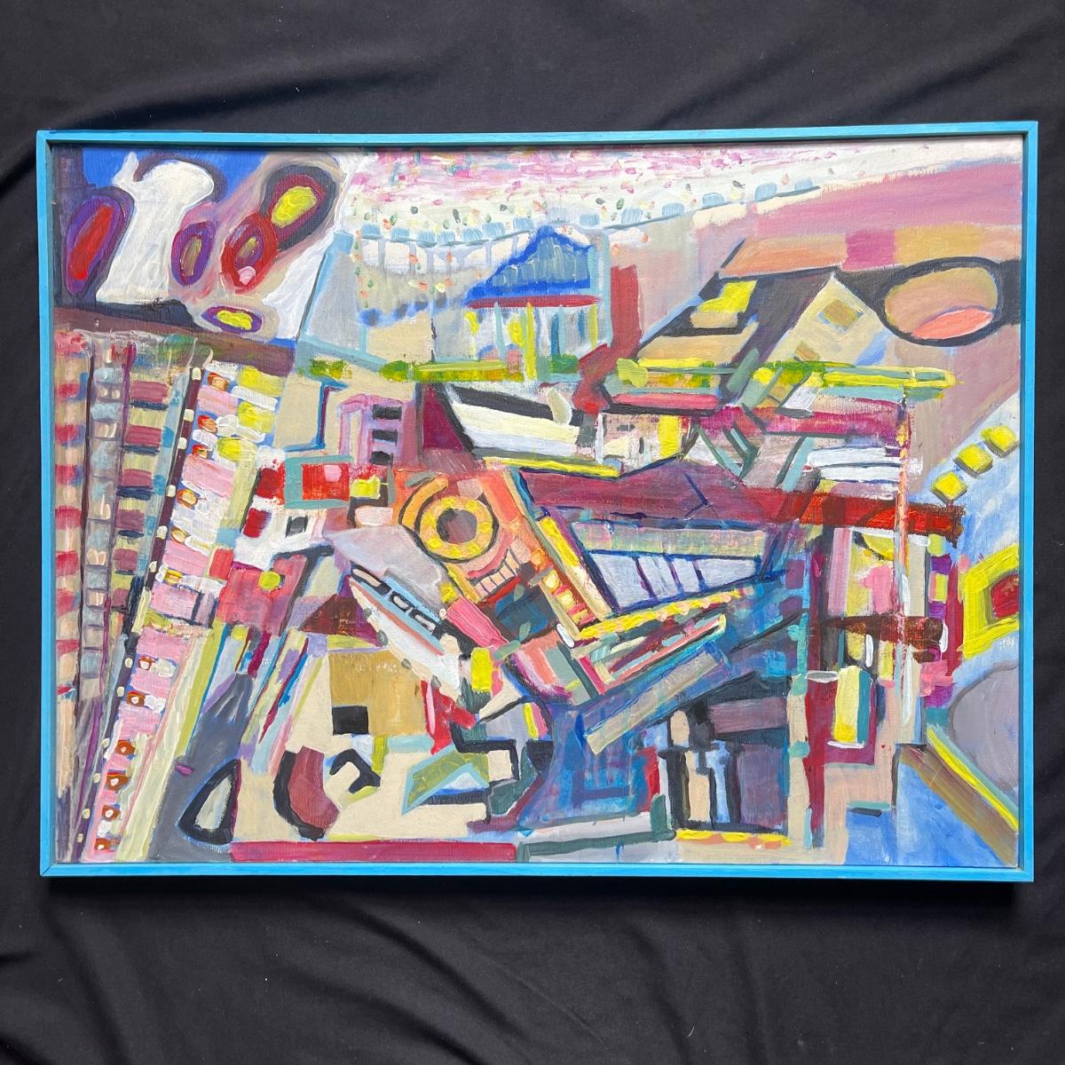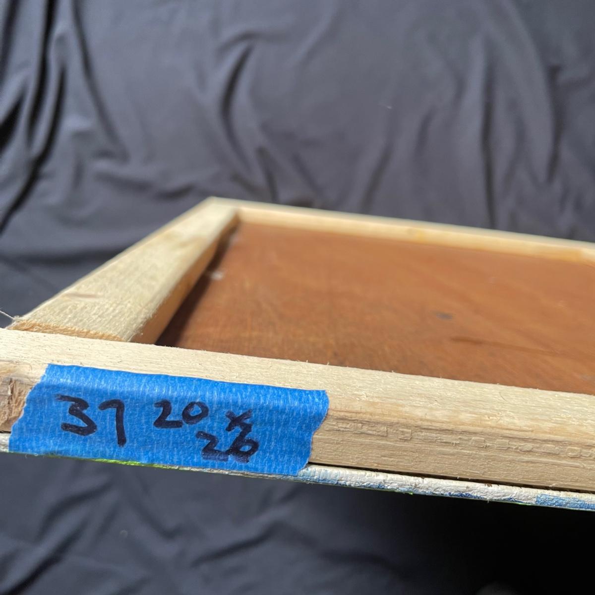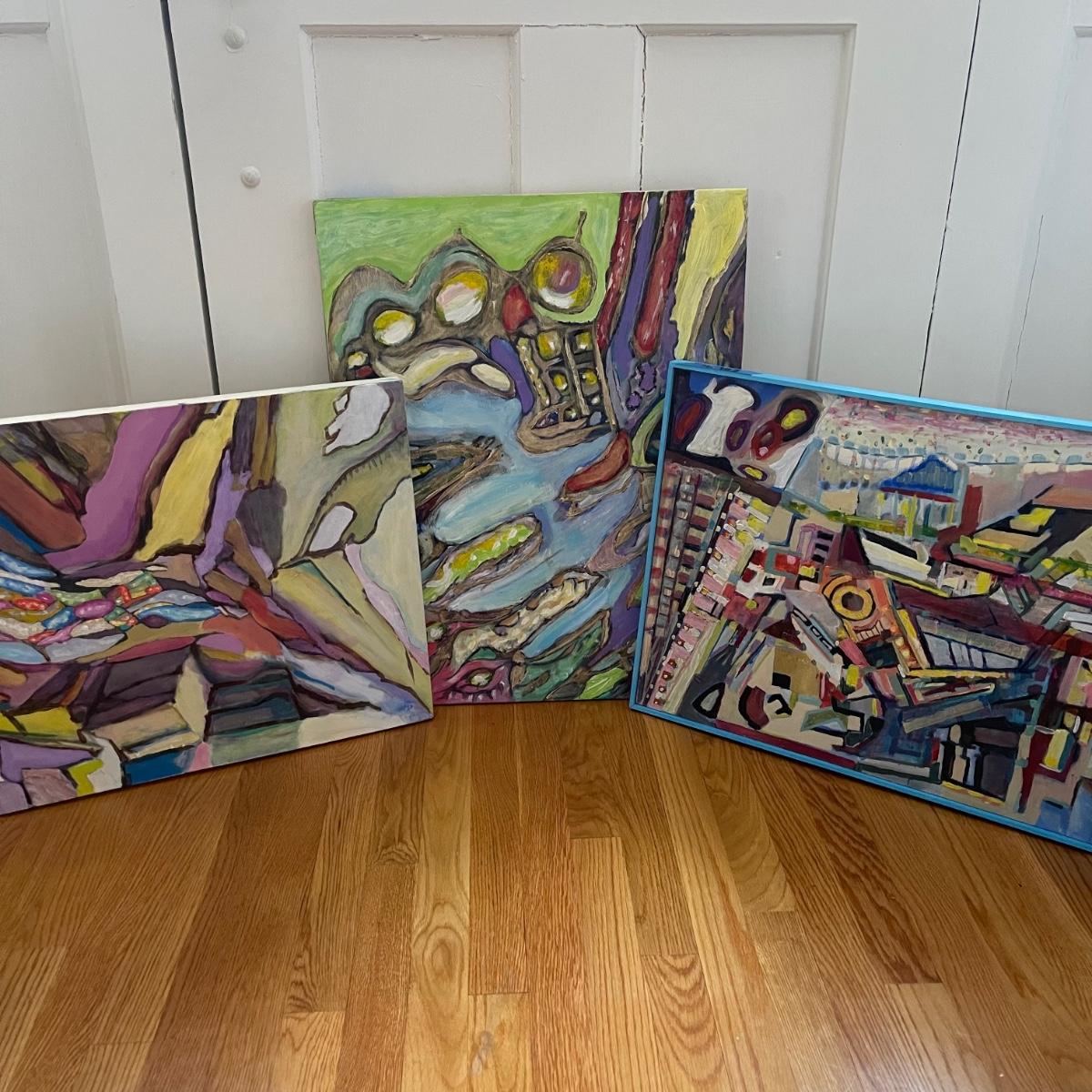 Three abstract paintings by Asheville artist Reginald “Ripp” Smith. The first painting is 20” x 26”, canvas, and numbered 37. Second is #47 measuring 18” x 24” and painted on wood. The third painting is 18.5” x 24.5”, canvas, and numbered 16.