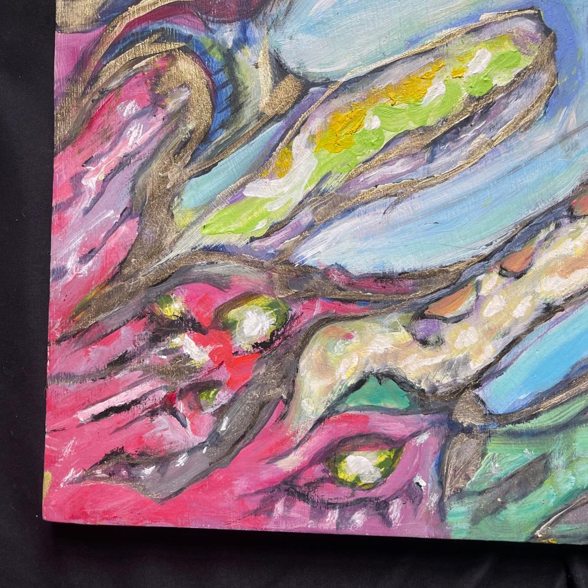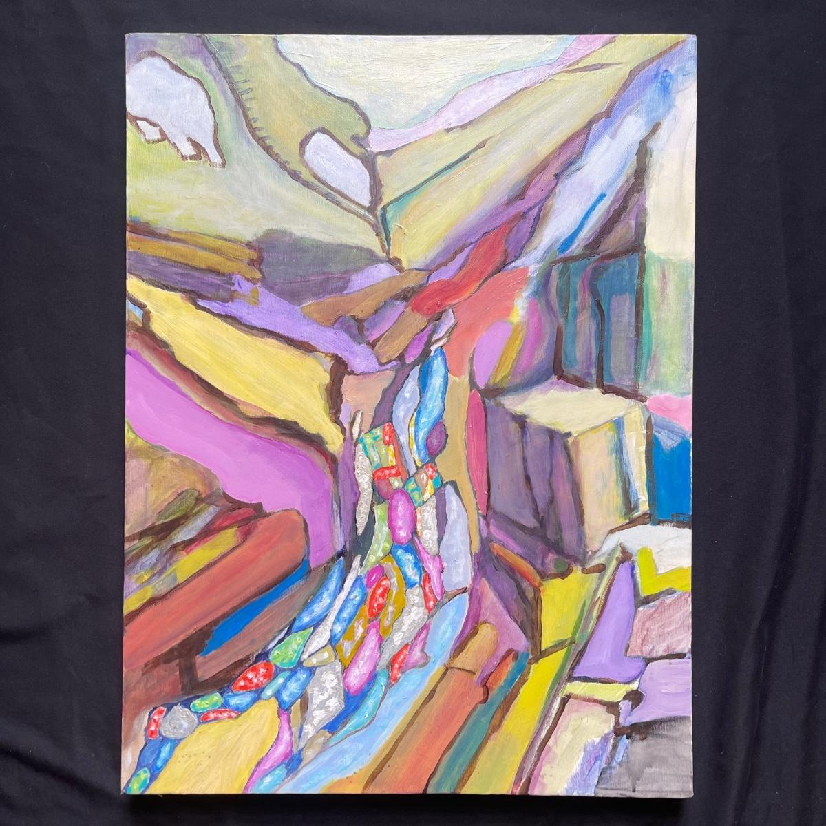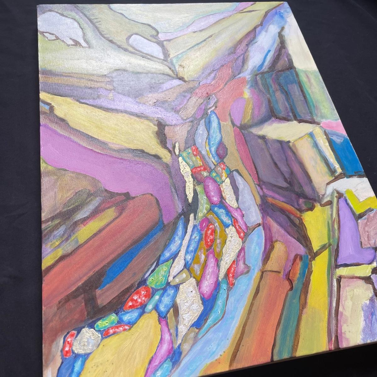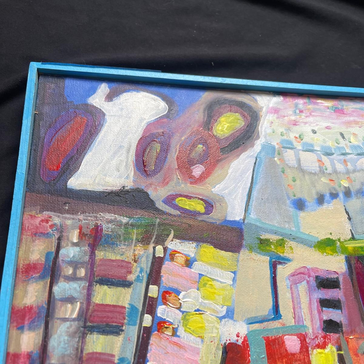 Three abstract paintings by Asheville artist Reginald “Ripp” Smith. The first painting is 20” x 26”, canvas, and numbered 37. Second is #47 measuring 18” x 24” and painted on wood. The third painting is 18.5” x 24.5”, canvas, and numbered 16.