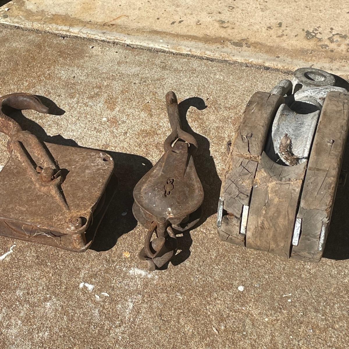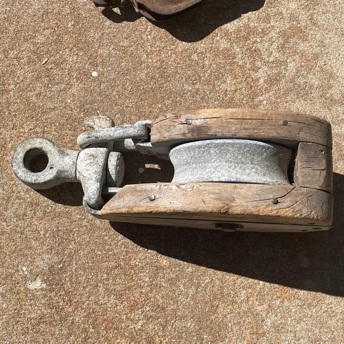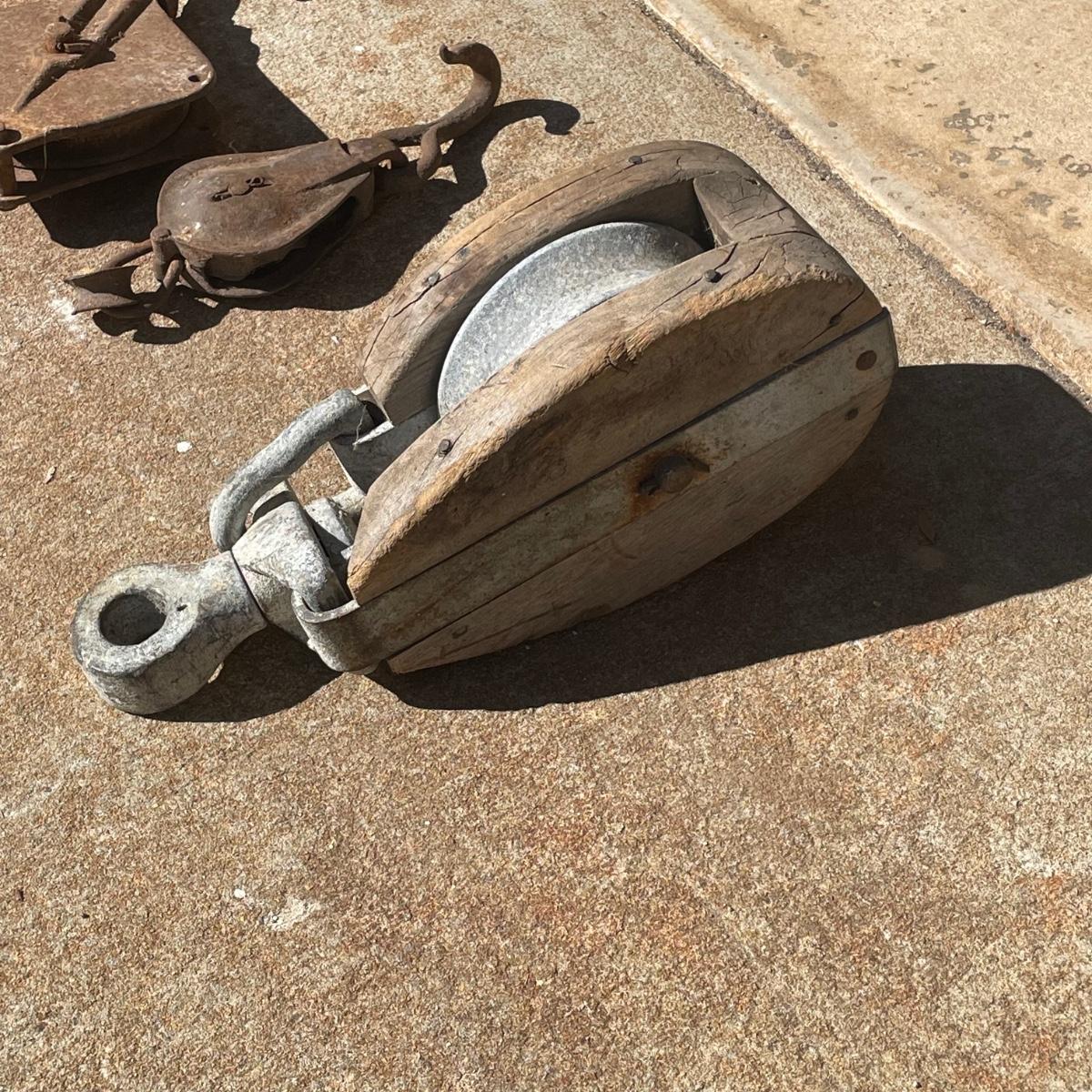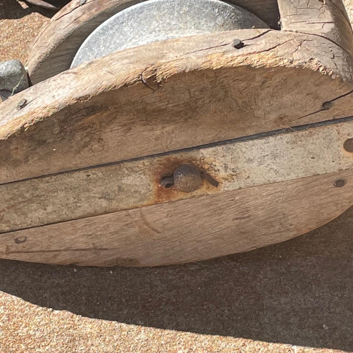 The two smallest pulley’s in this lot of three are all metal. The largest is metal and wood and measures 17.5” x 8 x 5”.