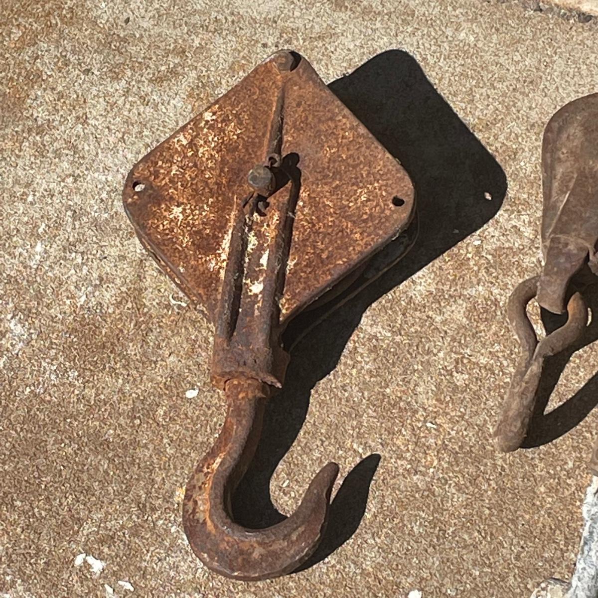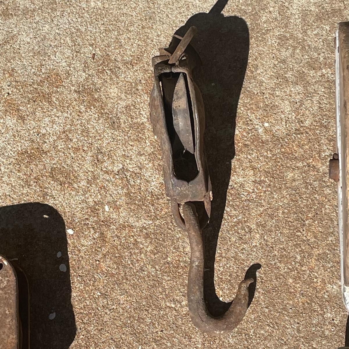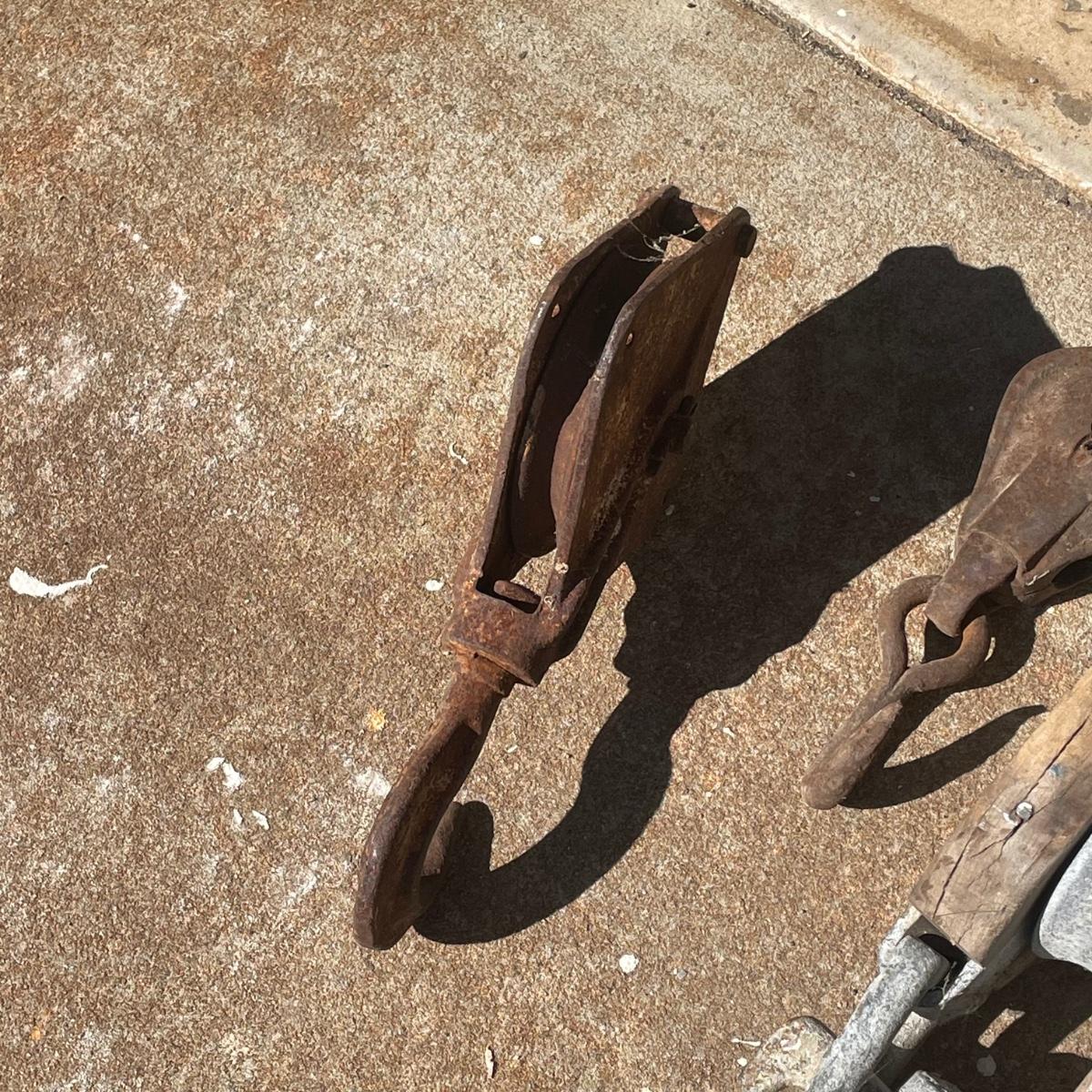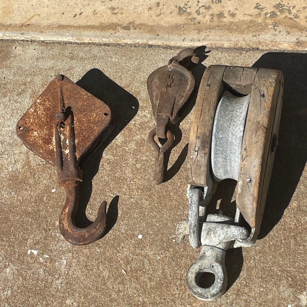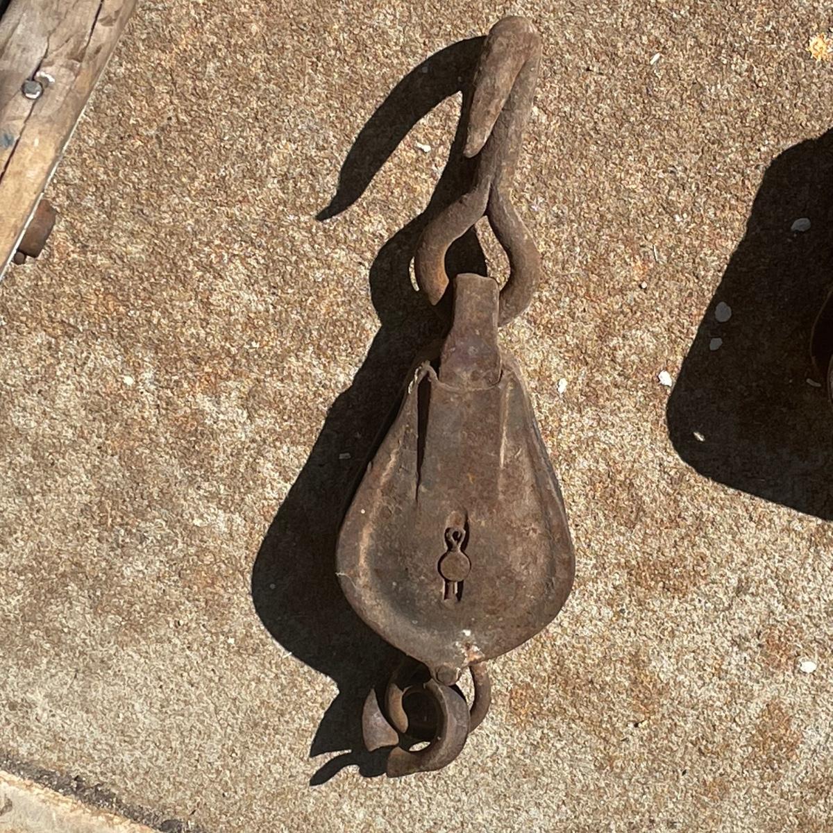 The two smallest pulley’s in this lot of three are all metal. The largest is metal and wood and measures 17.5” x 8 x 5”.