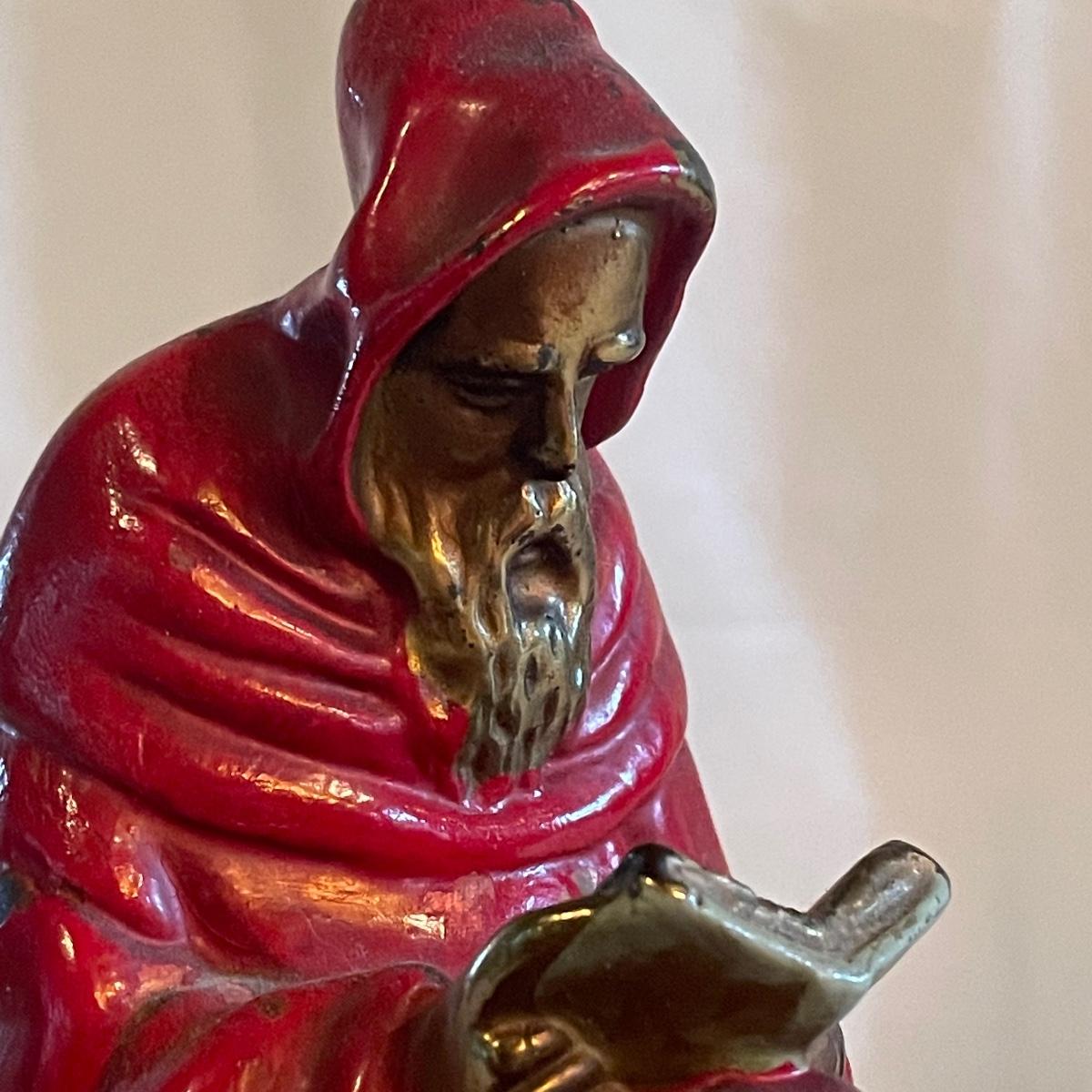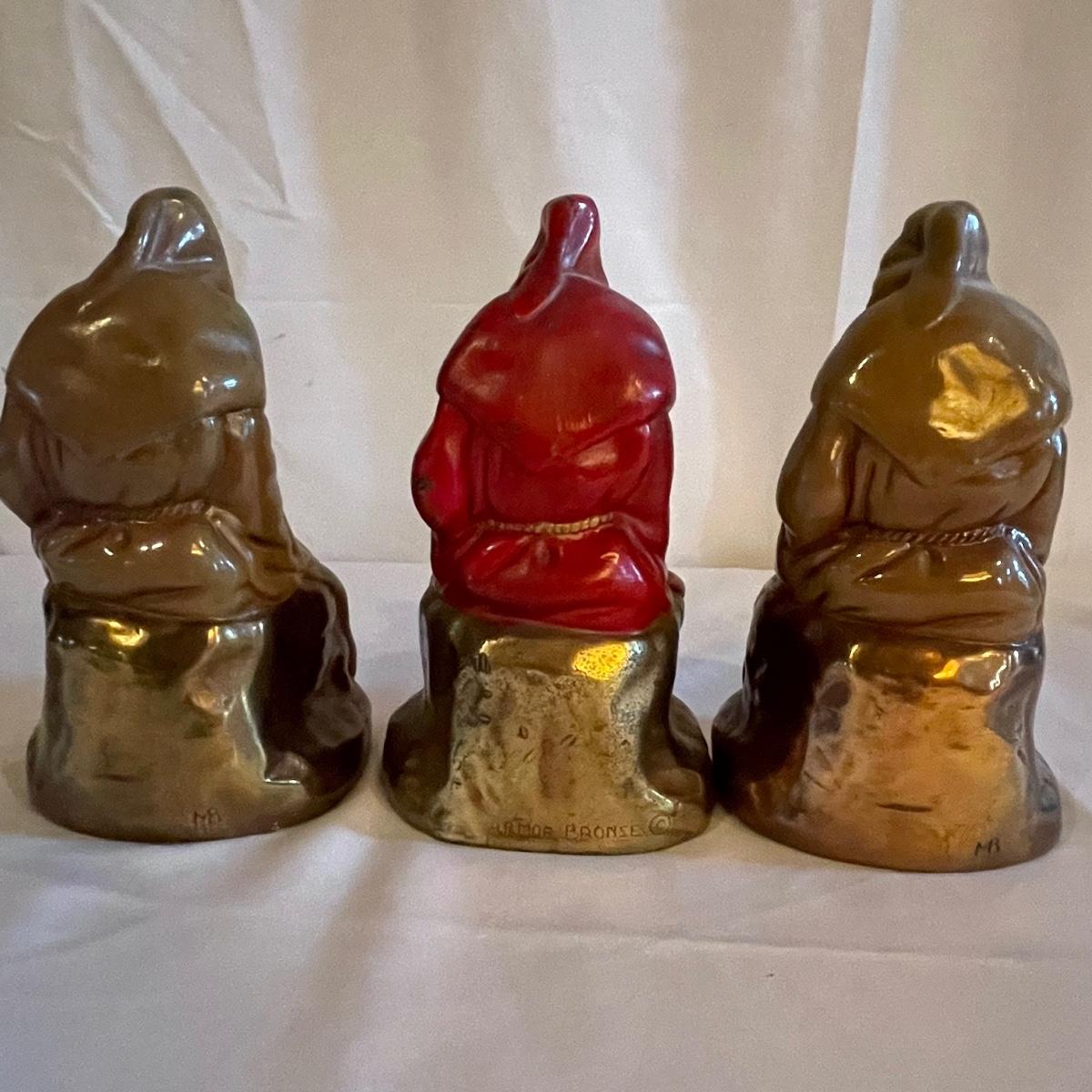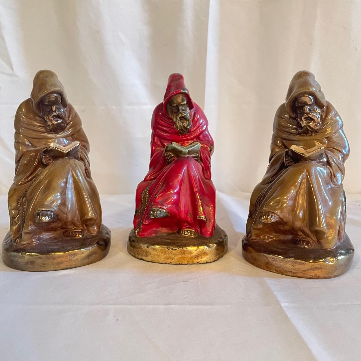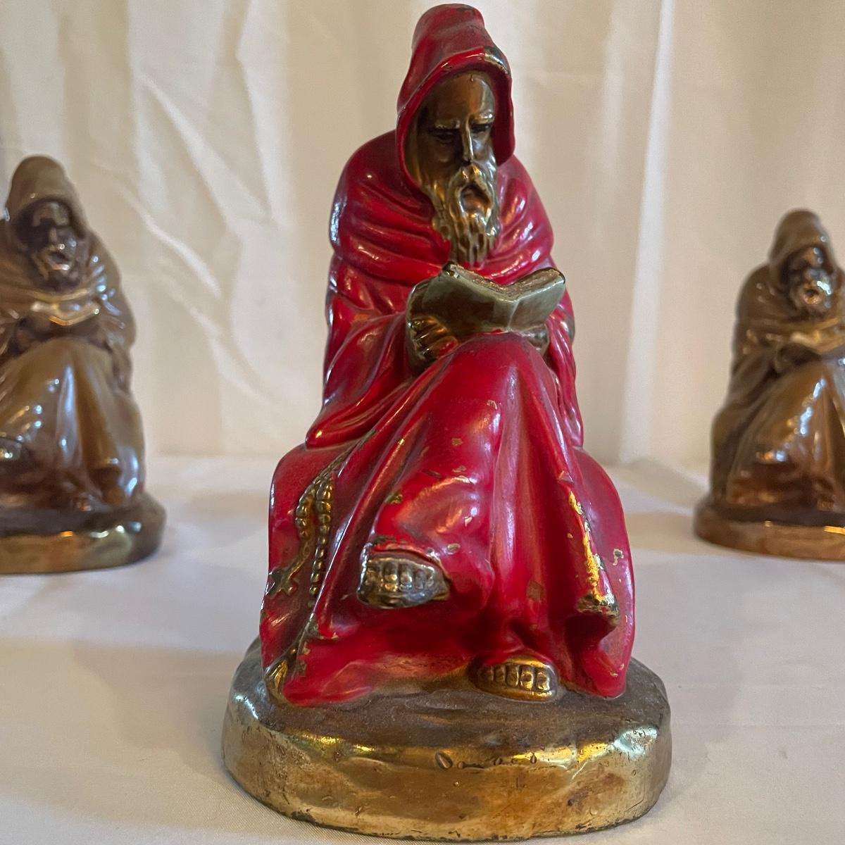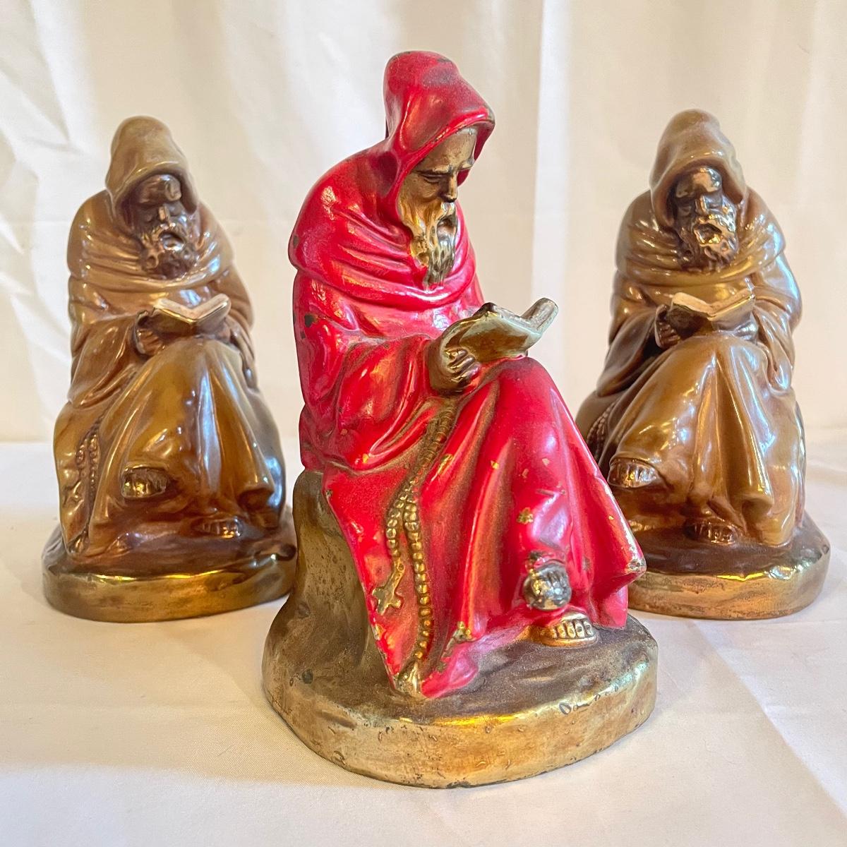 These three statues are all of a reading monk; they appear to be identical however the red robed monk statue has Armor Bronze stamped into the brass base and the other two tan robed ones have the initials MB, see images. They are heavy statues that appear to be made of brass and measure 4” diameter x 7” tall. They are in great condition with just some worn marks on the red robed monk.