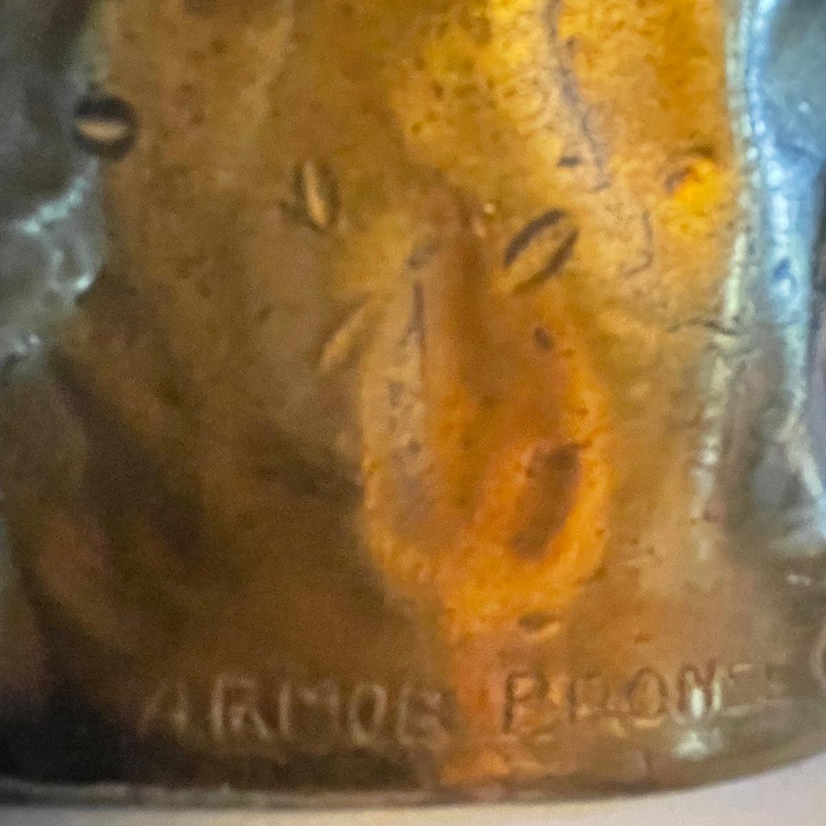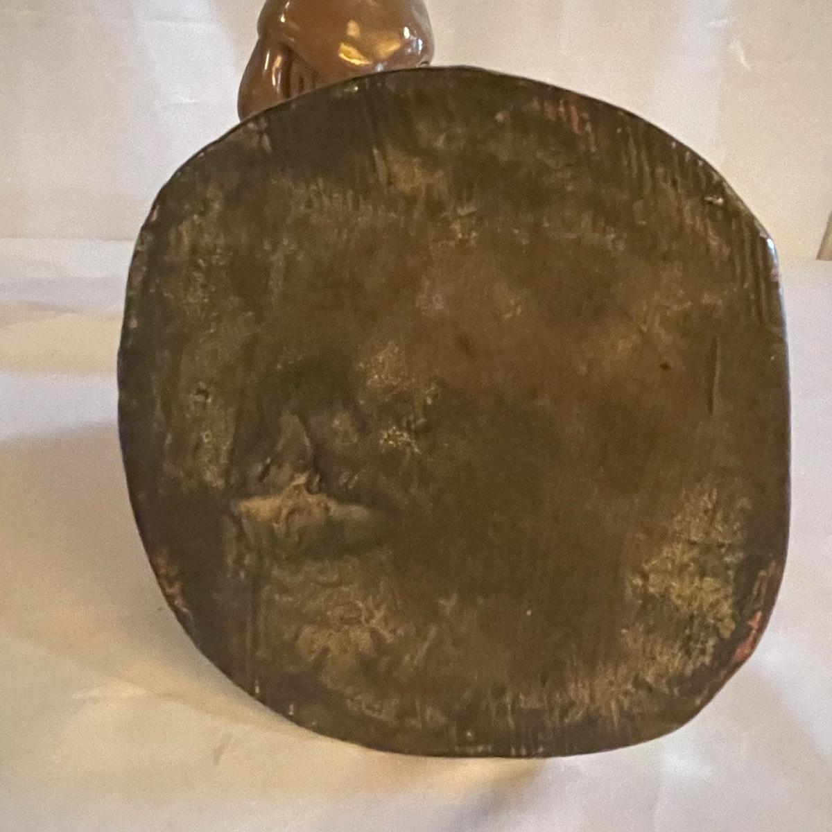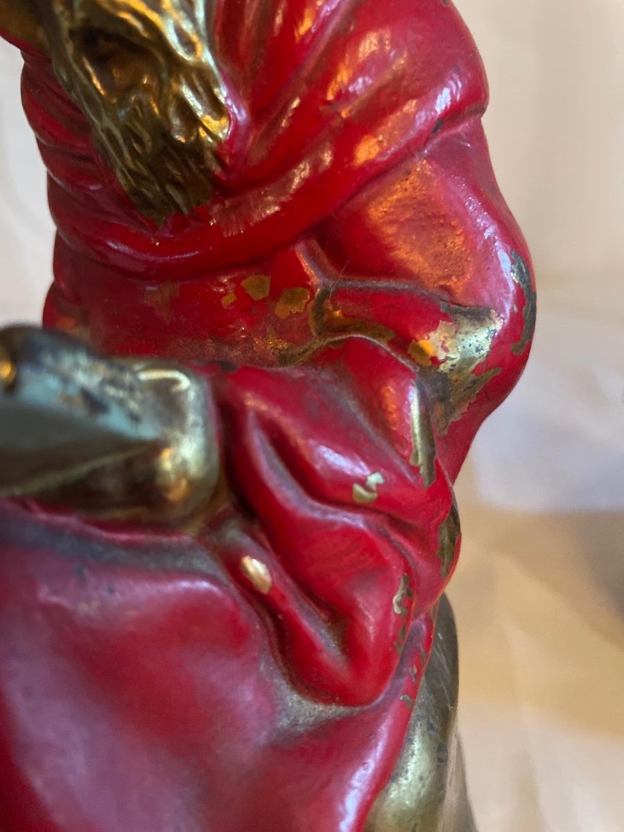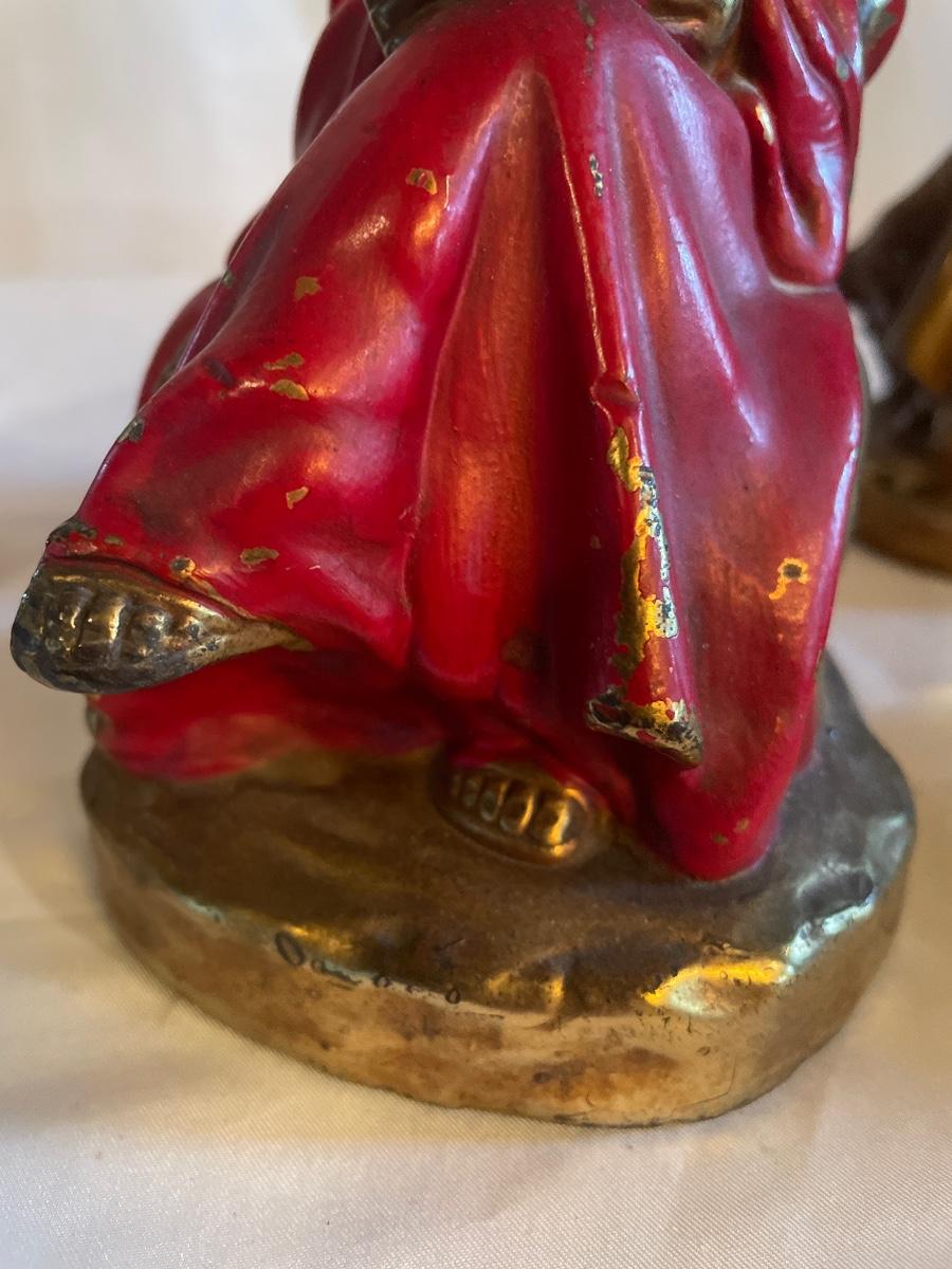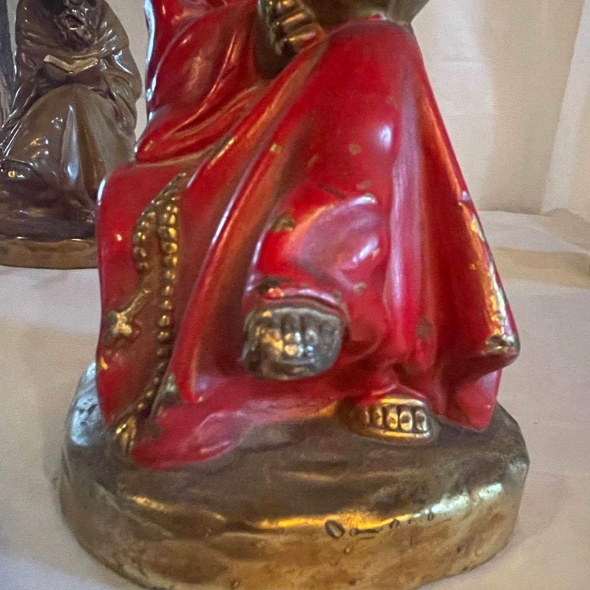 These three statues are all of a reading monk; they appear to be identical however the red robed monk statue has Armor Bronze stamped into the brass base and the other two tan robed ones have the initials MB, see images. They are heavy statues that appear to be made of brass and measure 4” diameter x 7” tall. They are in great condition with just some worn marks on the red robed monk.
