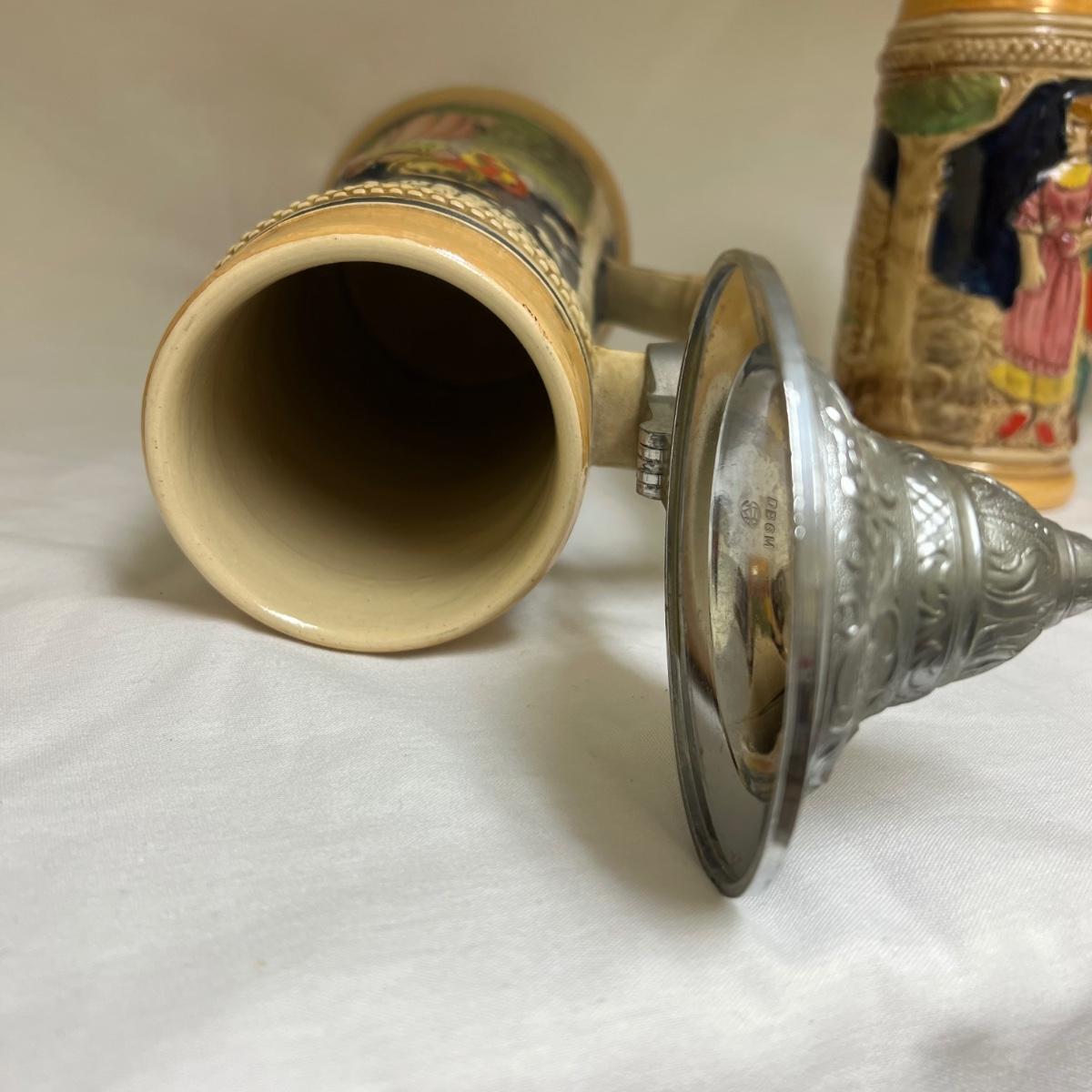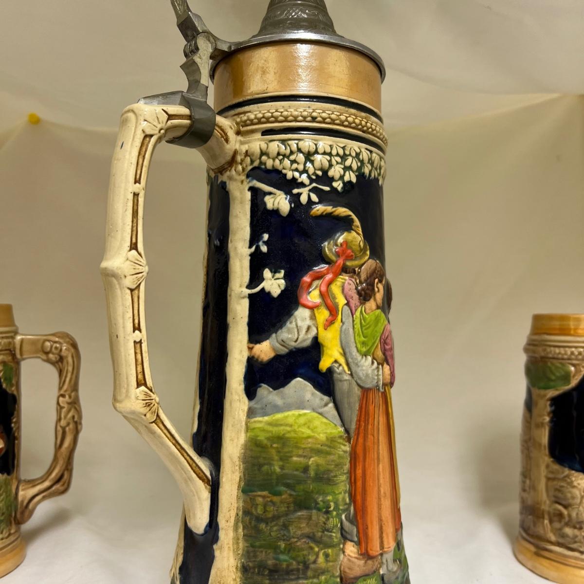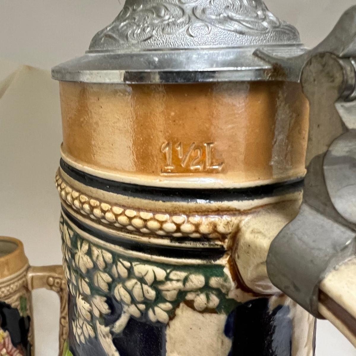 The largest of these three ceramic steins is numbered 3927 and stamped with initials R.M Made in Germany; it holds 1.5 liters and measures 5”D x 15”H. The matching pair of smaller steins have no makers marks.