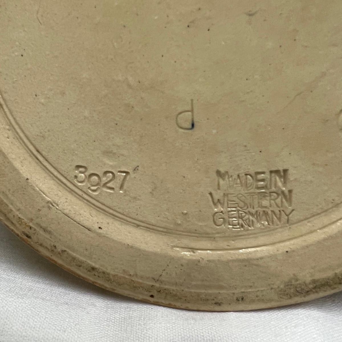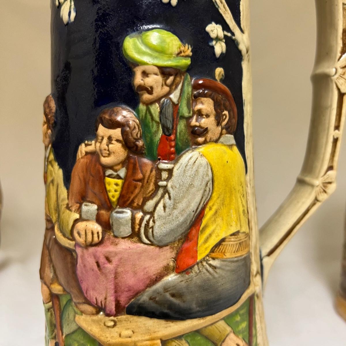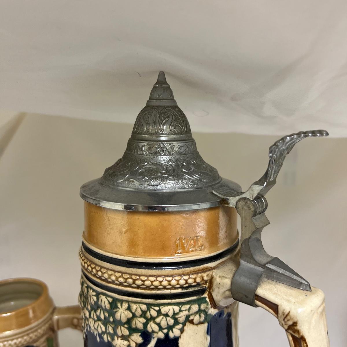 The largest of these three ceramic steins is numbered 3927 and stamped with initials R.M Made in Germany; it holds 1.5 liters and measures 5”D x 15”H. The matching pair of smaller steins have no makers marks.