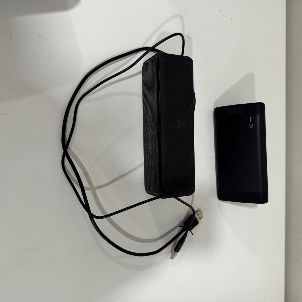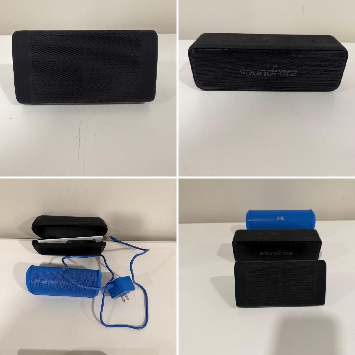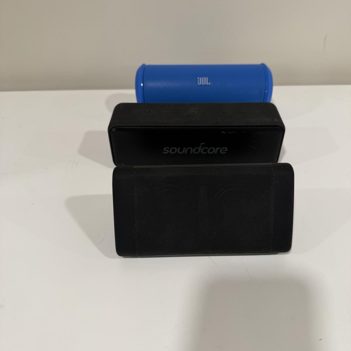 Lot includes a Oontz angle3, Soundcore and JBL Bluetooth speakers. All three powered on when turned on. Soundcore speaker measures 7” x 2” x 2”H.