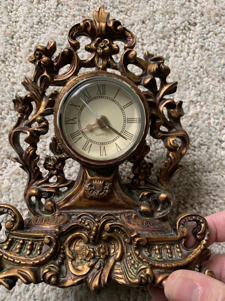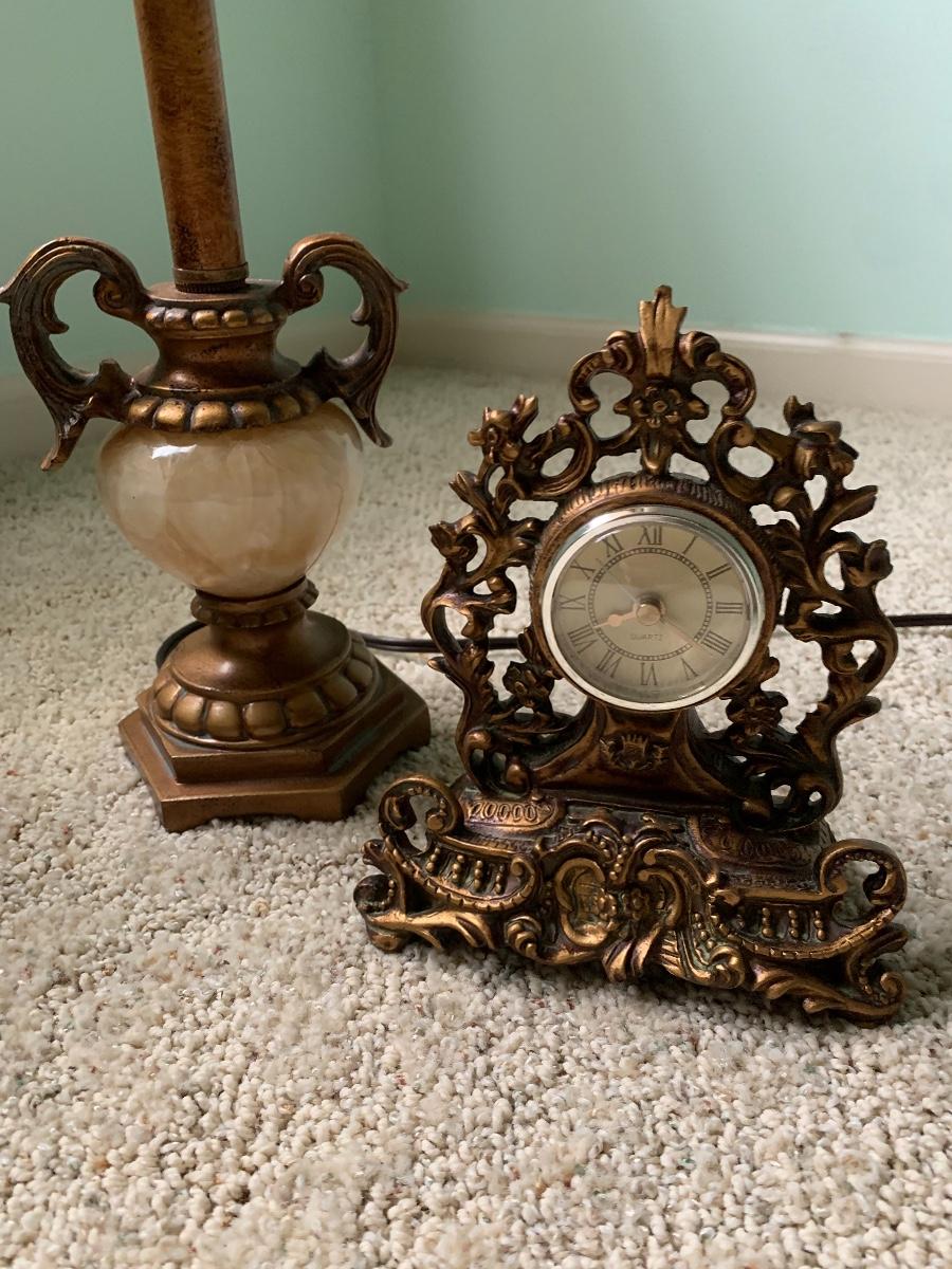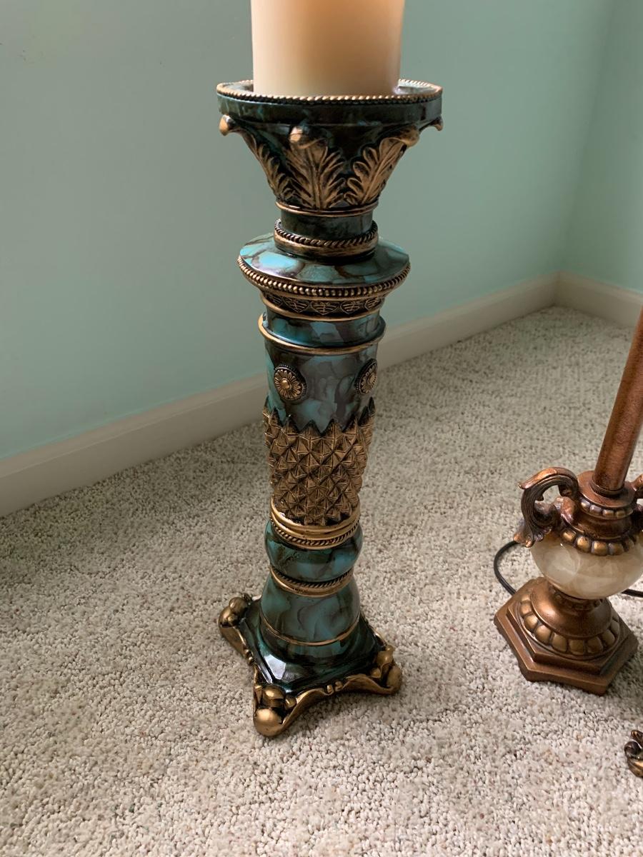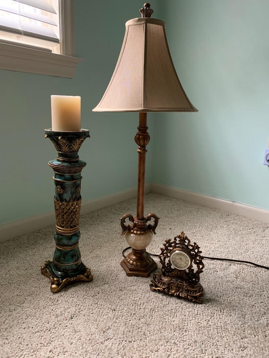 This selection includes a 4” tall quarts desk clock that appears to be made of a molded resin. The candle holder is also a resin with a painted marble design and stands 17.5”. Finally a pillar lamp with a pearlescent stone base stands 29.5”. No markings on any of these. Local pick up