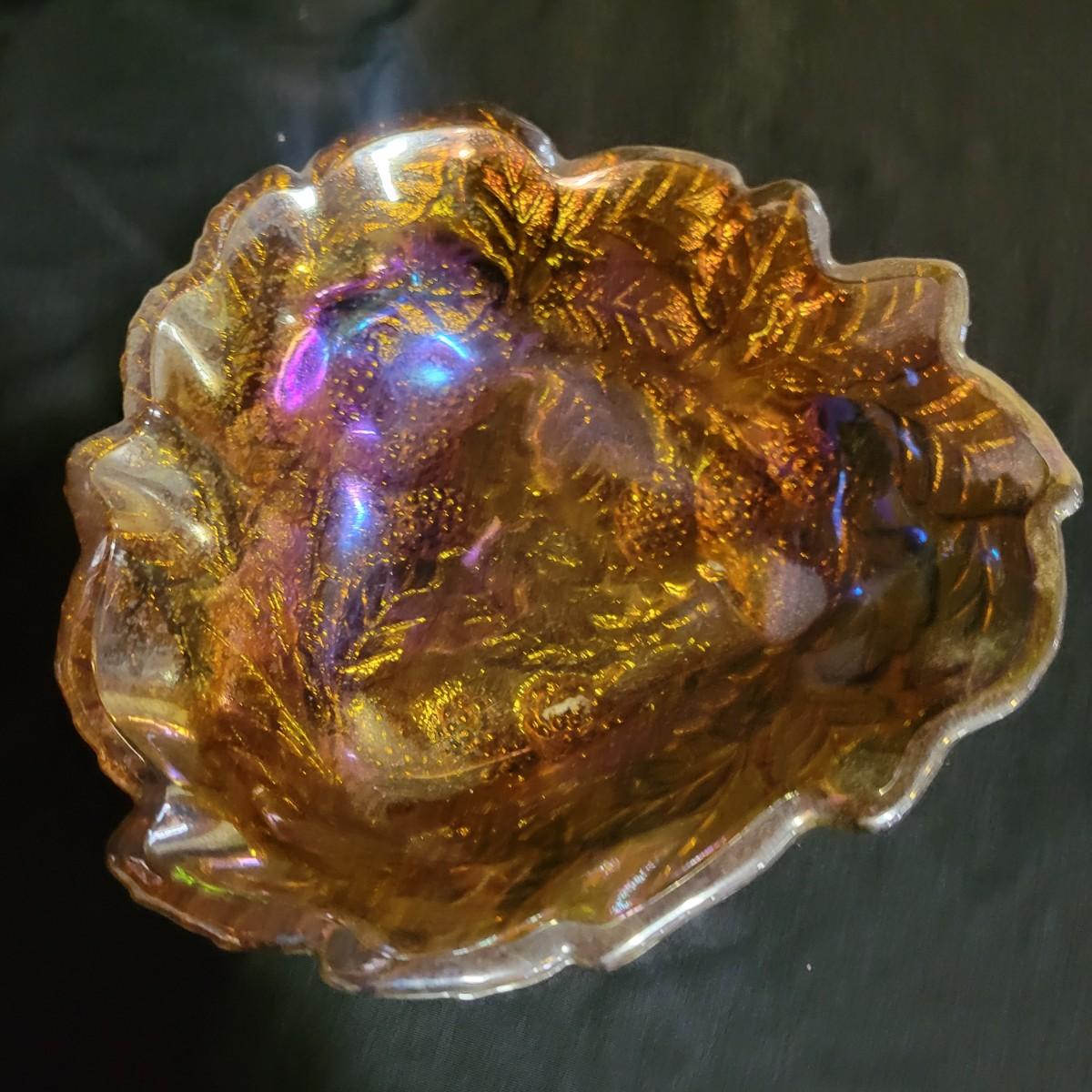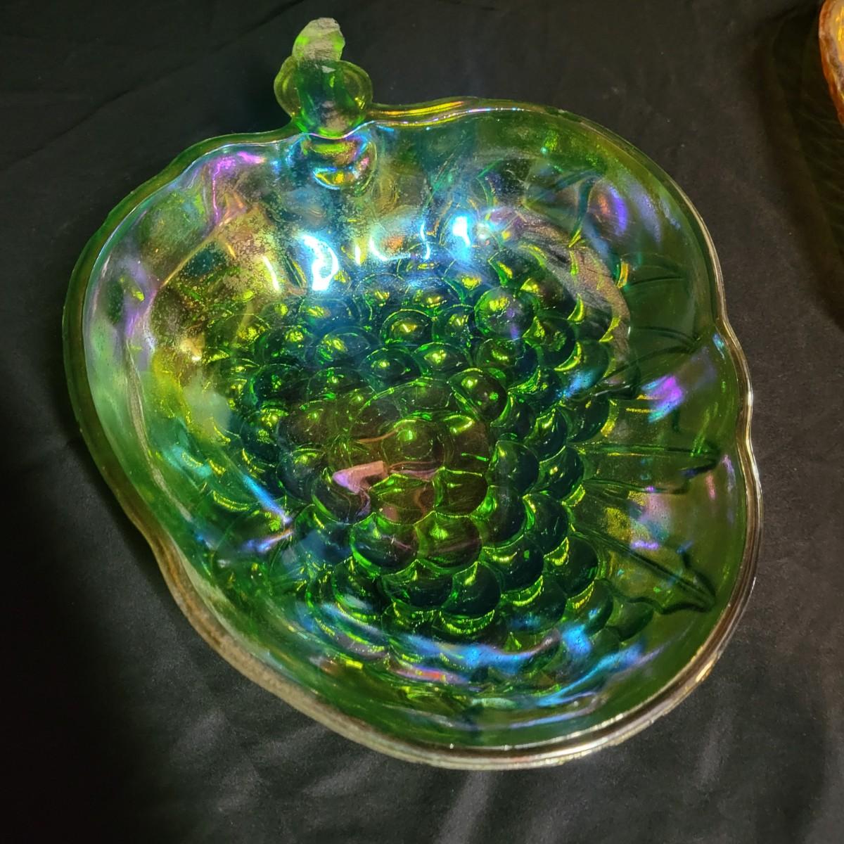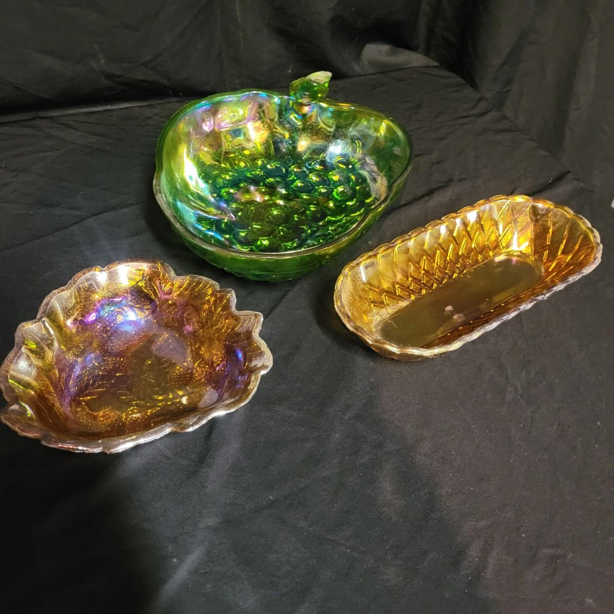 A trio of carnival glass bowls. One bowl is a berry and leaf pattern, the largest has grapes, that has a small chip in it and measures approximately 13" x 9.5" x 3"H. The remaining bowl has a cross hatch pattern. Shipping available