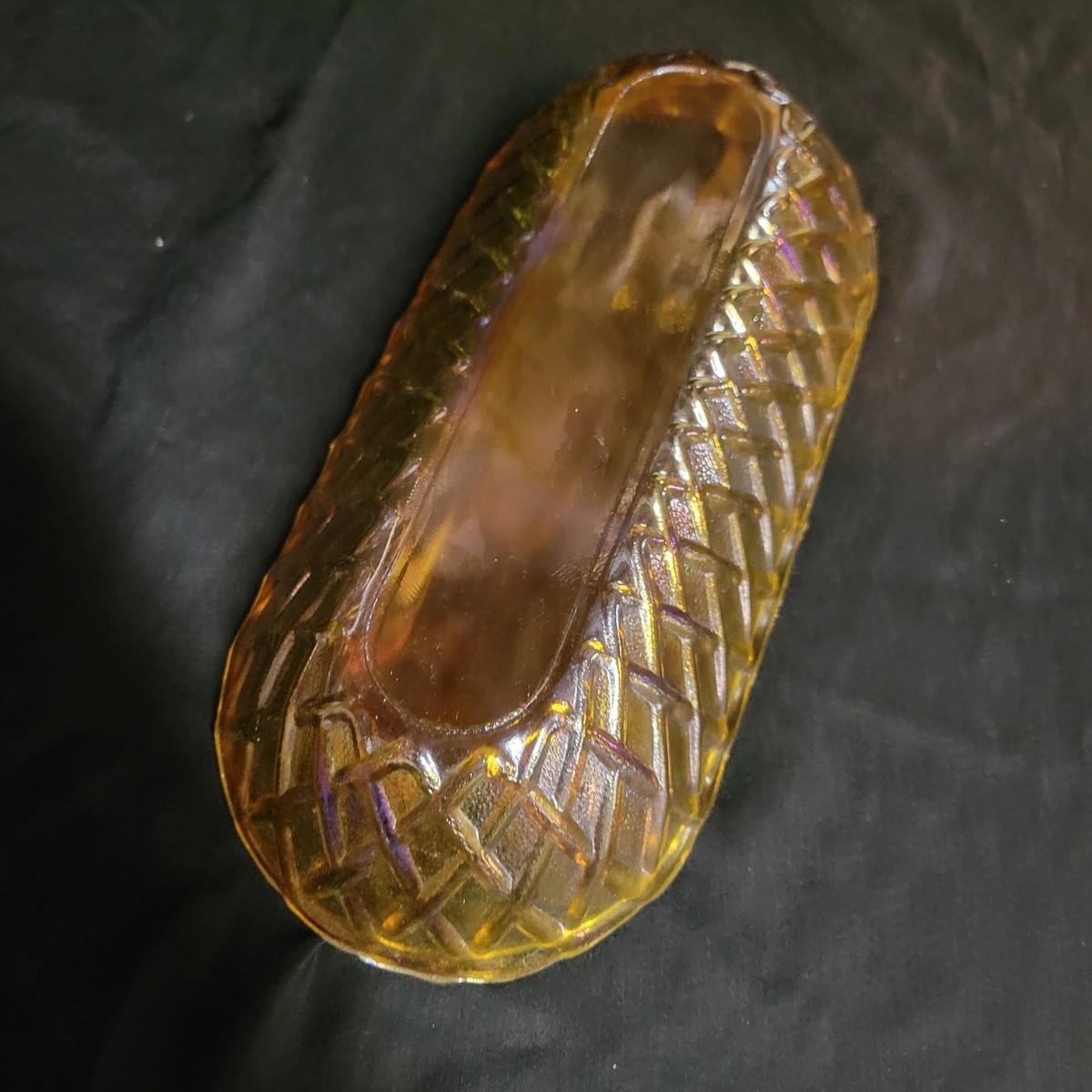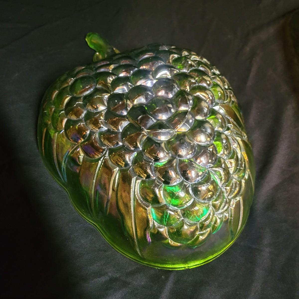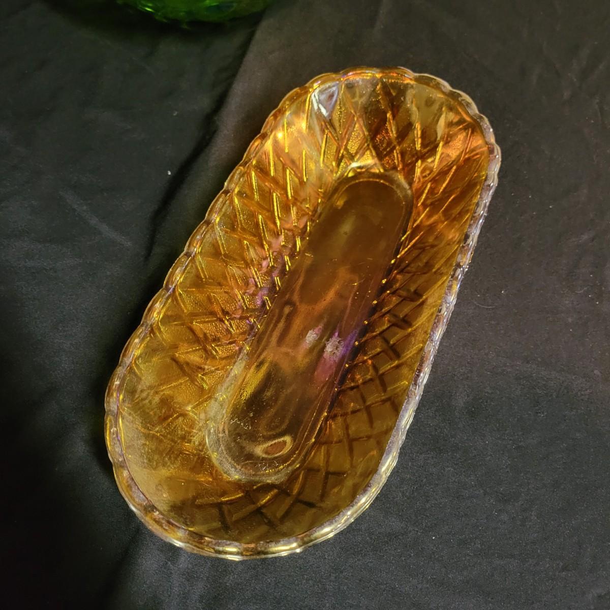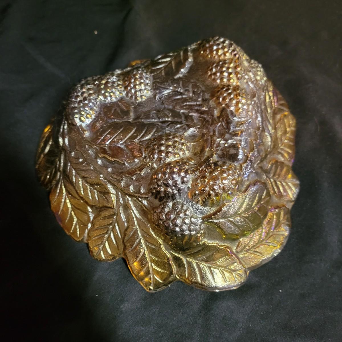 A trio of carnival glass bowls. One bowl is a berry and leaf pattern, the largest has grapes, that has a small chip in it and measures approximately 13" x 9.5" x 3"H. The remaining bowl has a cross hatch pattern. Shipping available