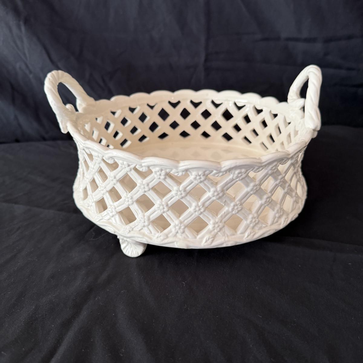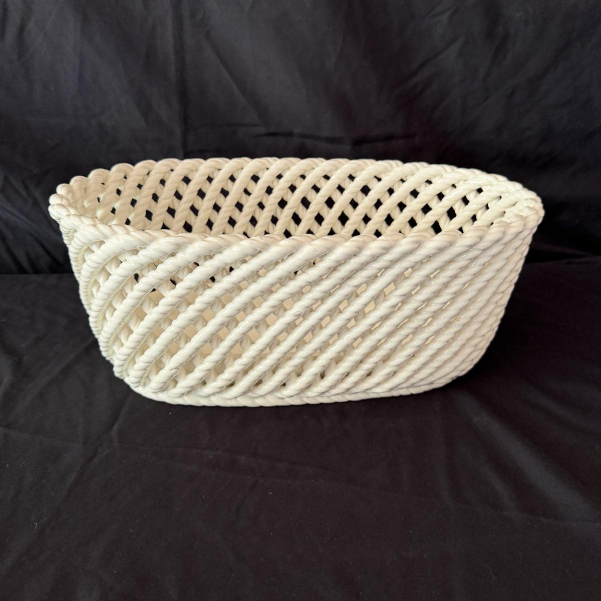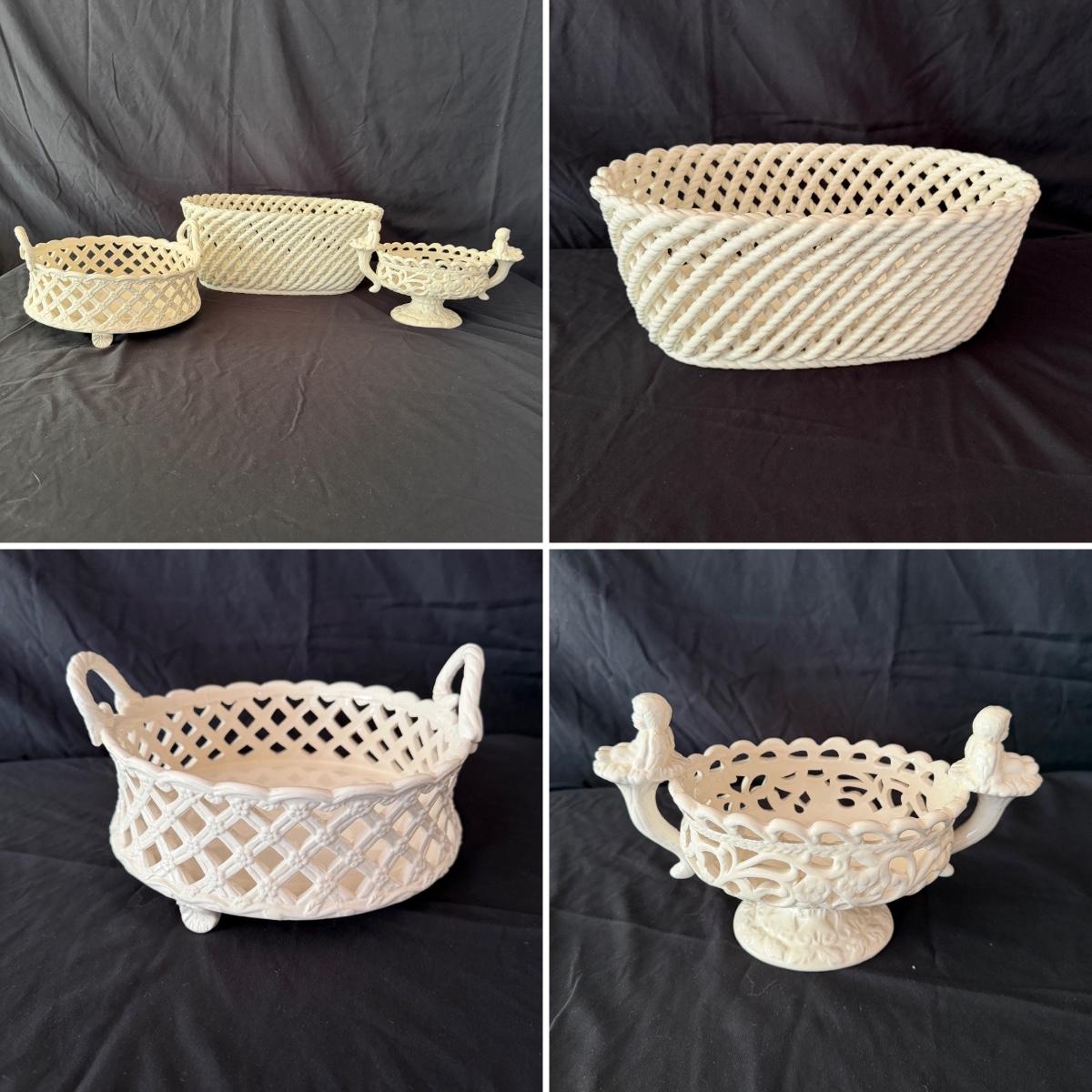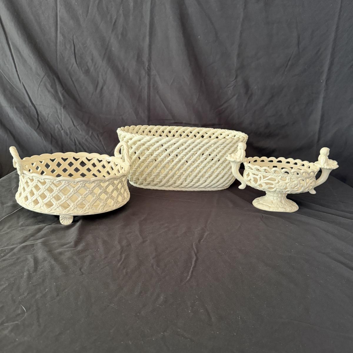 Lot includes a basket weave basket, rope weave basket and dish with cherubs. Largest piece measures 13” x 8” x 6”H.