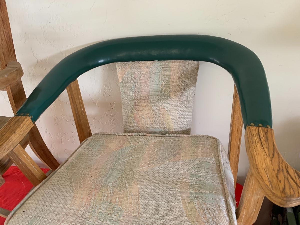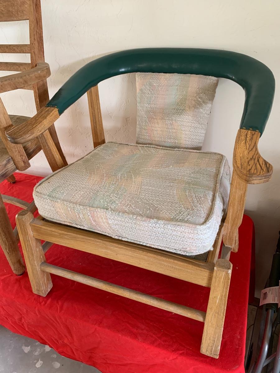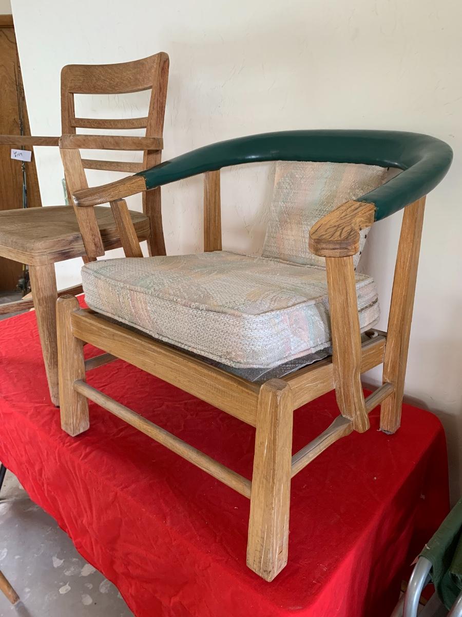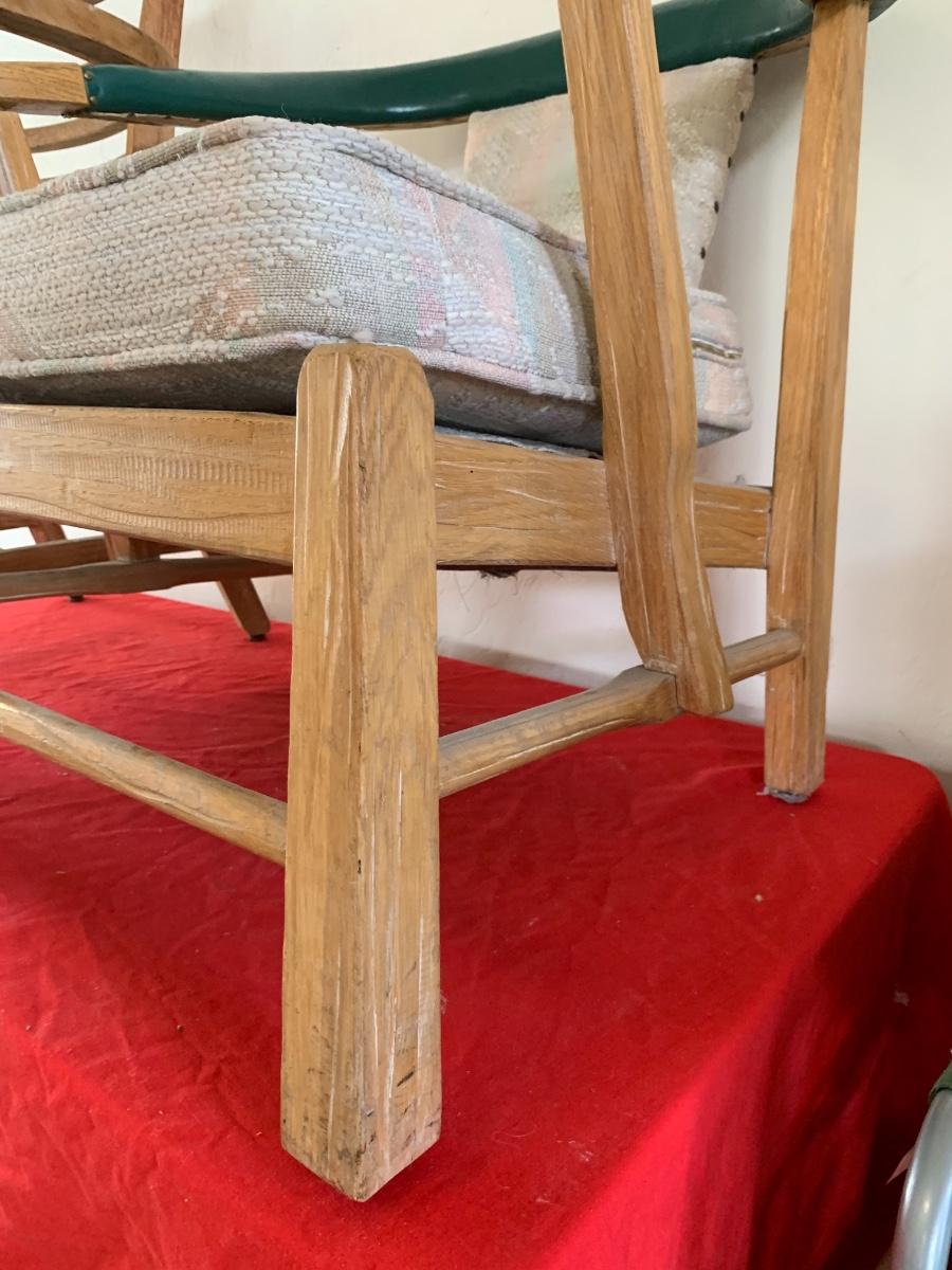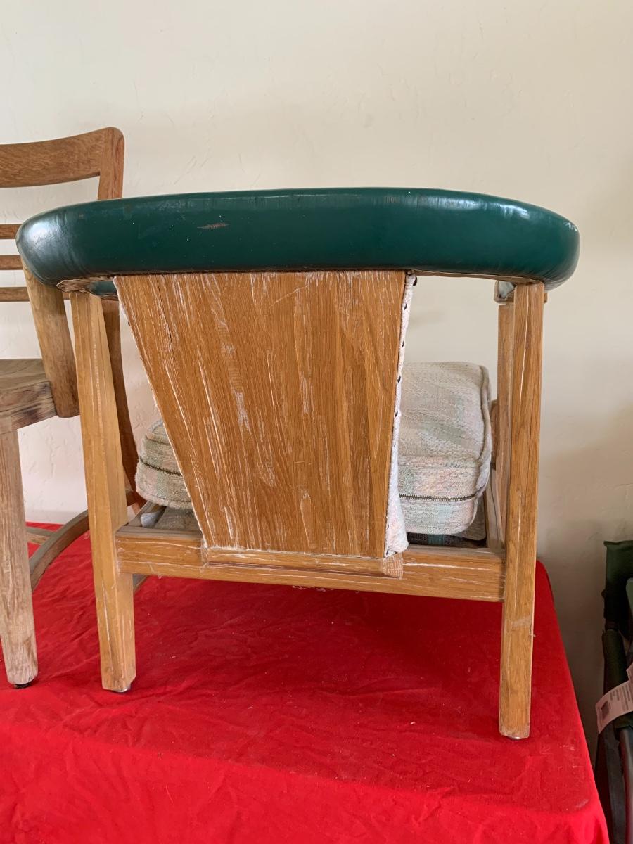 Lot includes a mid century western cowboy style wood chair with green pleather barrel back, claw arms, and pastel upholstery. Needs some work but has great bones, and sturdy! Also included is a vintage/antique wood arm chair with ladder back and wood seat. Good and sturdy, wood is worn. Lastly a modern farmhouse style oak chair, worn but sturdy. Largest chair measures - back height 26”, seat height 17”, 19.5” seat depth and 20.5” width.