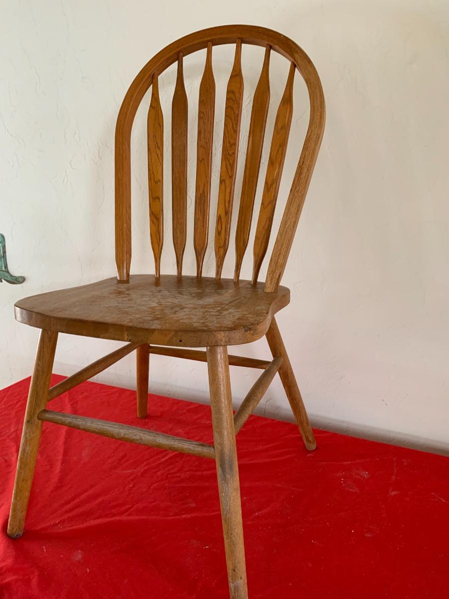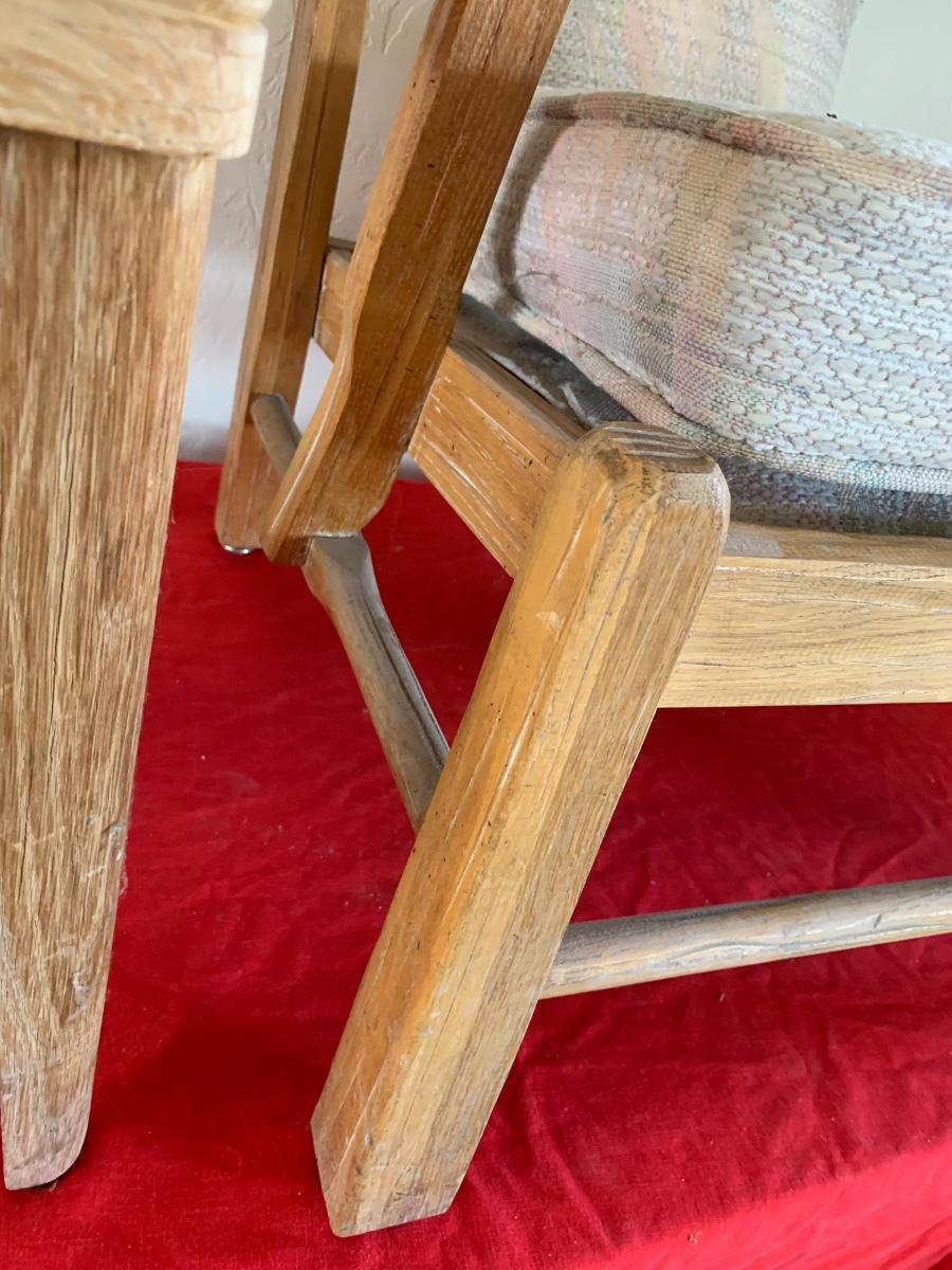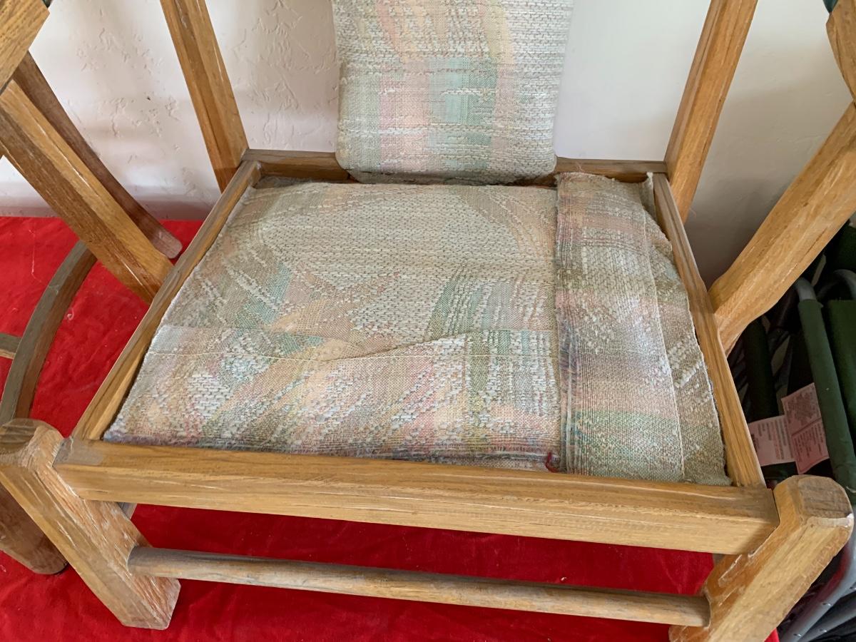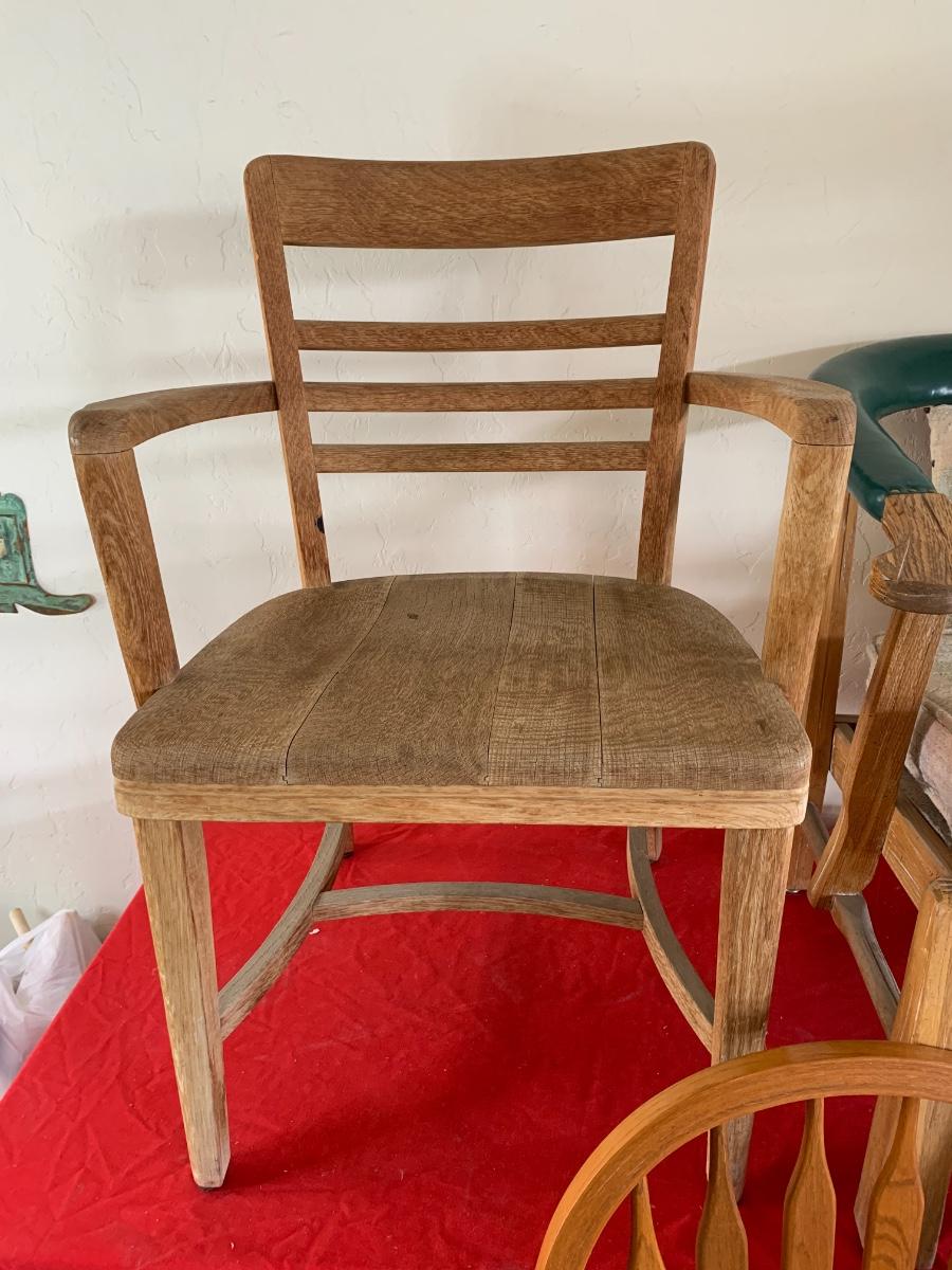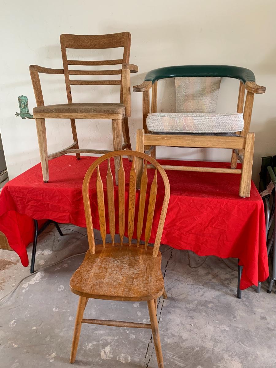 Lot includes a mid century western cowboy style wood chair with green pleather barrel back, claw arms, and pastel upholstery. Needs some work but has great bones, and sturdy! Also included is a vintage/antique wood arm chair with ladder back and wood seat. Good and sturdy, wood is worn. Lastly a modern farmhouse style oak chair, worn but sturdy. Largest chair measures - back height 26”, seat height 17”, 19.5” seat depth and 20.5” width.
