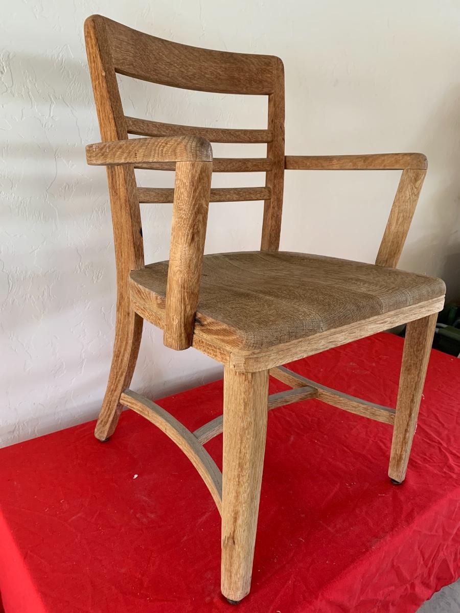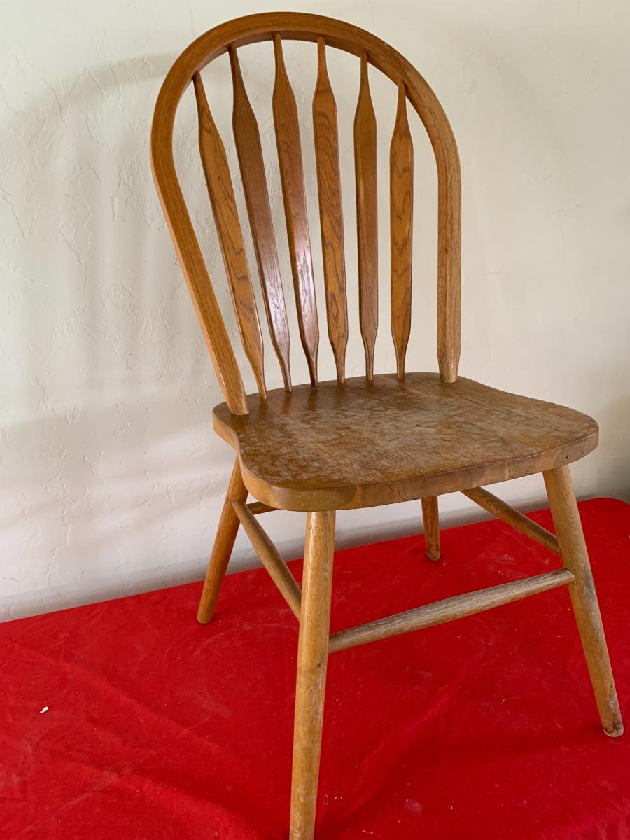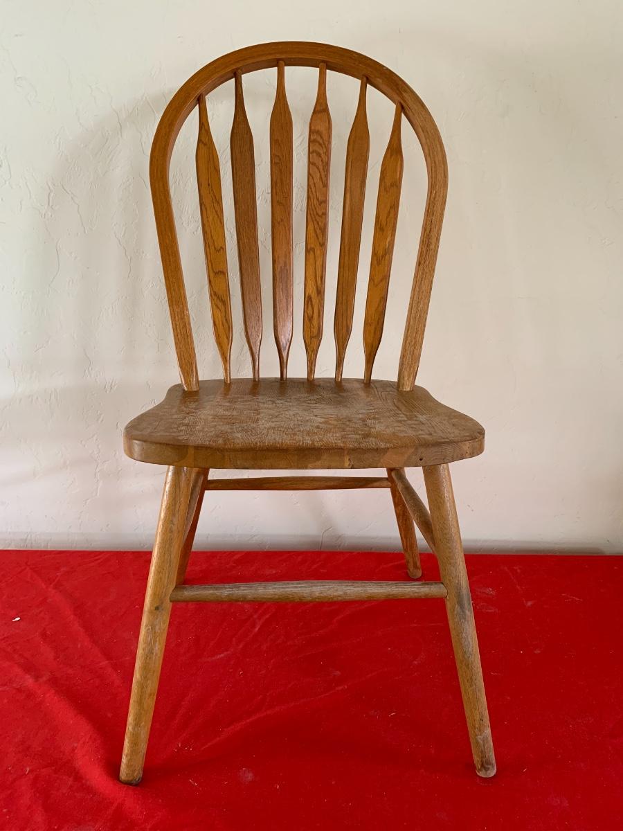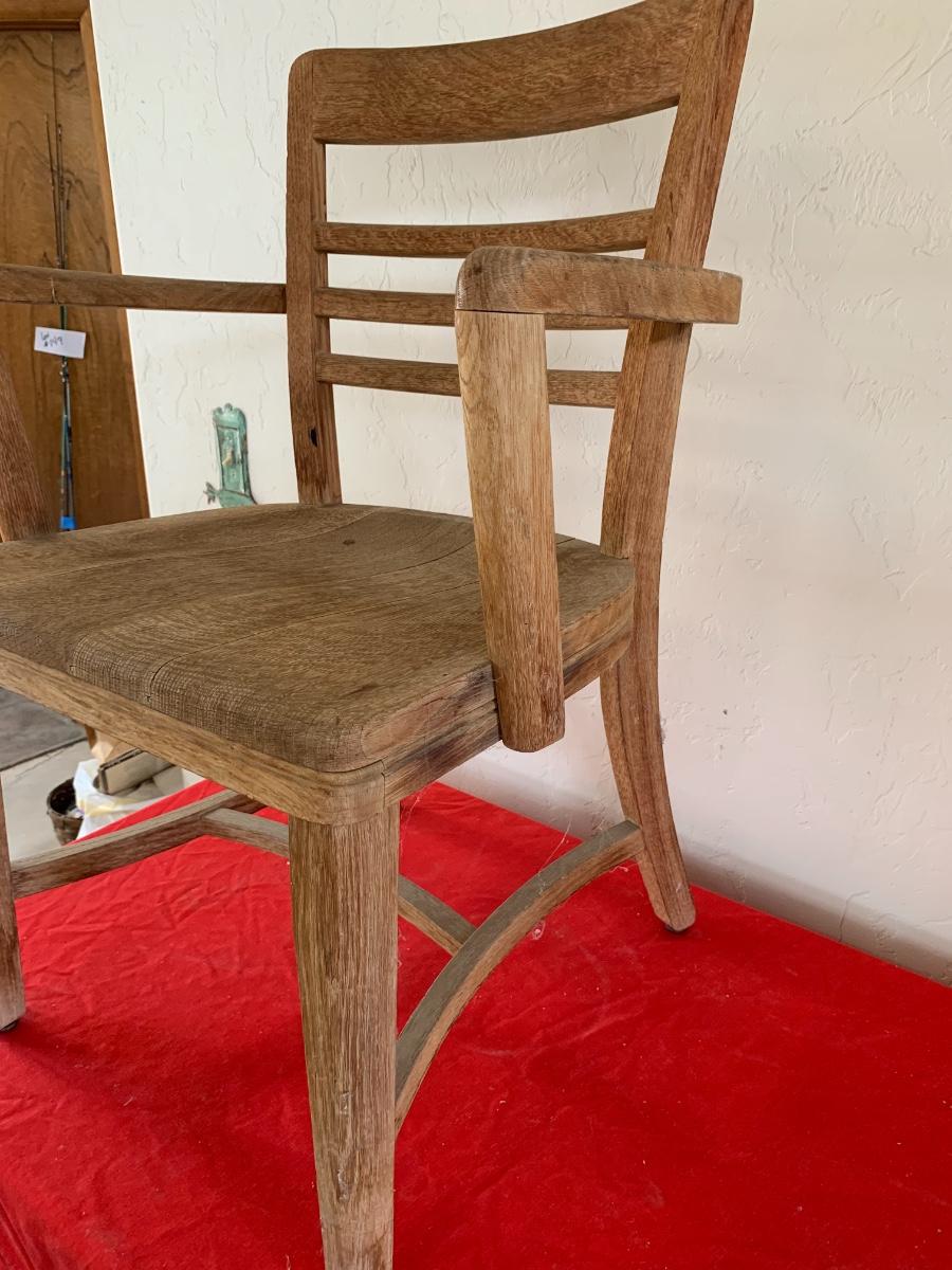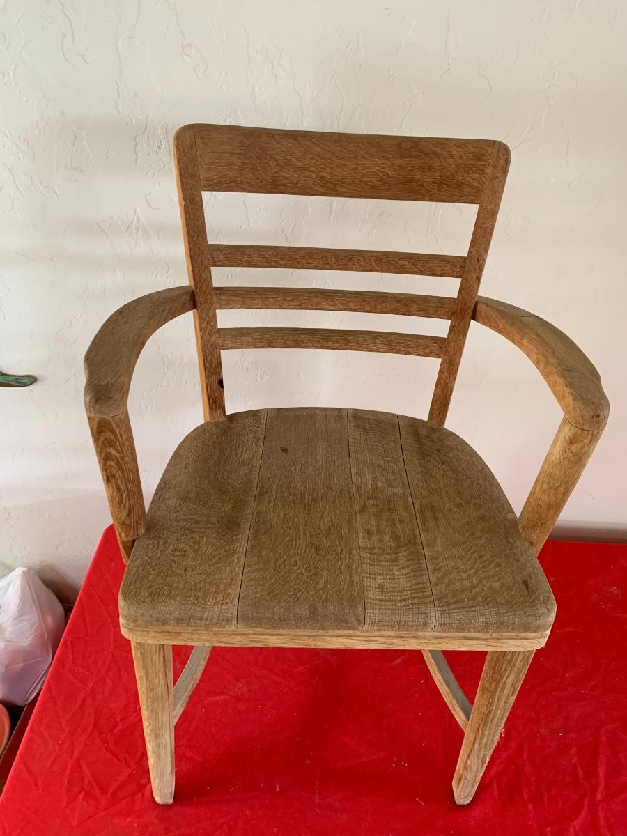 Lot includes a mid century western cowboy style wood chair with green pleather barrel back, claw arms, and pastel upholstery. Needs some work but has great bones, and sturdy! Also included is a vintage/antique wood arm chair with ladder back and wood seat. Good and sturdy, wood is worn. Lastly a modern farmhouse style oak chair, worn but sturdy. Largest chair measures - back height 26”, seat height 17”, 19.5” seat depth and 20.5” width.