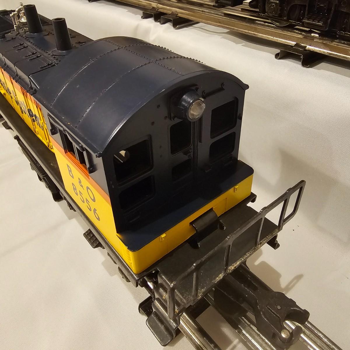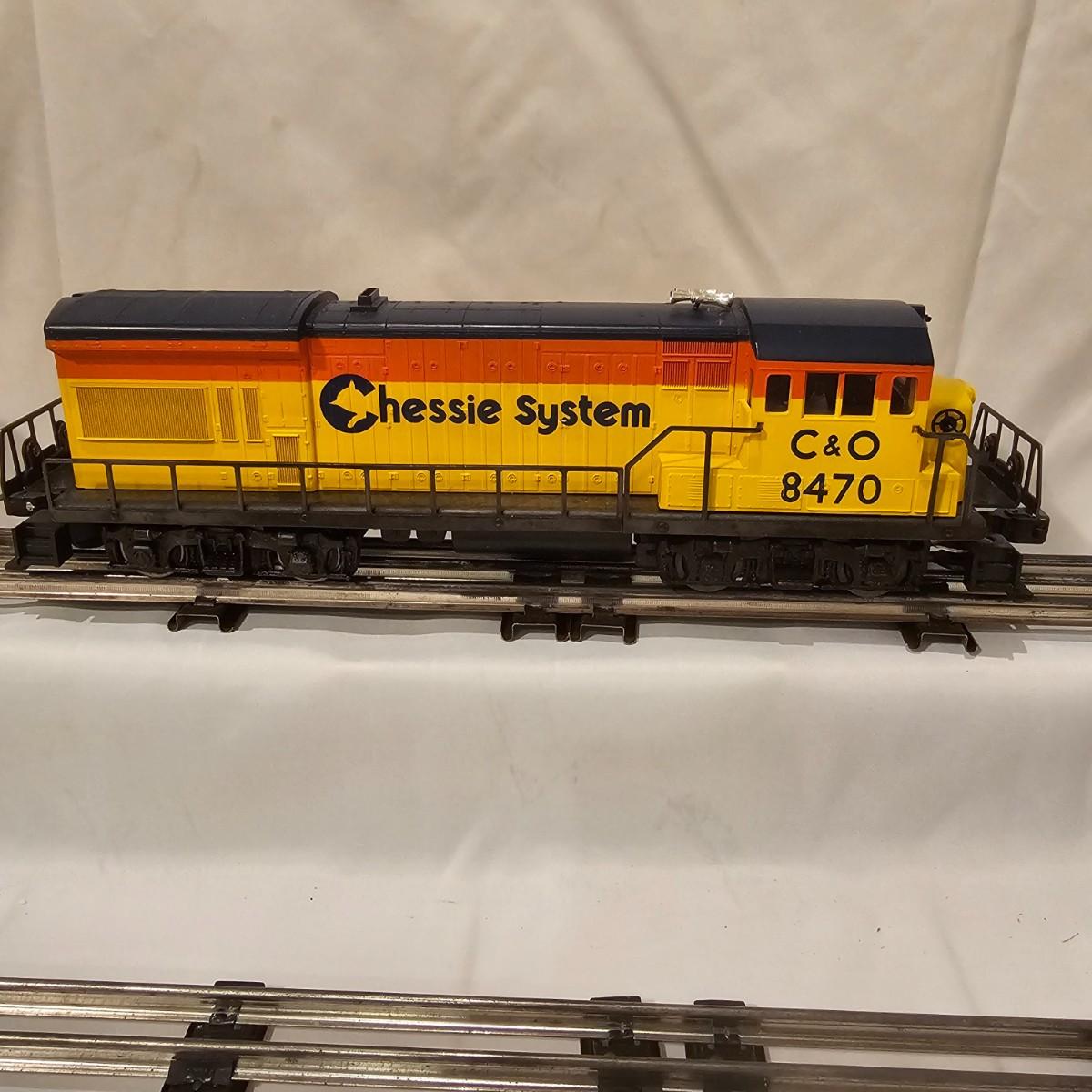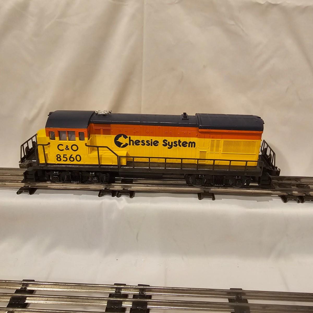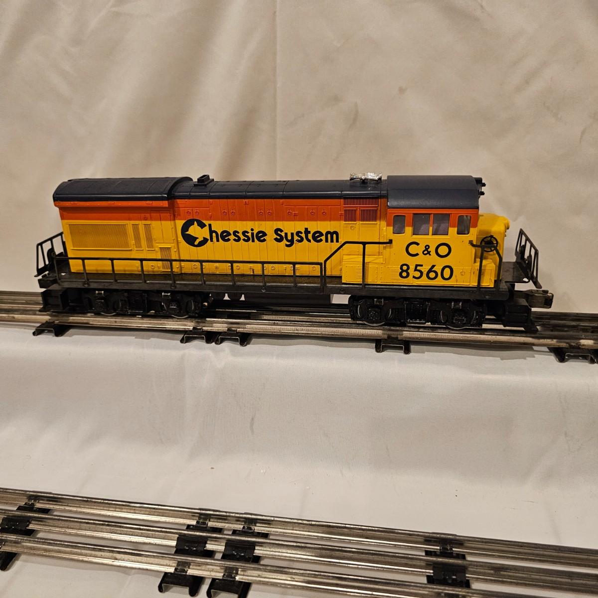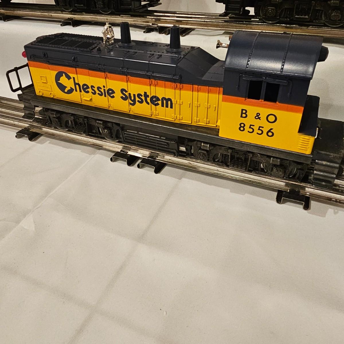 A pair of U36B diesels and one NW2 switcher unit, all wearing the favorite cat logo of the Chessie brand. One U36B is powered, #8470 and the other #8560 is a dummy unit. Each measures 14" x 3" x 4"H. The power unit started and ran on the layout and has working light. The NW2 #8556 switcher measures 12.5" x 3" x 4"H, ran noisy on the layout but no lights. All items need cleaning and one original box for the power unit U36B. See photos for details. Shipping available. Please note that any price tag seen on an item was not put there by Sterling Transitions and does not reflect the current value of the item.