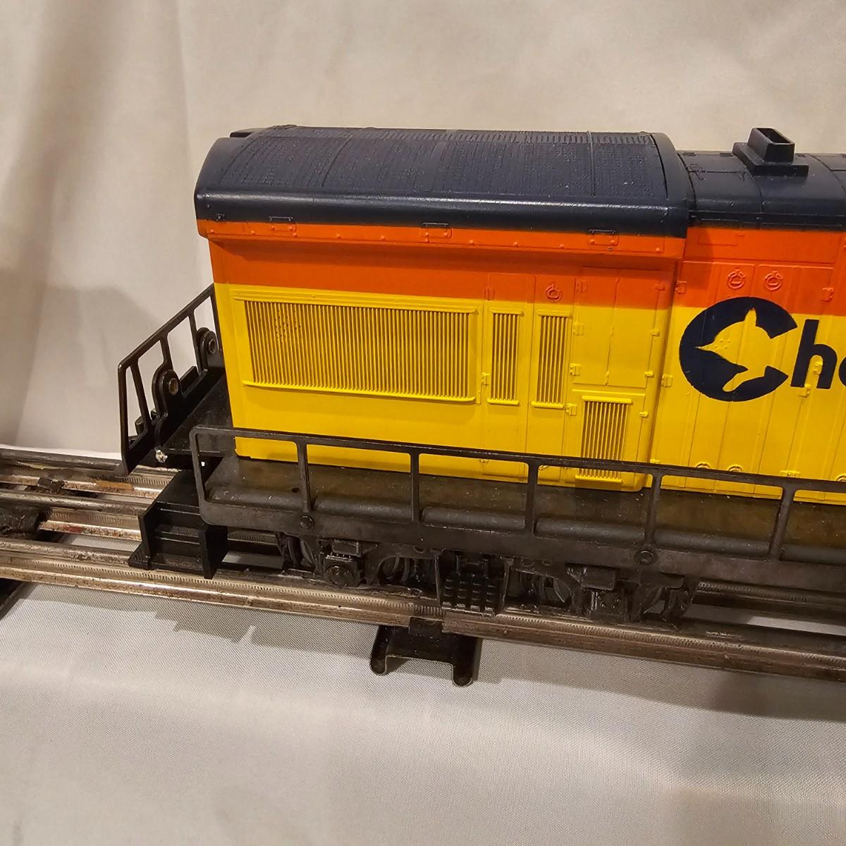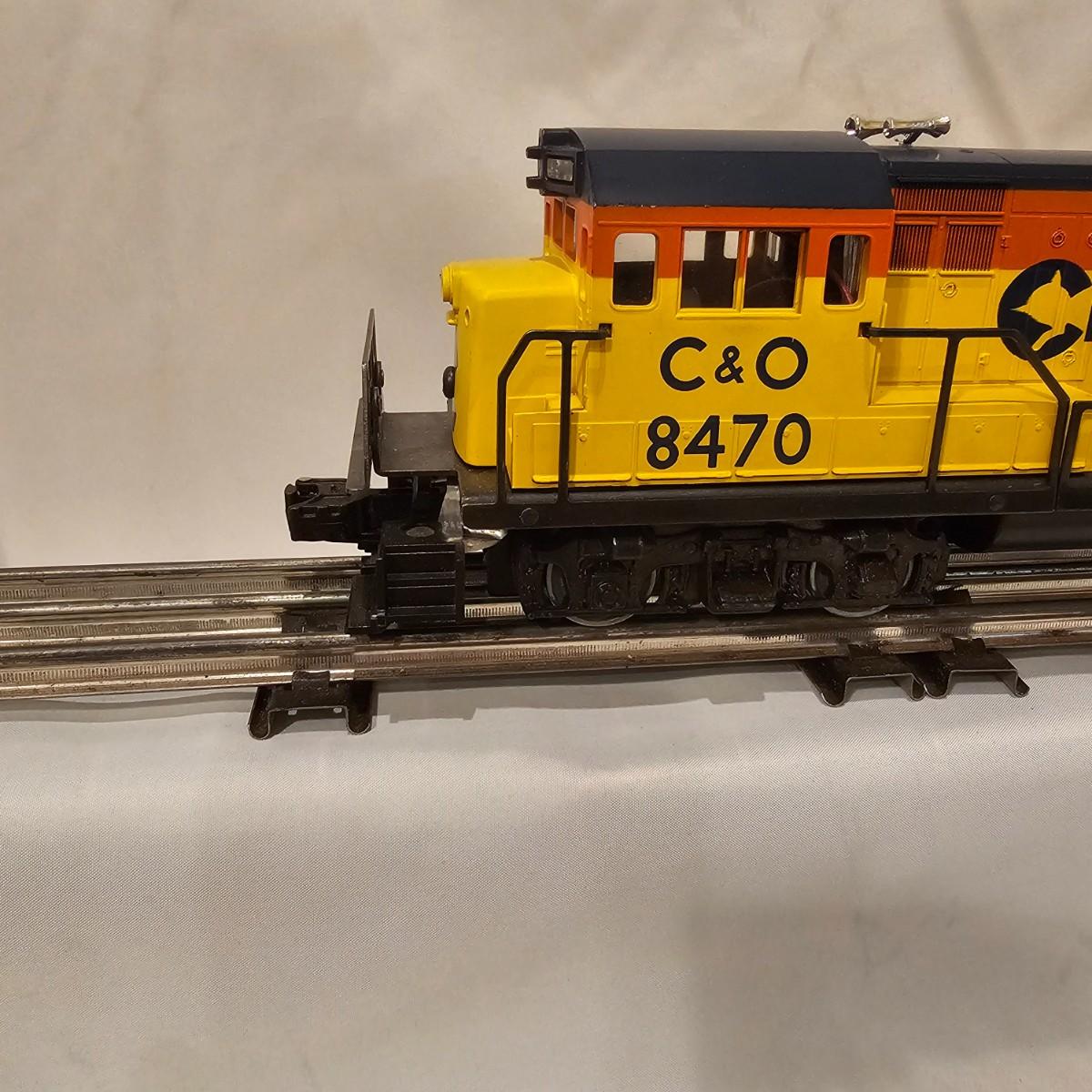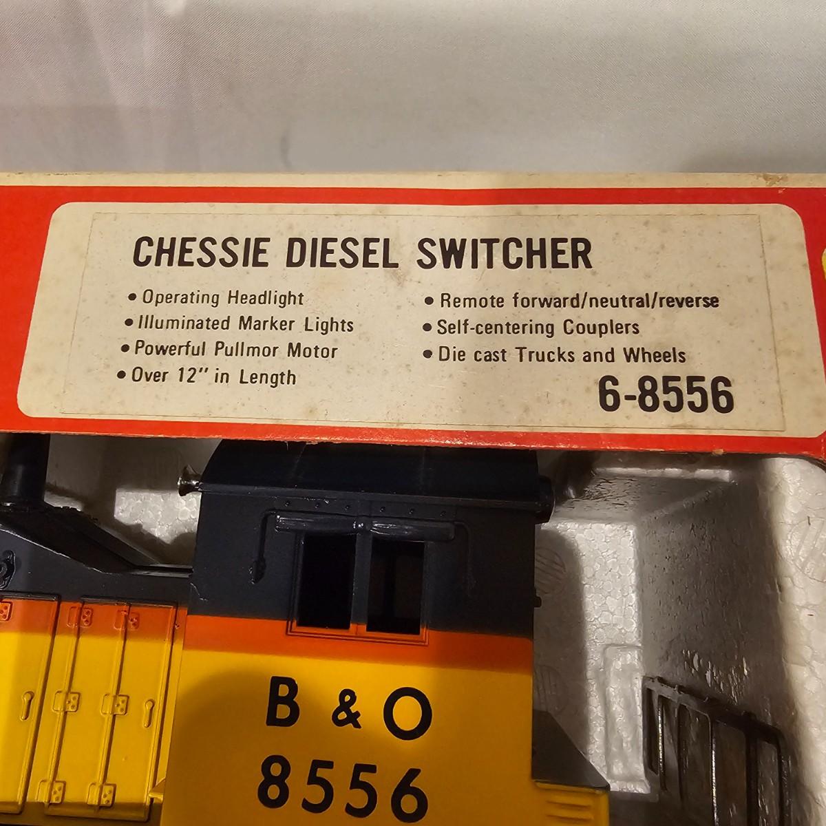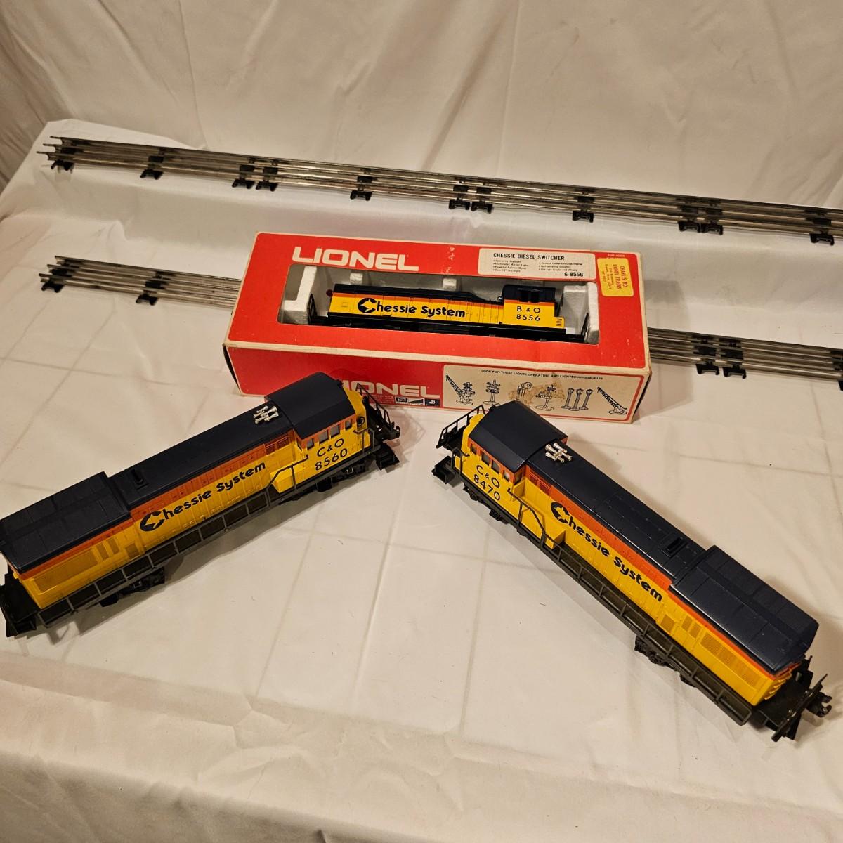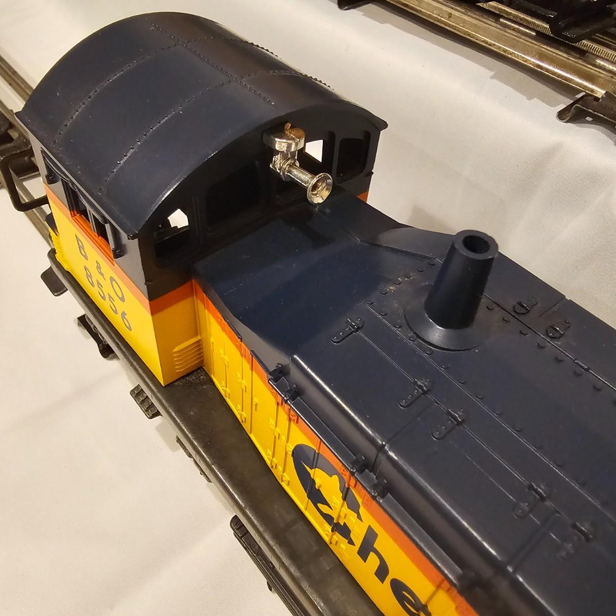 A pair of U36B diesels and one NW2 switcher unit, all wearing the favorite cat logo of the Chessie brand. One U36B is powered, #8470 and the other #8560 is a dummy unit. Each measures 14" x 3" x 4"H. The power unit started and ran on the layout and has working light. The NW2 #8556 switcher measures 12.5" x 3" x 4"H, ran noisy on the layout but no lights. All items need cleaning and one original box for the power unit U36B. See photos for details. Shipping available. Please note that any price tag seen on an item was not put there by Sterling Transitions and does not reflect the current value of the item.