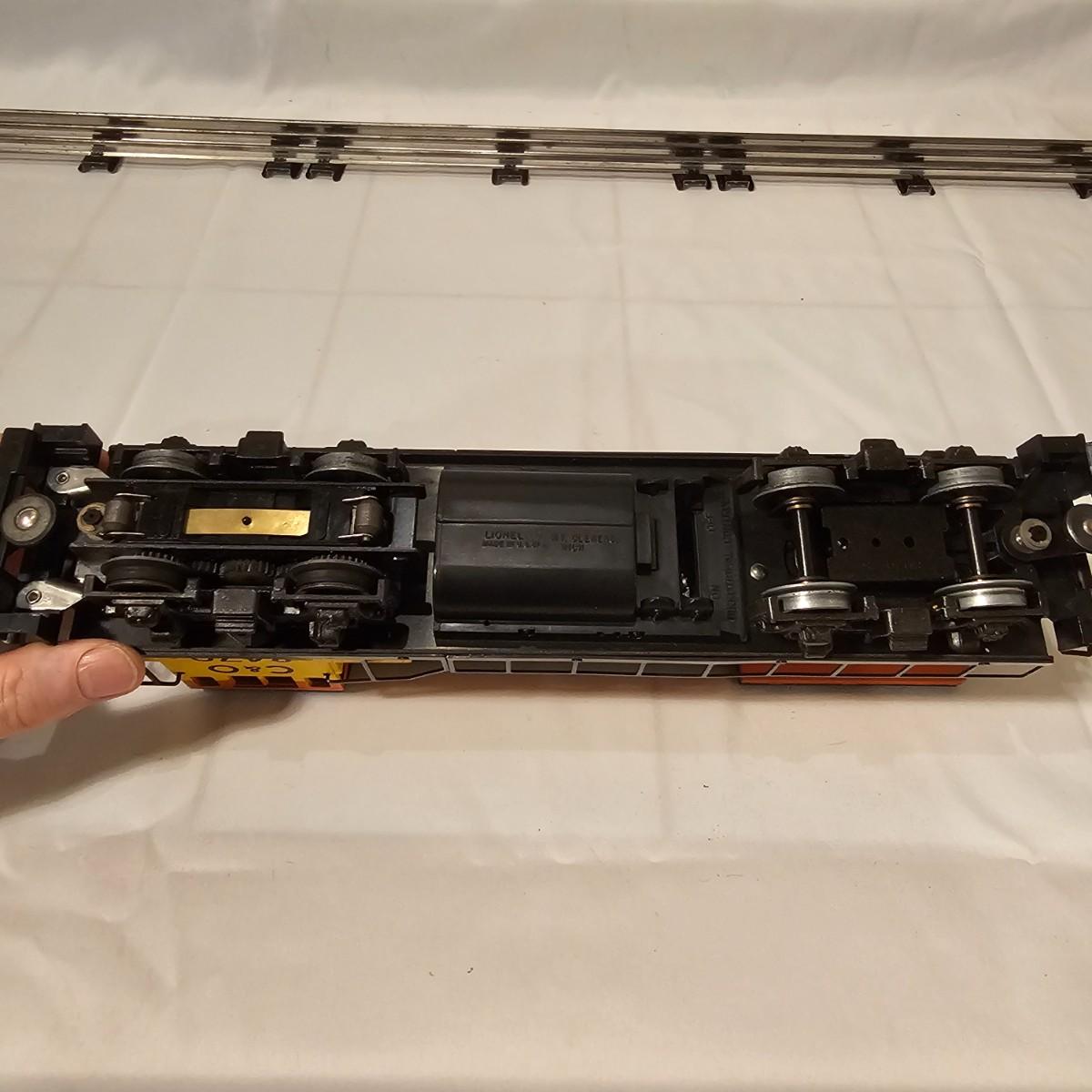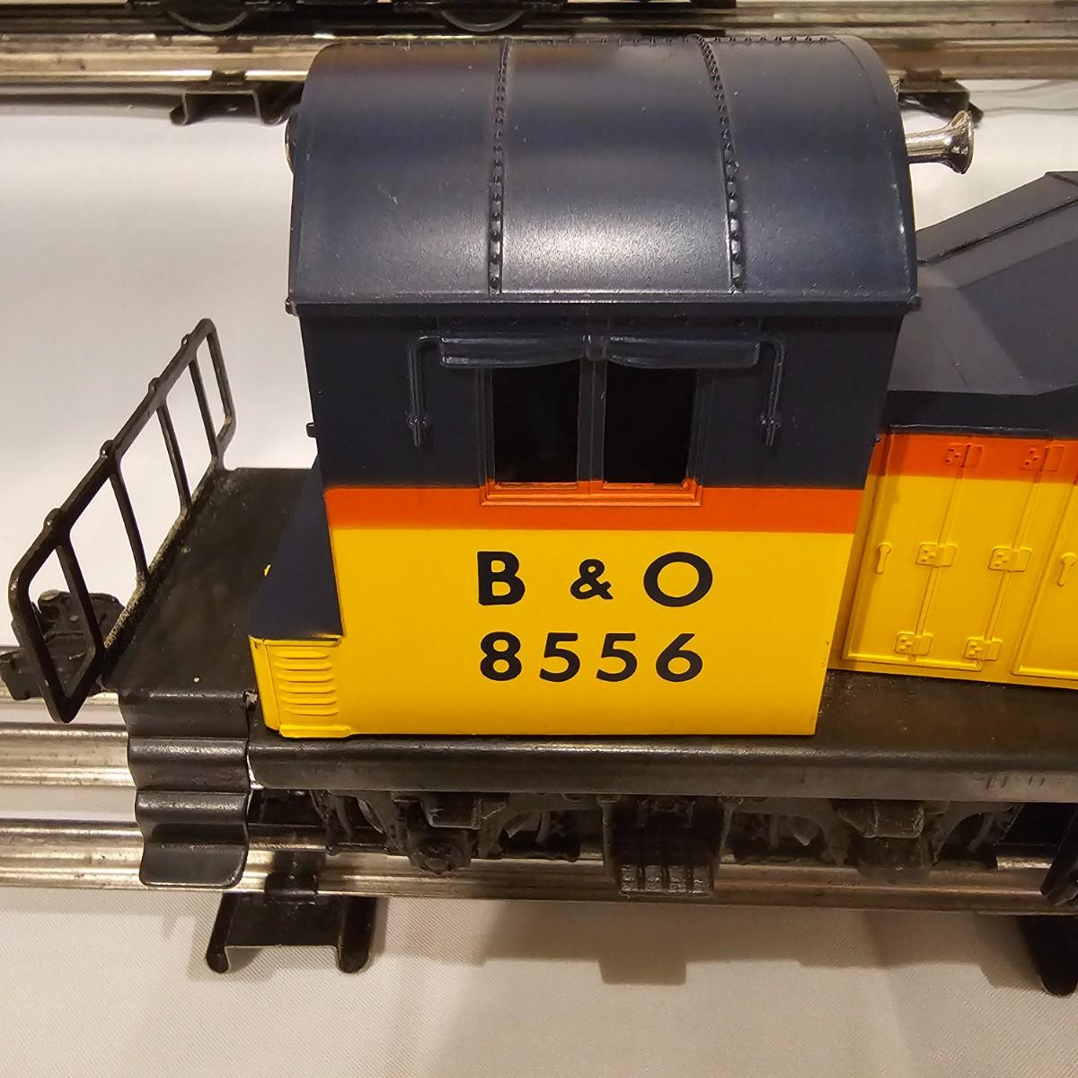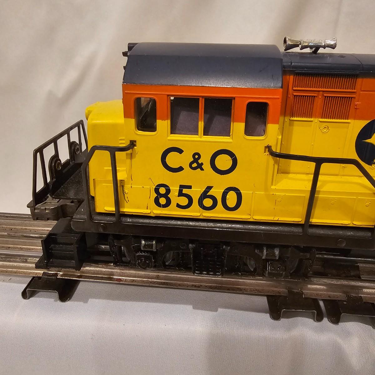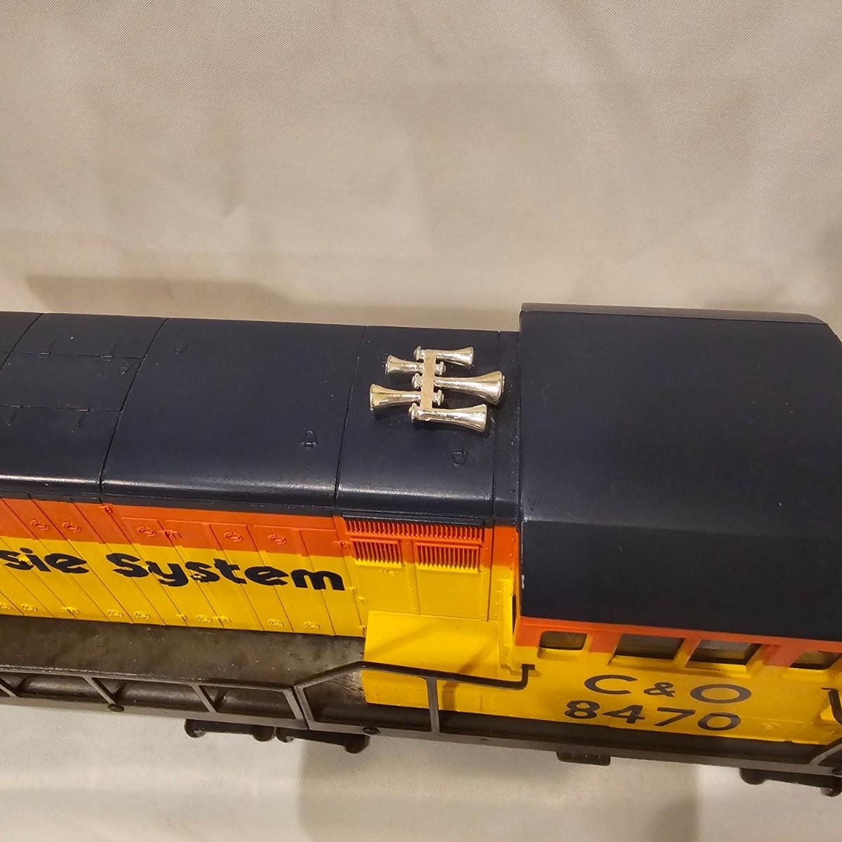 A pair of U36B diesels and one NW2 switcher unit, all wearing the favorite cat logo of the Chessie brand. One U36B is powered, #8470 and the other #8560 is a dummy unit. Each measures 14" x 3" x 4"H. The power unit started and ran on the layout and has working light. The NW2 #8556 switcher measures 12.5" x 3" x 4"H, ran noisy on the layout but no lights. All items need cleaning and one original box for the power unit U36B. See photos for details. Shipping available. Please note that any price tag seen on an item was not put there by Sterling Transitions and does not reflect the current value of the item.