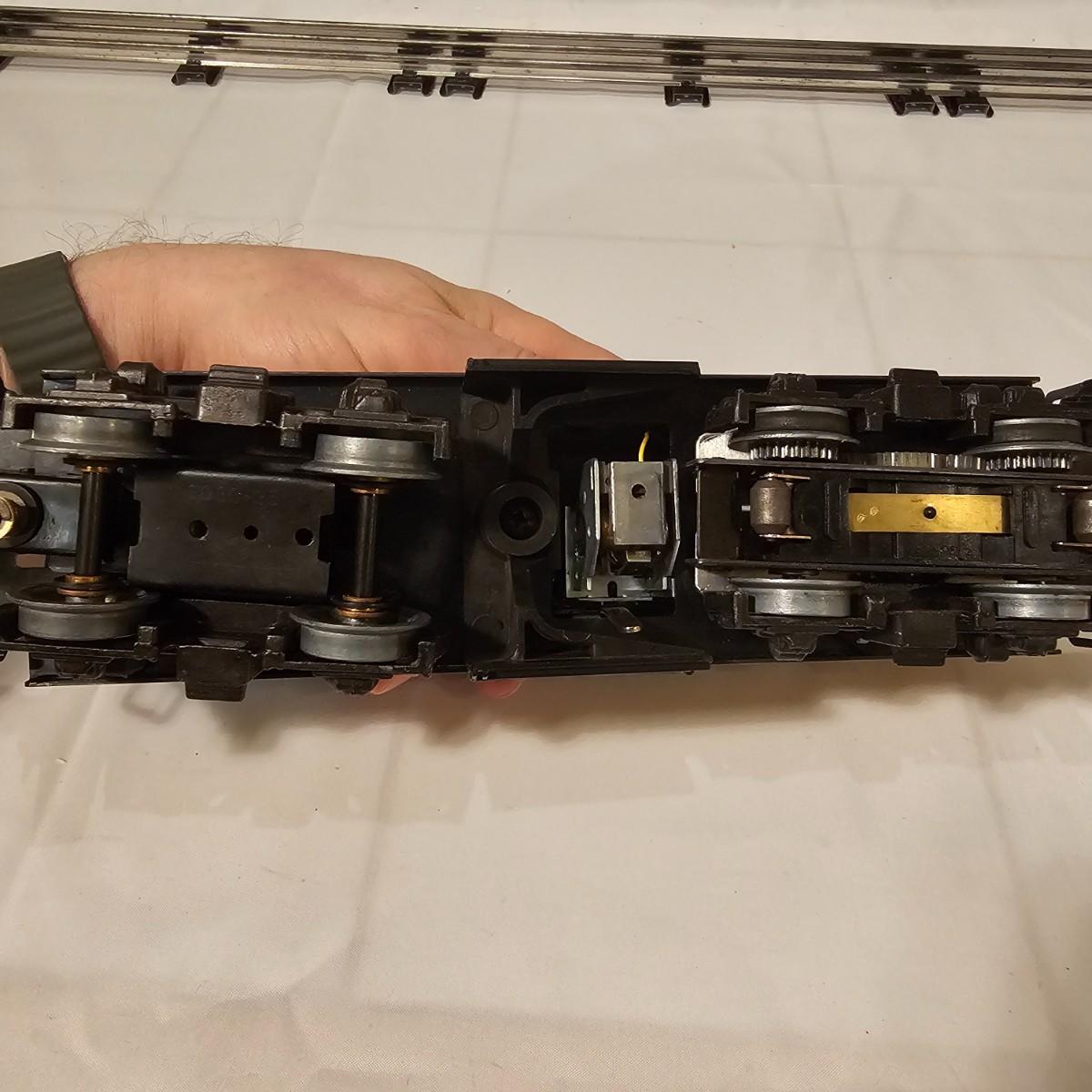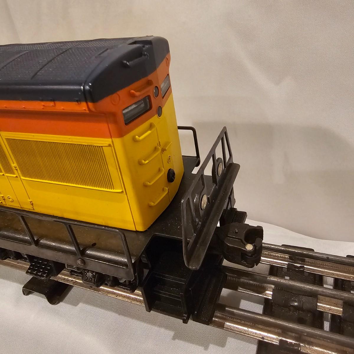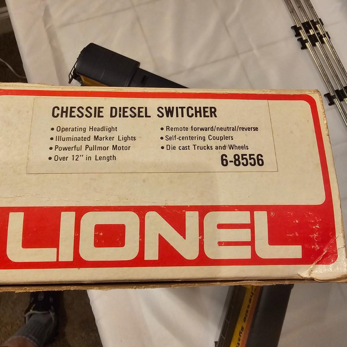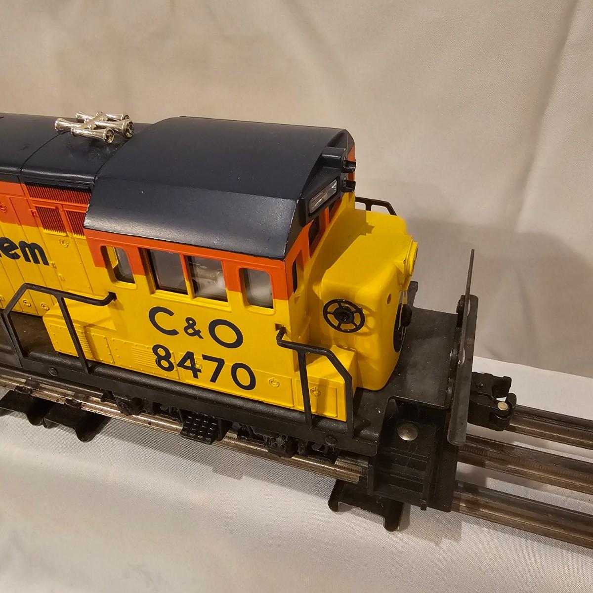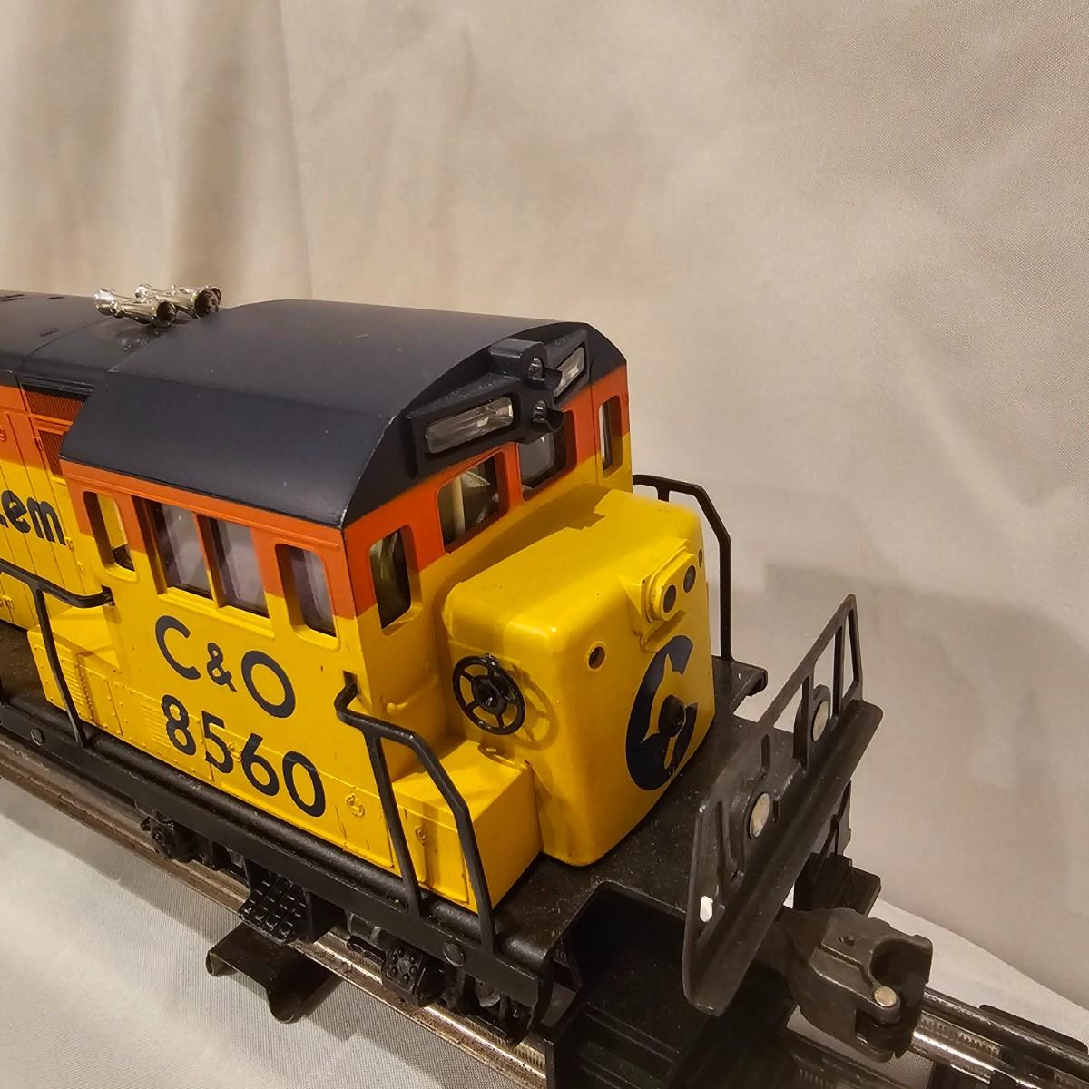 A pair of U36B diesels and one NW2 switcher unit, all wearing the favorite cat logo of the Chessie brand. One U36B is powered, #8470 and the other #8560 is a dummy unit. Each measures 14" x 3" x 4"H. The power unit started and ran on the layout and has working light. The NW2 #8556 switcher measures 12.5" x 3" x 4"H, ran noisy on the layout but no lights. All items need cleaning and one original box for the power unit U36B. See photos for details. Shipping available. Please note that any price tag seen on an item was not put there by Sterling Transitions and does not reflect the current value of the item.