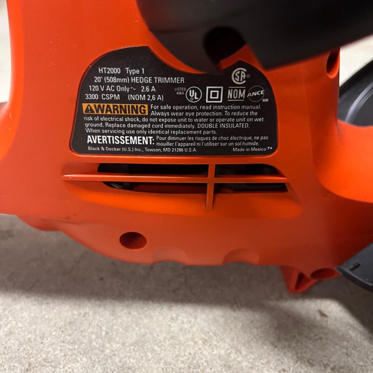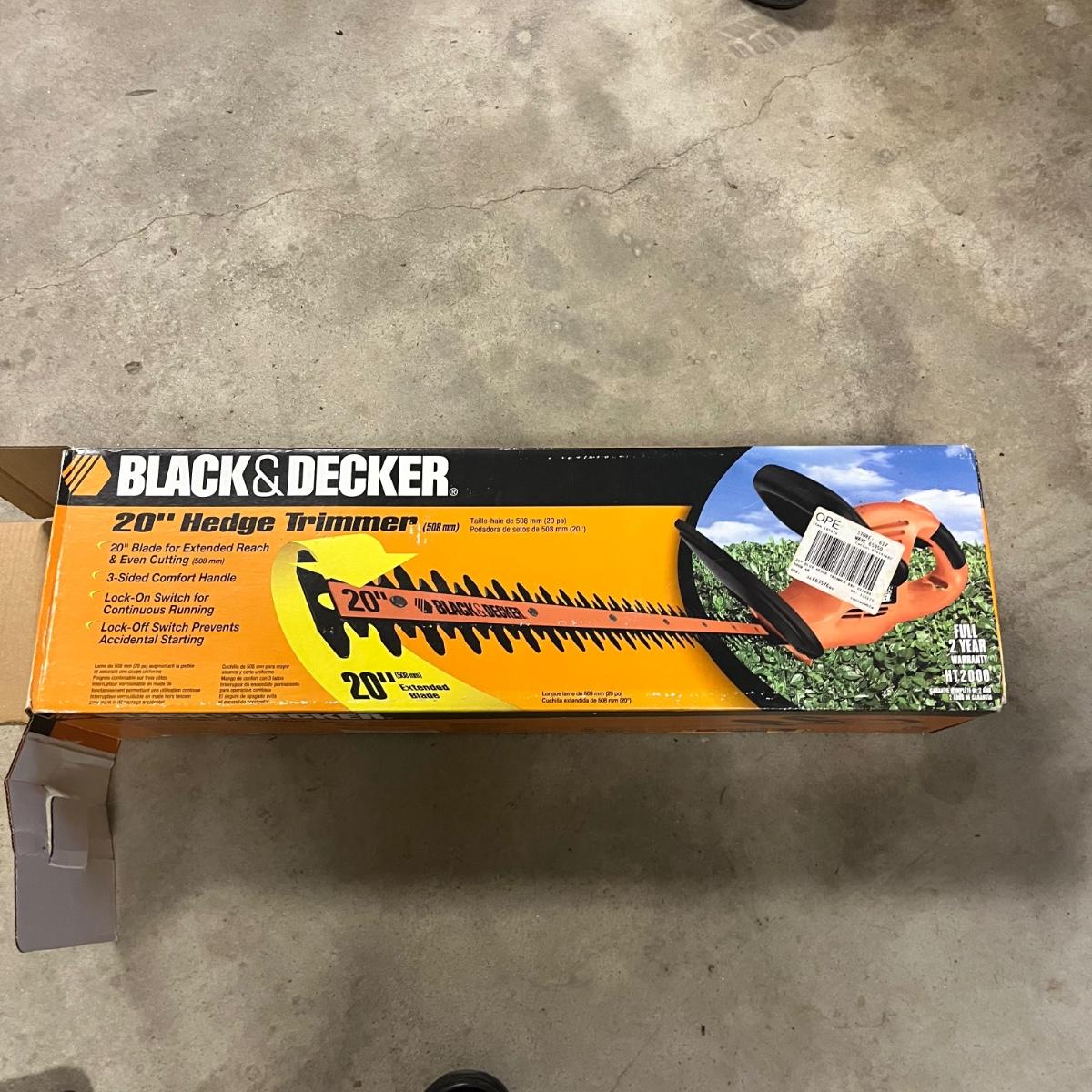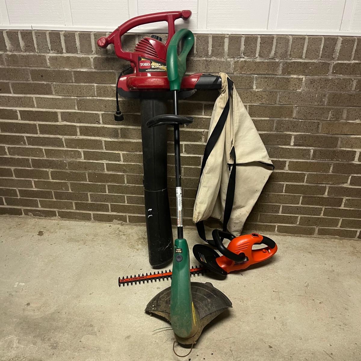 Lot includes a Black and Decker 20” hedge trimmer, Toro Ultra Blower that is set up as a vacuum and missing blower end and a Weed Eater string trimmer model # RTE115. All items worked when tested.