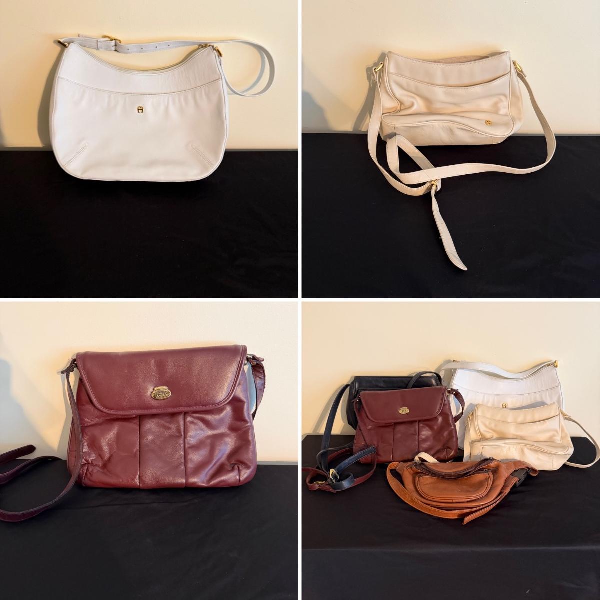 Lot includes three Etienne Aigner leather purses, leather fanny pack and an unmarked purse that appears to be leather. Largest purse measures 13” x 3.5” x 10”H (not including the strap).