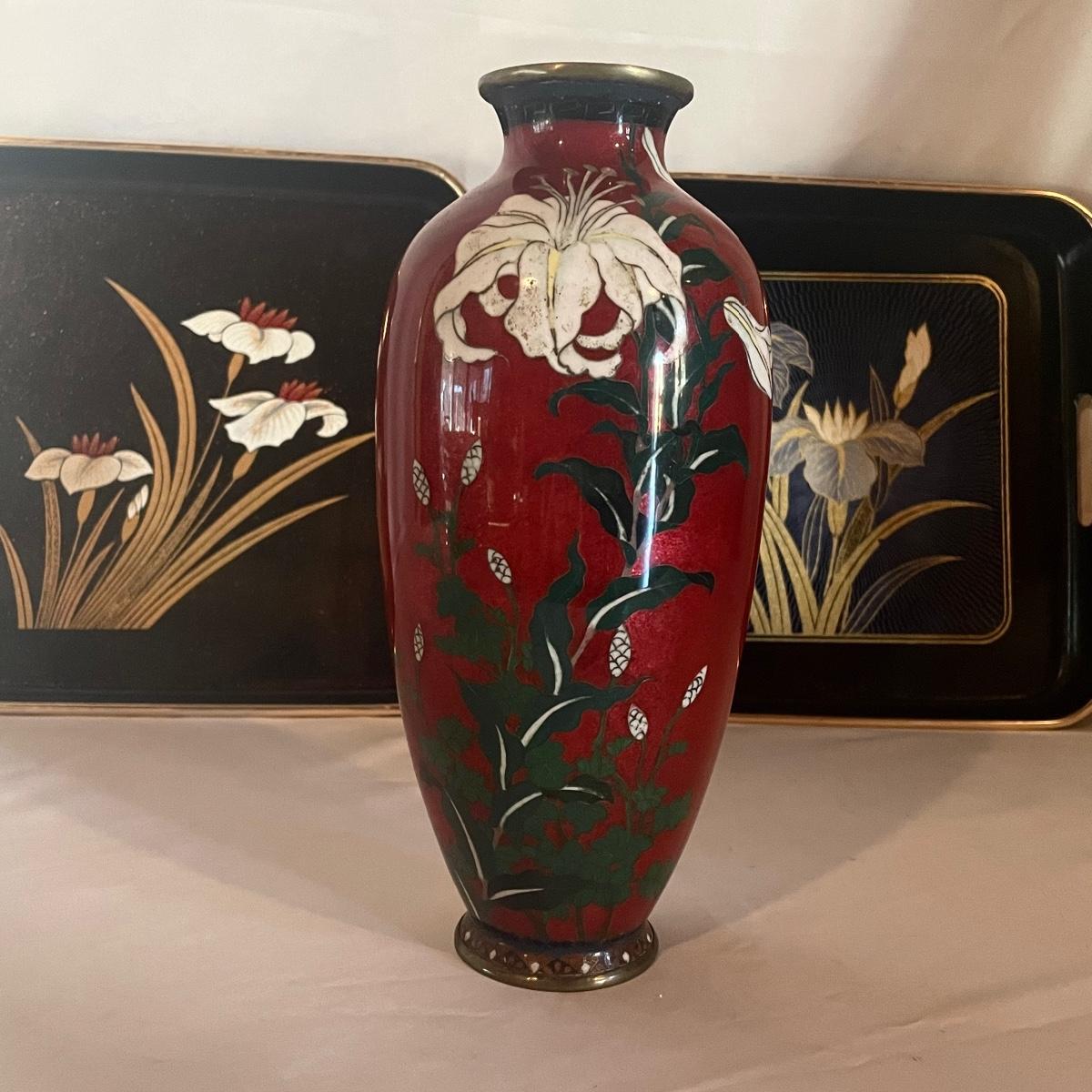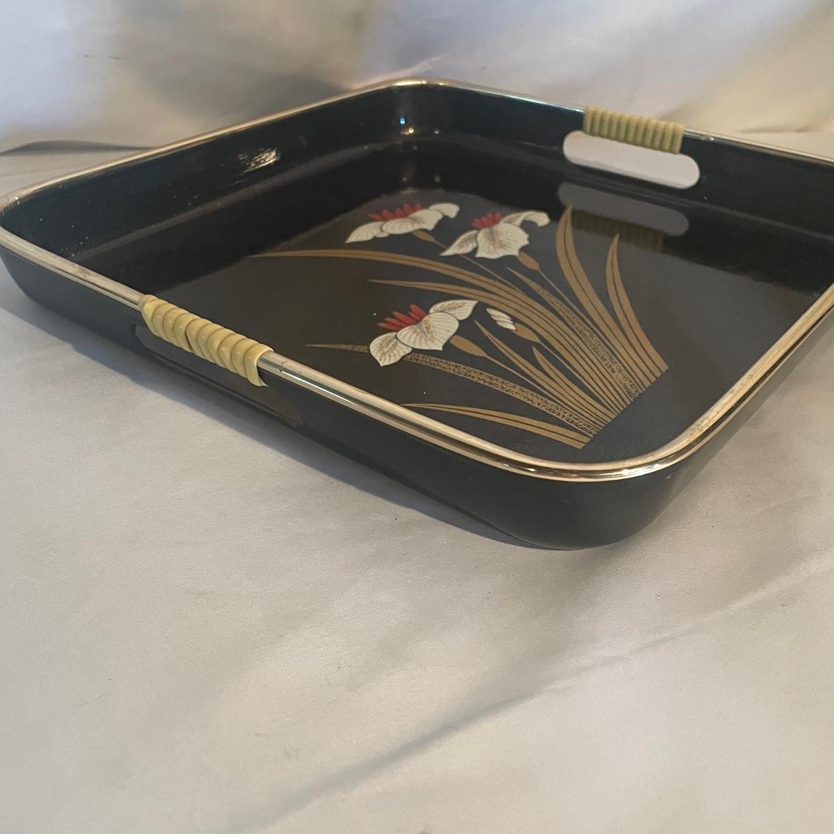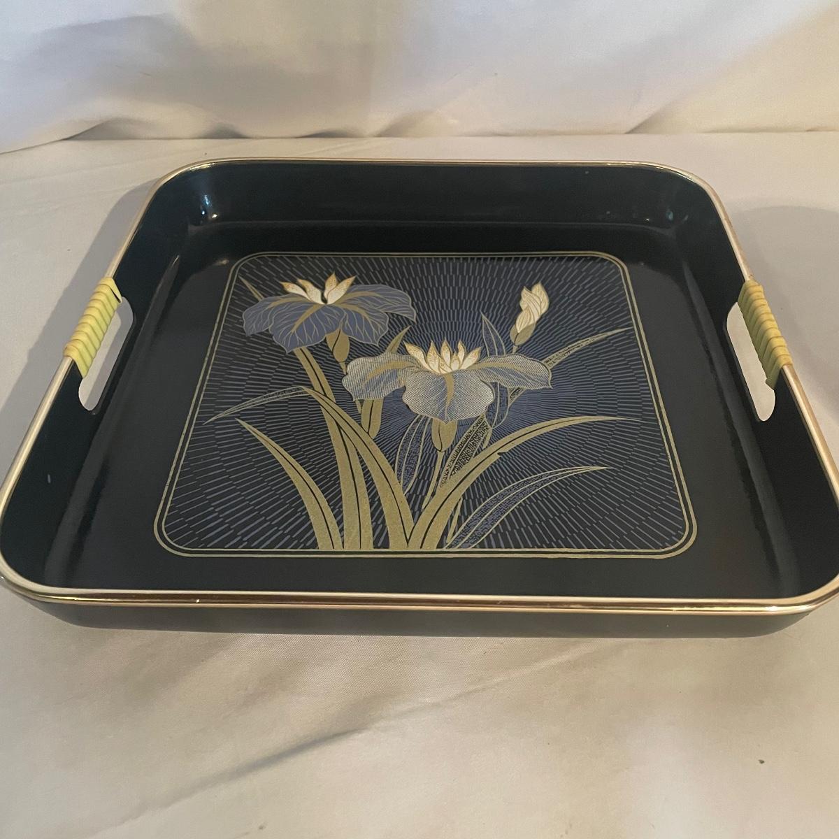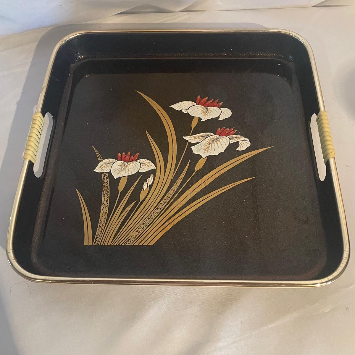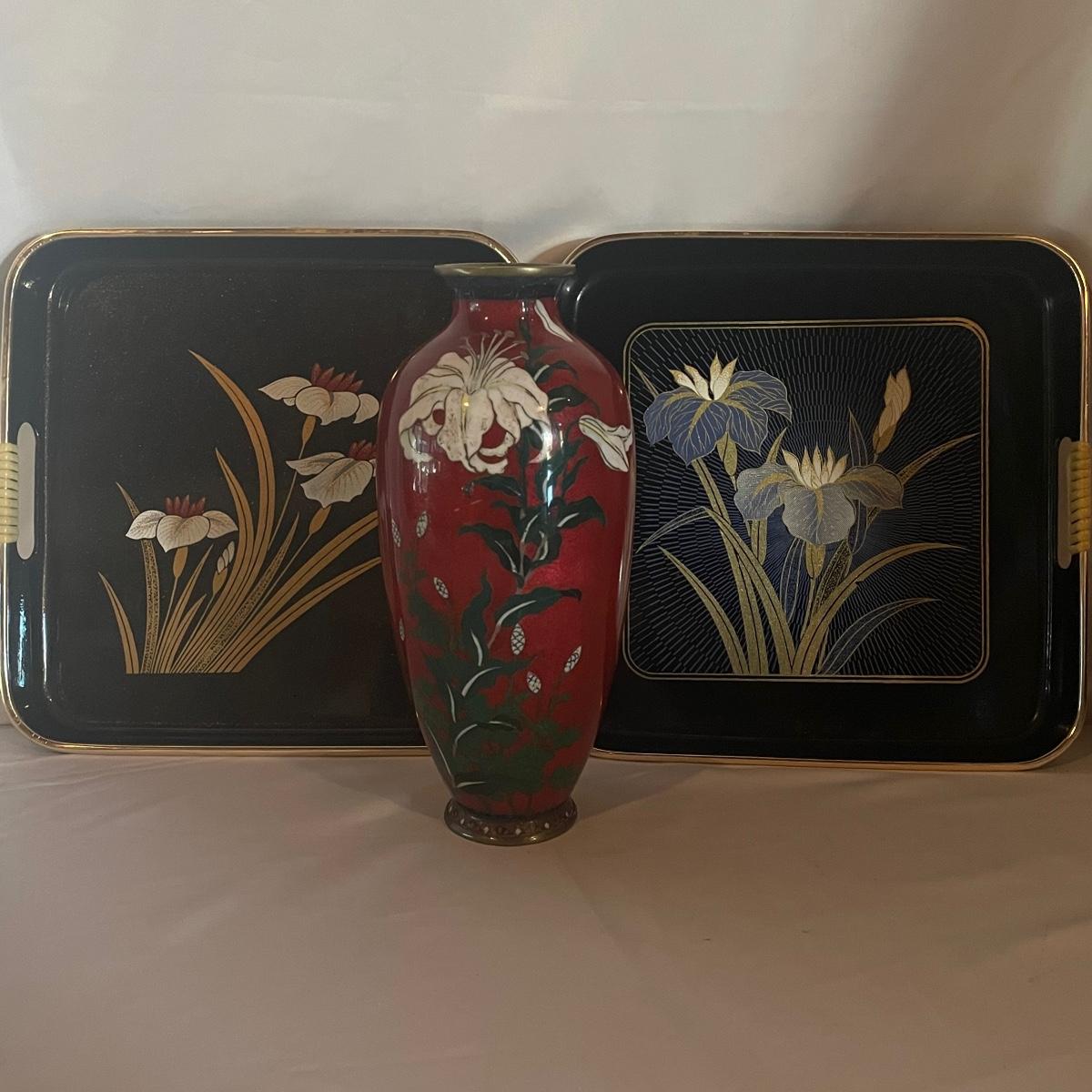 This beautiful vase appears to be metal with an enamel coating; the mark on the inside rim of the neck is where the aged gold paint has worn away slightly. It’s paired with two attractive melamine like trays with floral designs.
