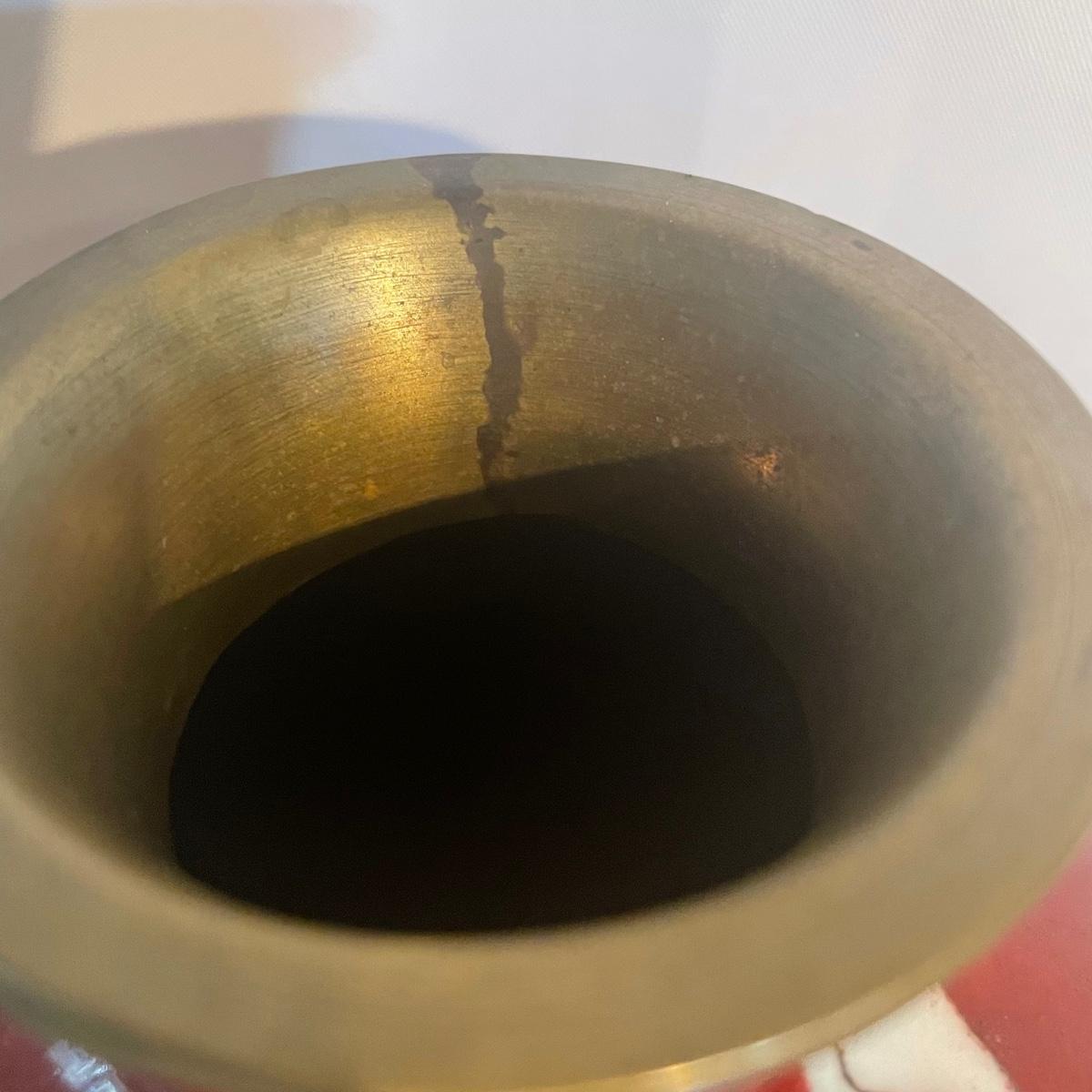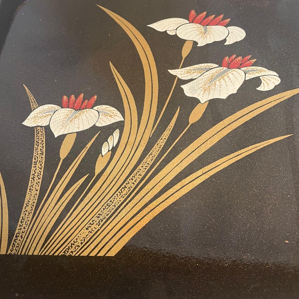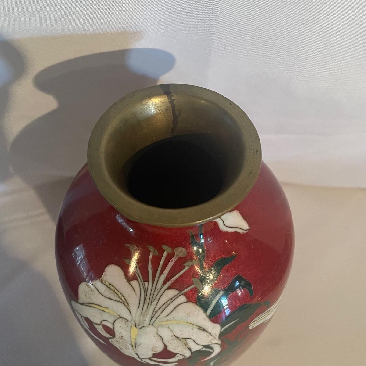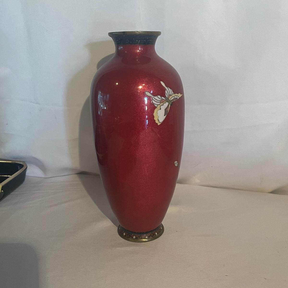This beautiful vase appears to be metal with an enamel coating; the mark on the inside rim of the neck is where the aged gold paint has worn away slightly. It’s paired with two attractive melamine like trays with floral designs.