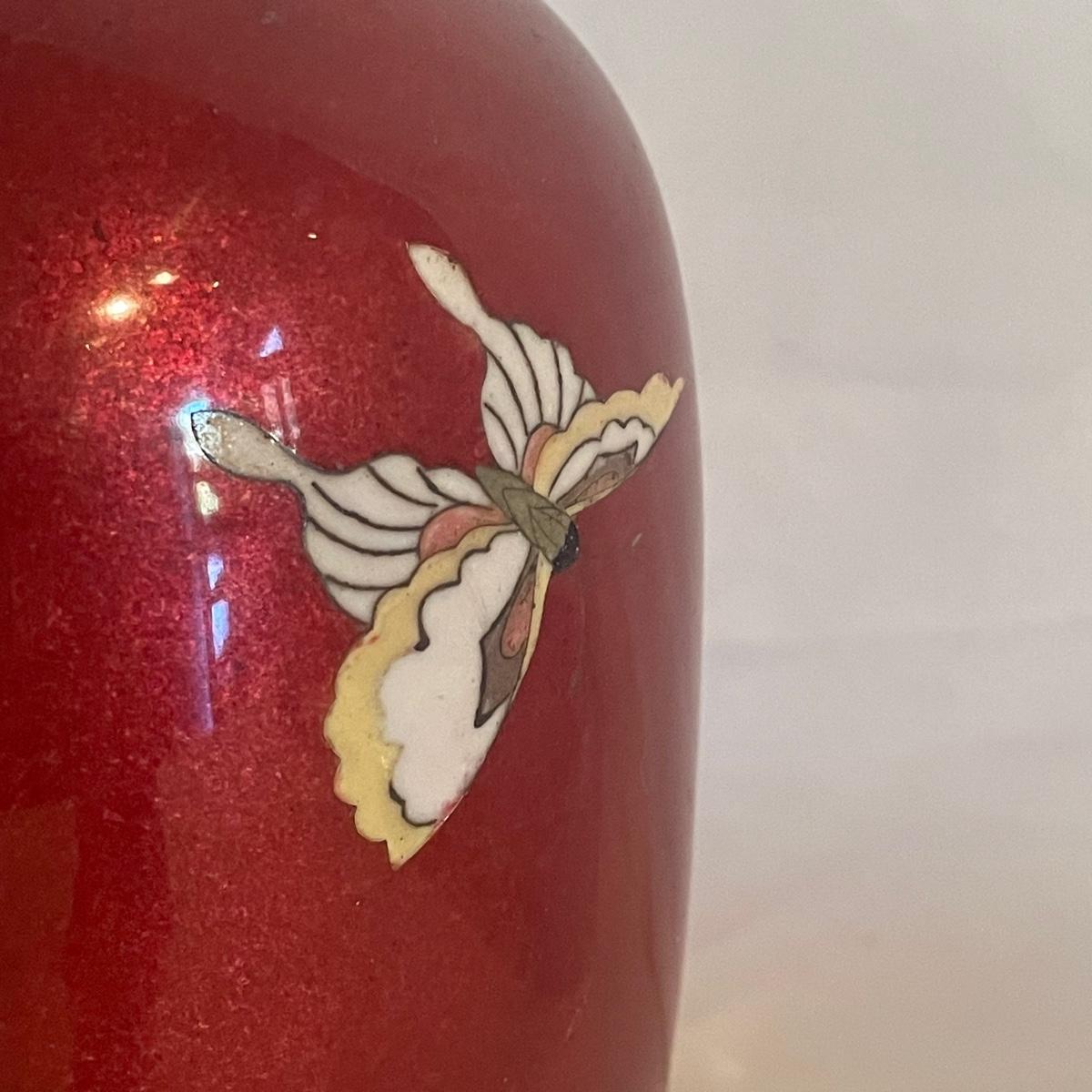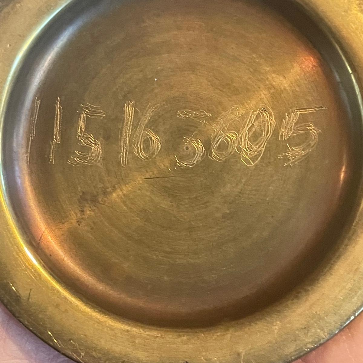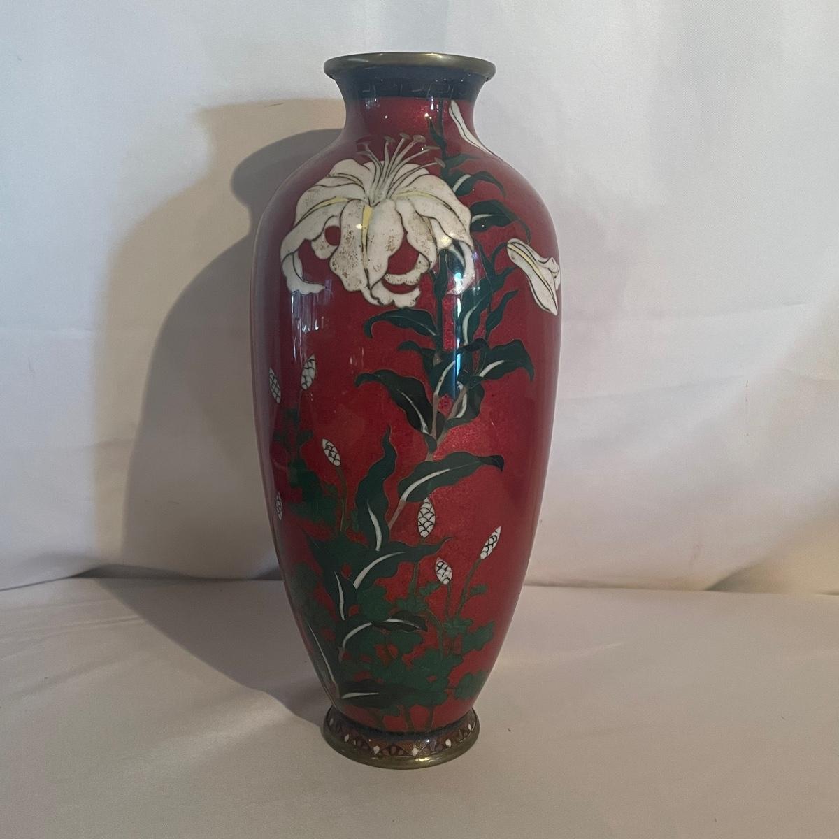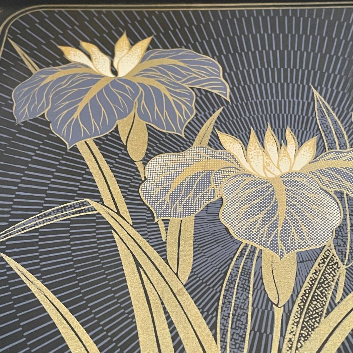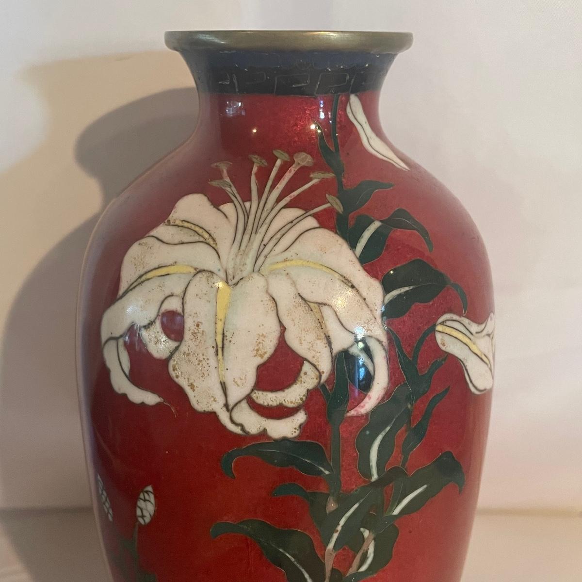 This beautiful vase appears to be metal with an enamel coating; the mark on the inside rim of the neck is where the aged gold paint has worn away slightly. It’s paired with two attractive melamine like trays with floral designs.