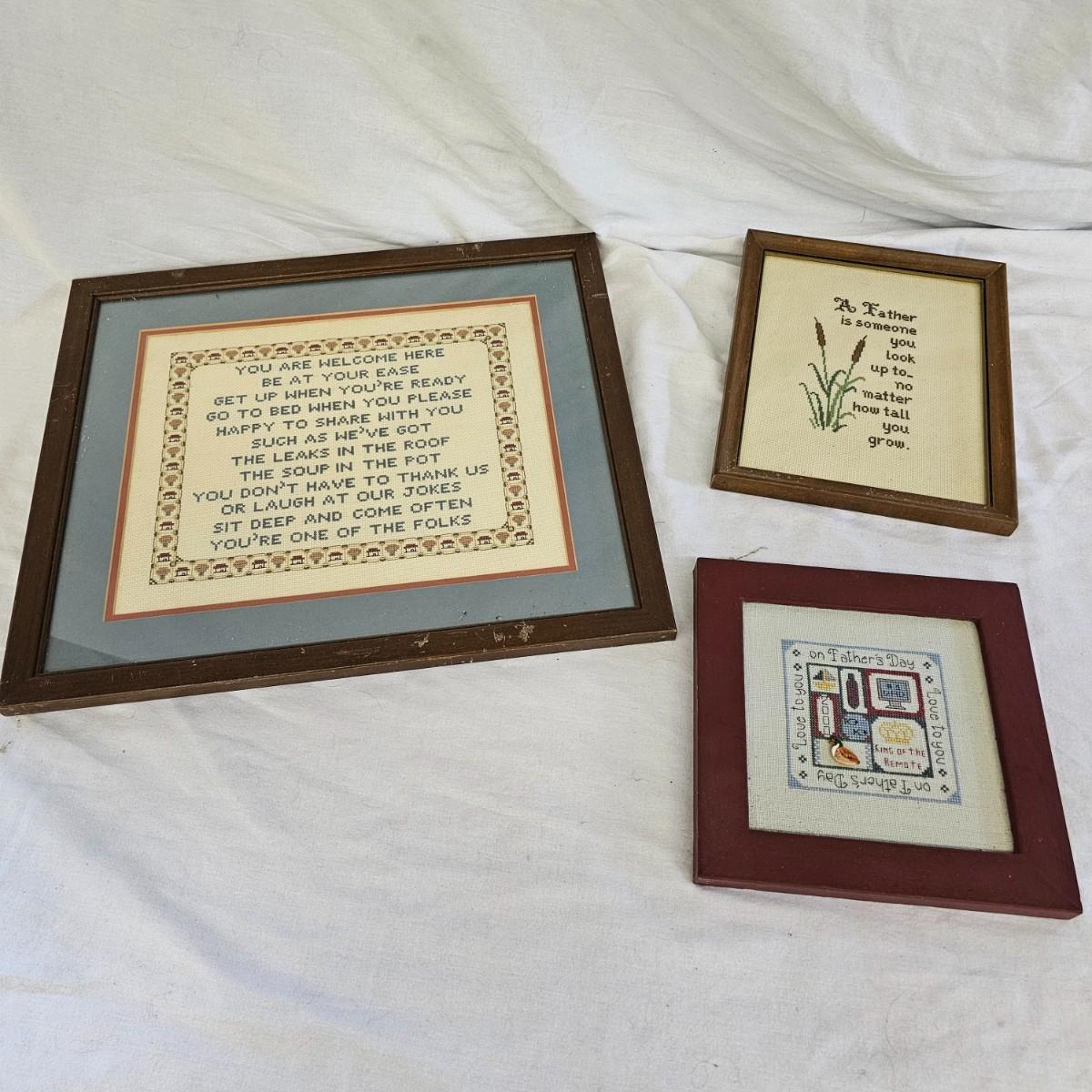 Three pieces of needlepoint art in frames. Largest piece is 19" x 16.5". Some blemishes on frame edges. Middle size is 9" x 11". Small red piece is 9.25" sq, has 3D effect with duck sewn on front. See photos for details. Shipping available. Shipping art can be costly. We suggest contacting our preferred local shipping provider, Postage Express, with dimensions and getting an estimate before bidding: (828) 670-5501 or postageexpress@yahoo.com.