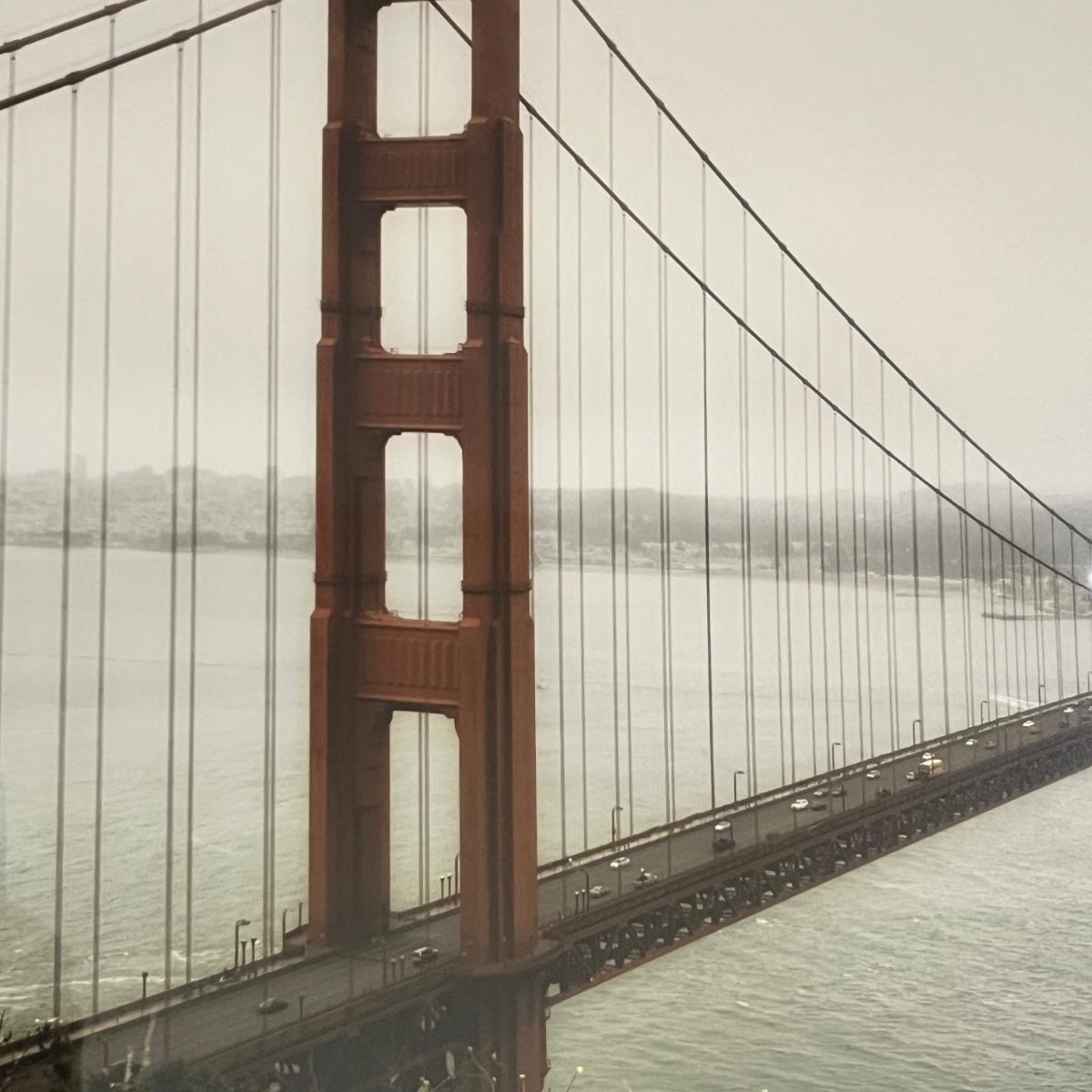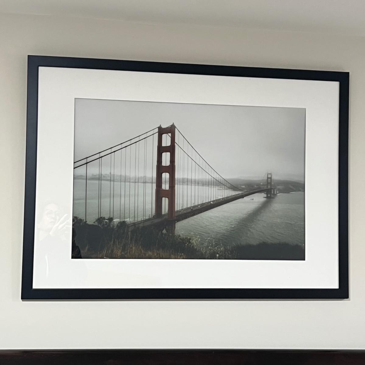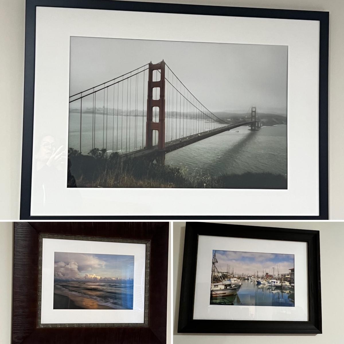 Largest frame is the photograph of the Golden Gate Bridge, it measures 41” x 30”H.
