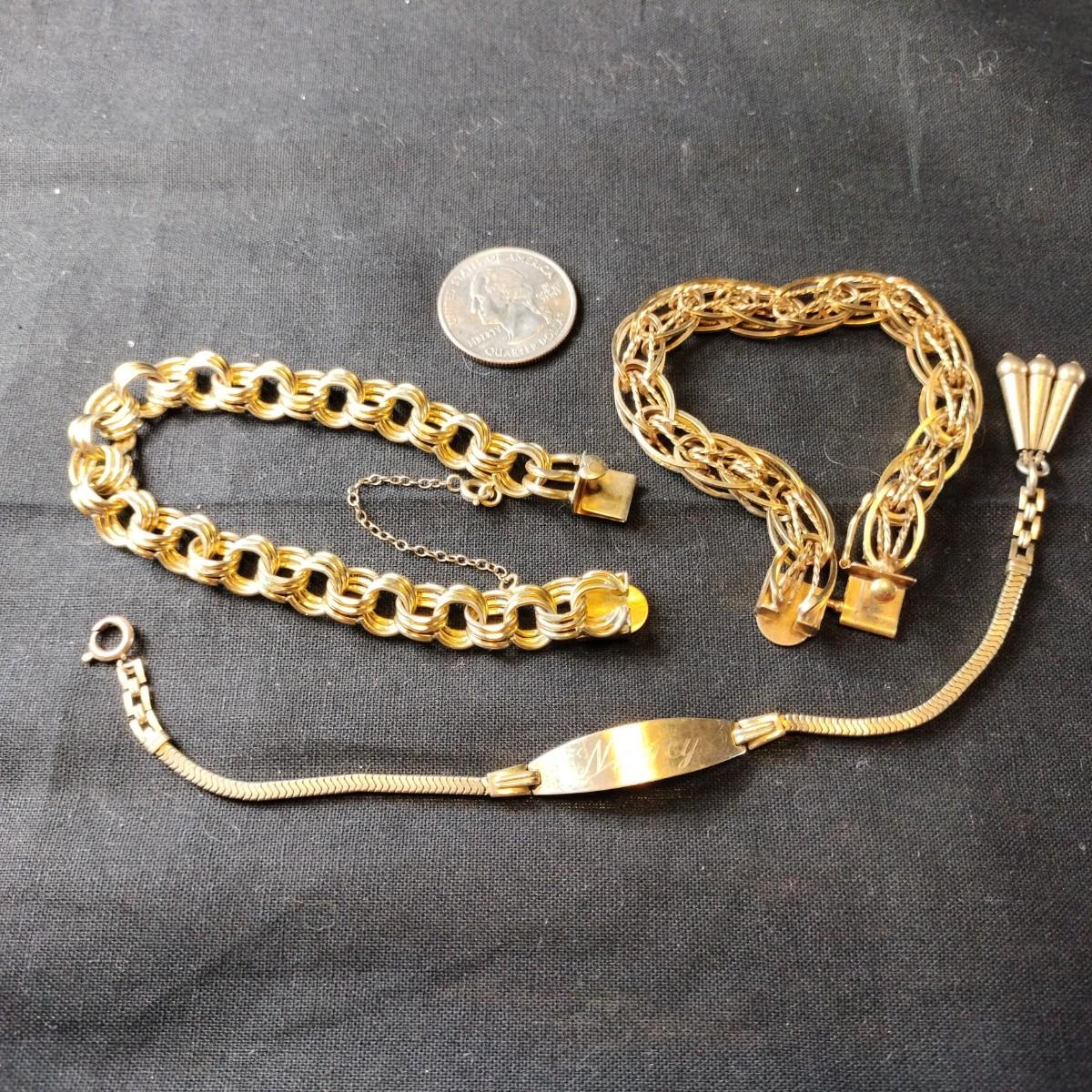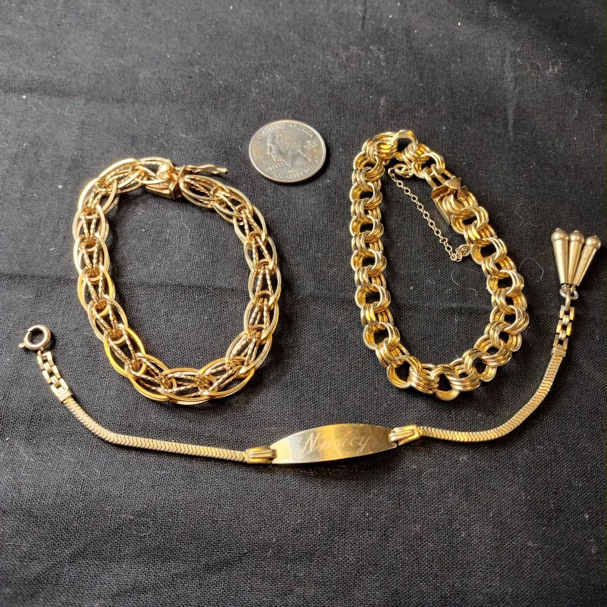 This auction lot is for a Trio of Gold-Filled Bracelets. All the bracelets are marked as 1/20 12K Gold-Filled. They each measure about 8-inches long and are in very good condition. One of the bracelets is an ID bracelet engraved with the name "Nancy" on the front and engraved "Bill" on the back.